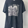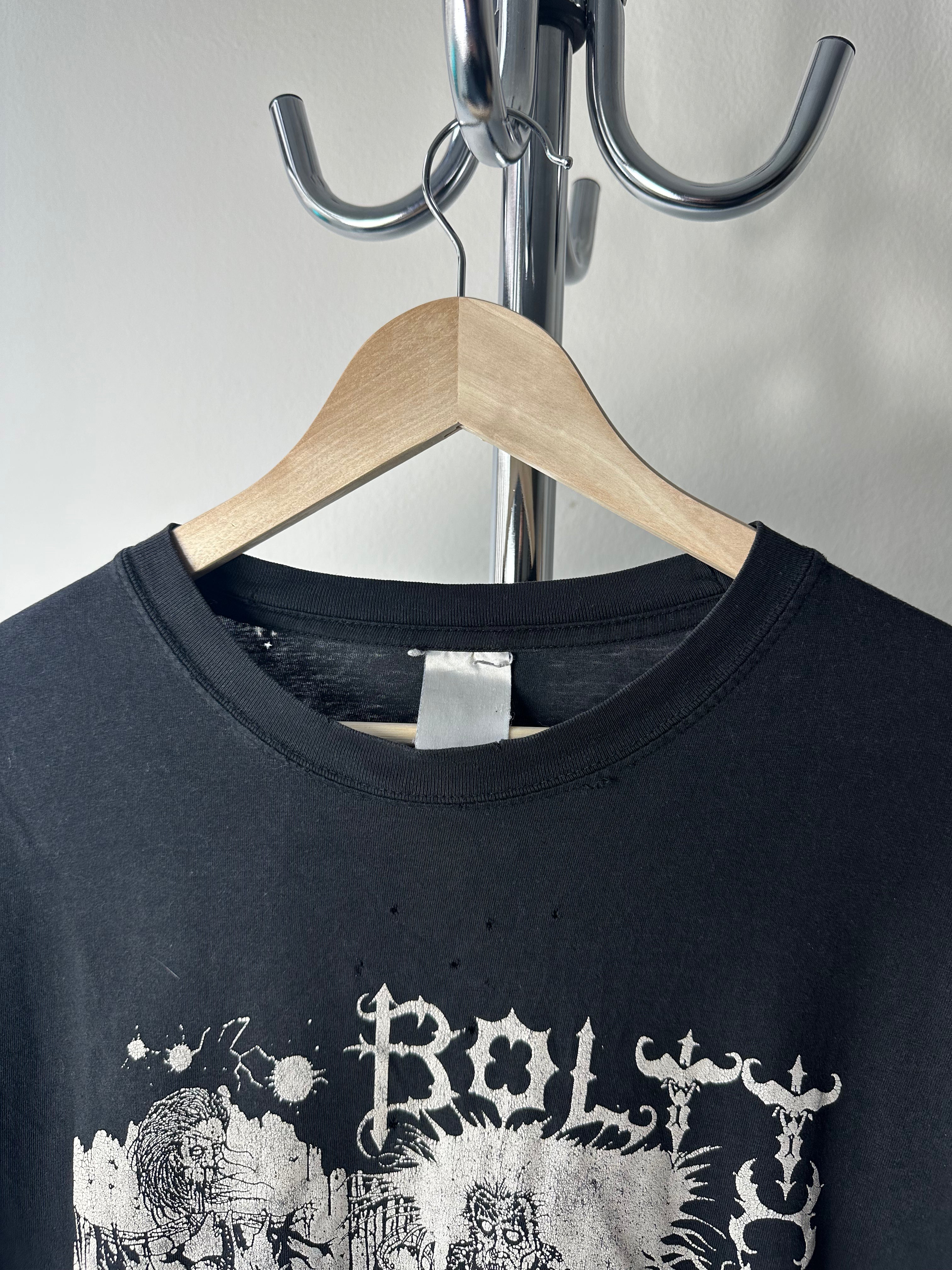 True vintage Bolt Thrower shirt with full-frontal chaos and a back hit quoting “In Battle There Is No Law.” The shirt has clearly lived – the graphic is wonderfully cracked and faded, the black fabric softened and worn to a deep charcoal with lighter washes bleeding through. Several small holes and one larger distressed area near the hem add to the raw, thrashed beauty of this piece. A heavy hitter for collectors and anyone who understands that decay can be a form of devotion.