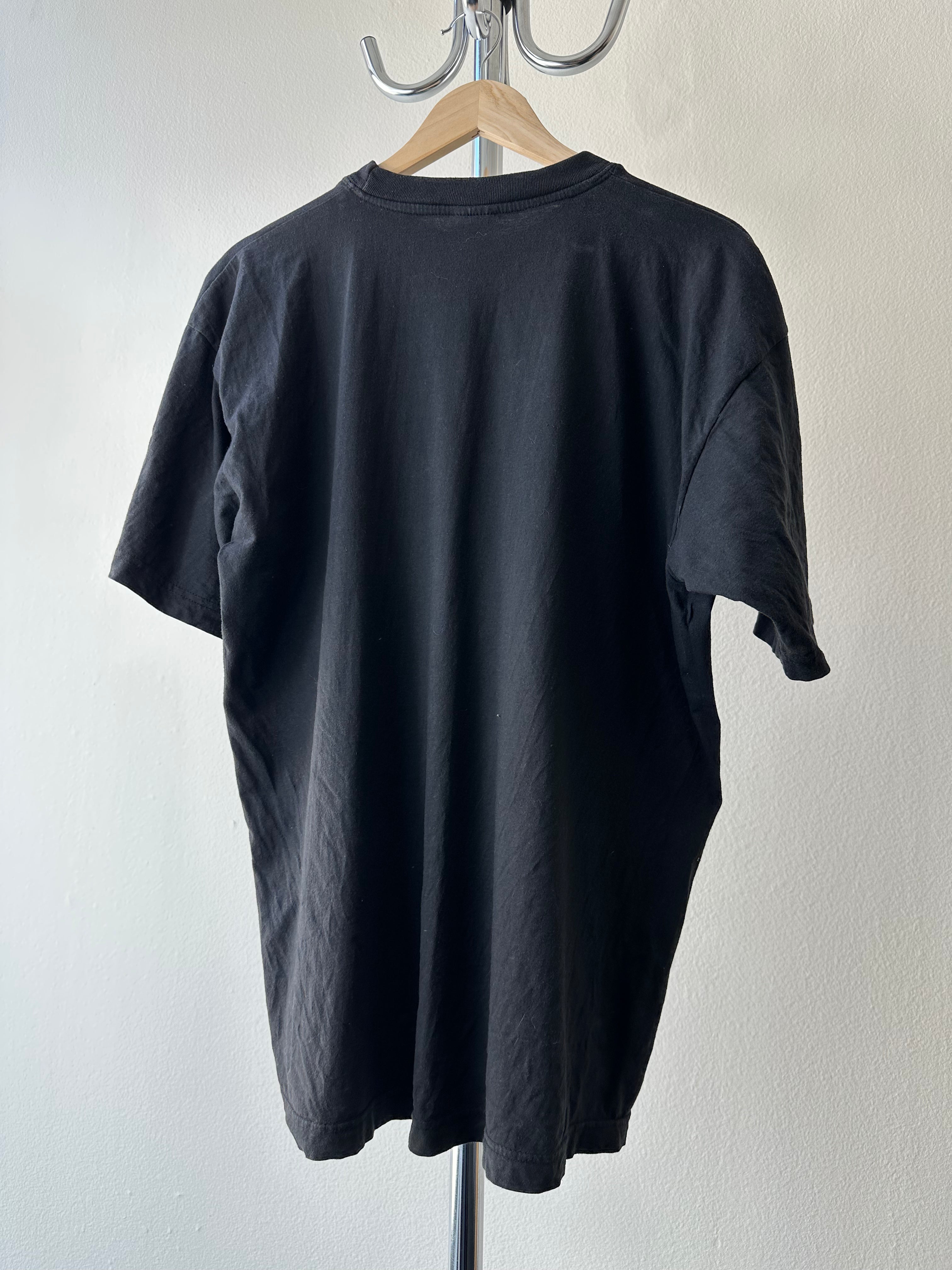 Soft black cotton with a boxy, early-2000s fit. Graphic is cracked but fully legible. Some fade, no holes. Tag is faded beyond recognition, but fits like a roomy XL.