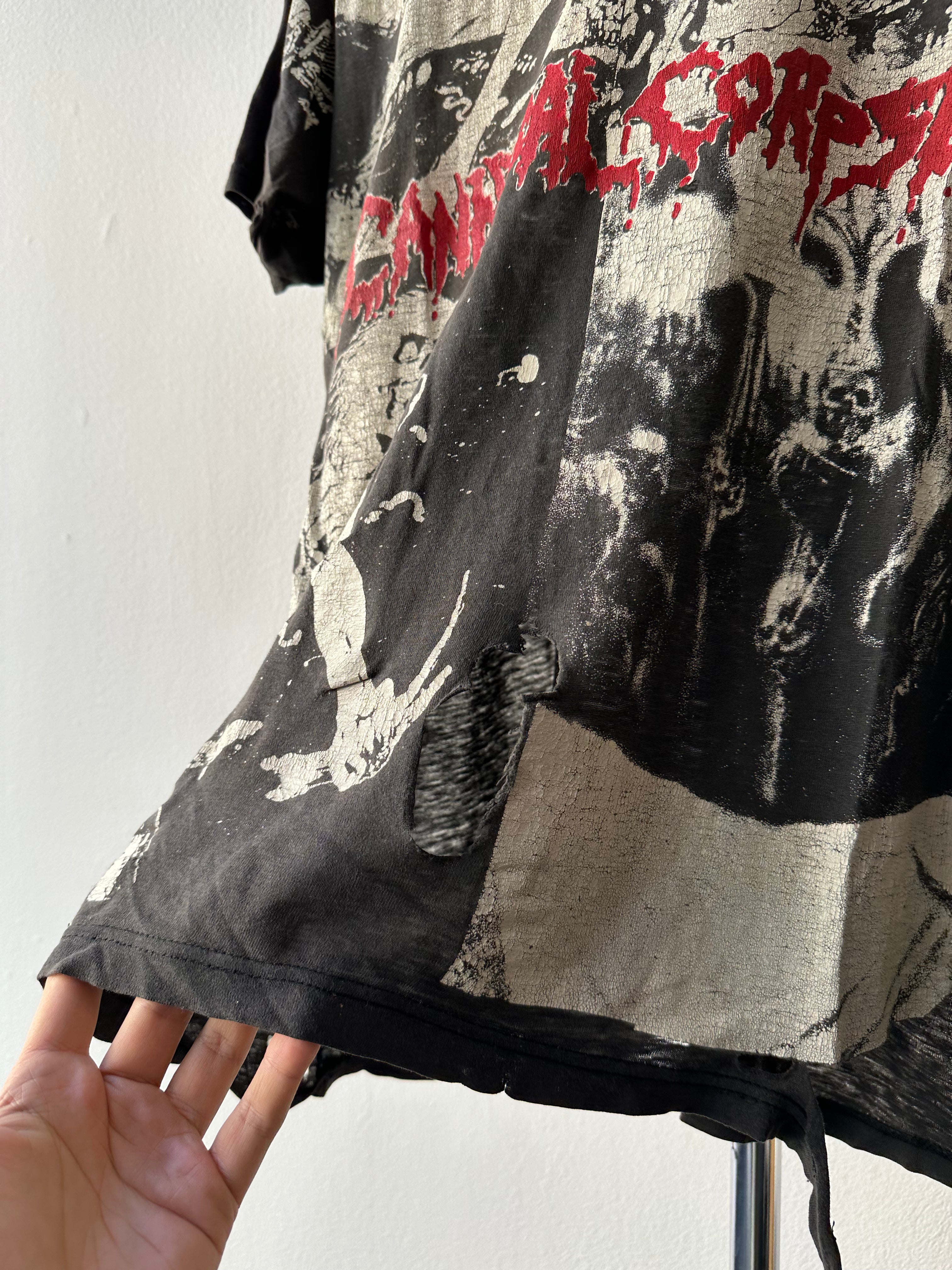 This original 1993 Cannibal Corpse all-over print tee is a rare gem for death metal enthusiasts. Featuring the band's iconic graphic spread across the entire shirt, it captures the raw energy and aesthetic of early '90s death metal.