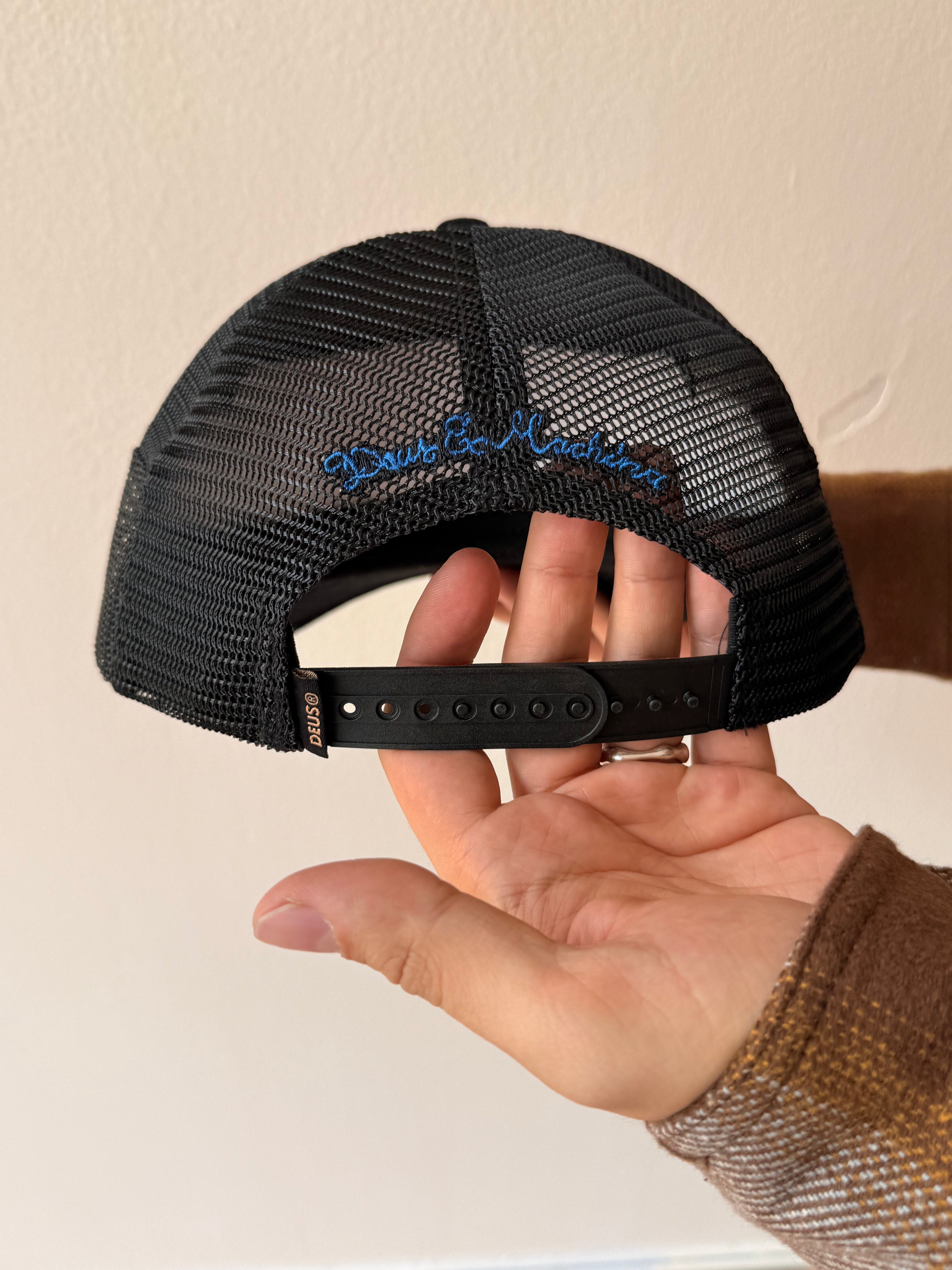 A classic pinch-front trucker hat elevated in cotton corduroy. Featuring a padded front panel and visor, it carries embroidered artwork at the front — a nod to Deus Ex Machina’s blend of utility and graphic identity.