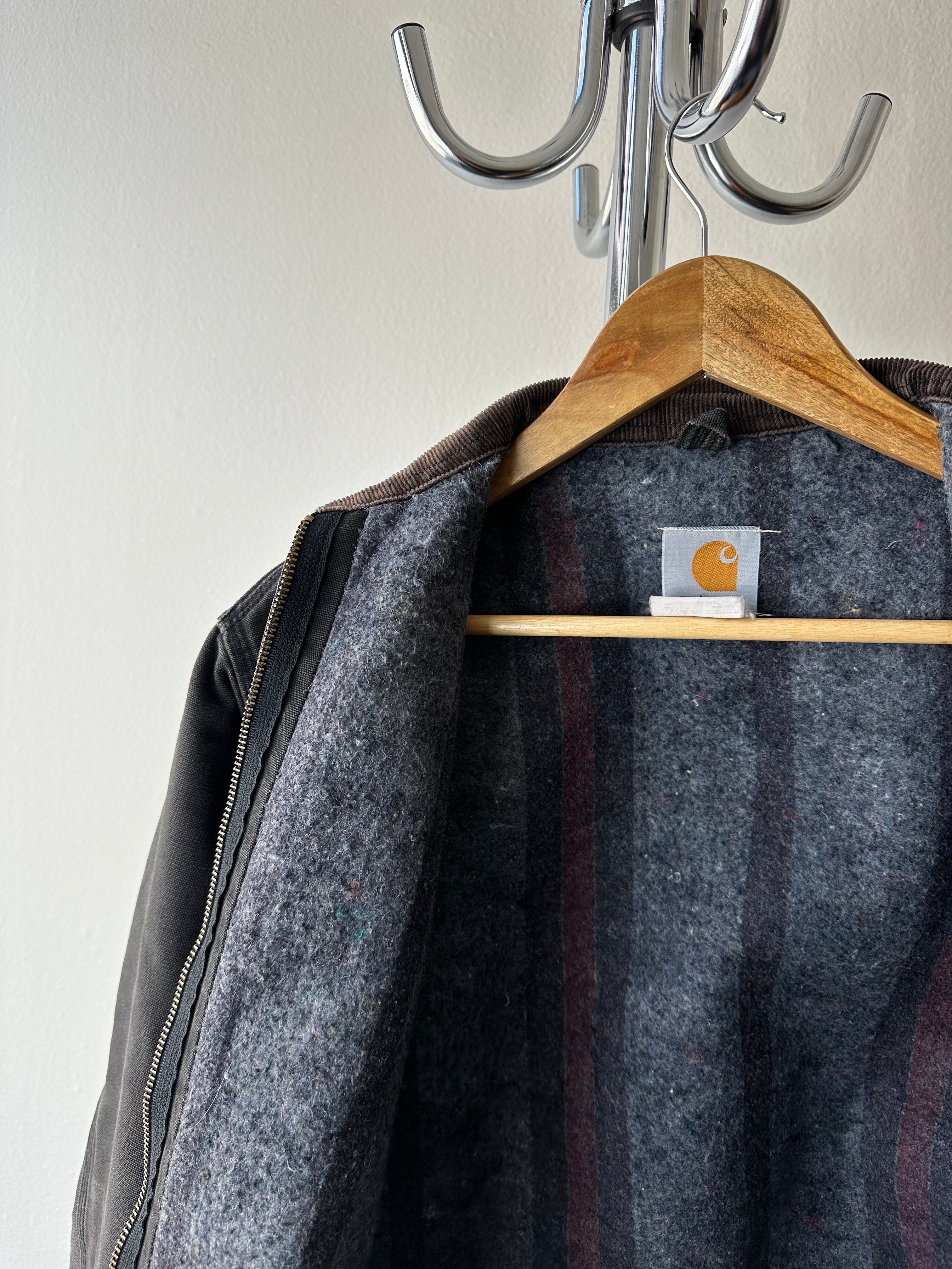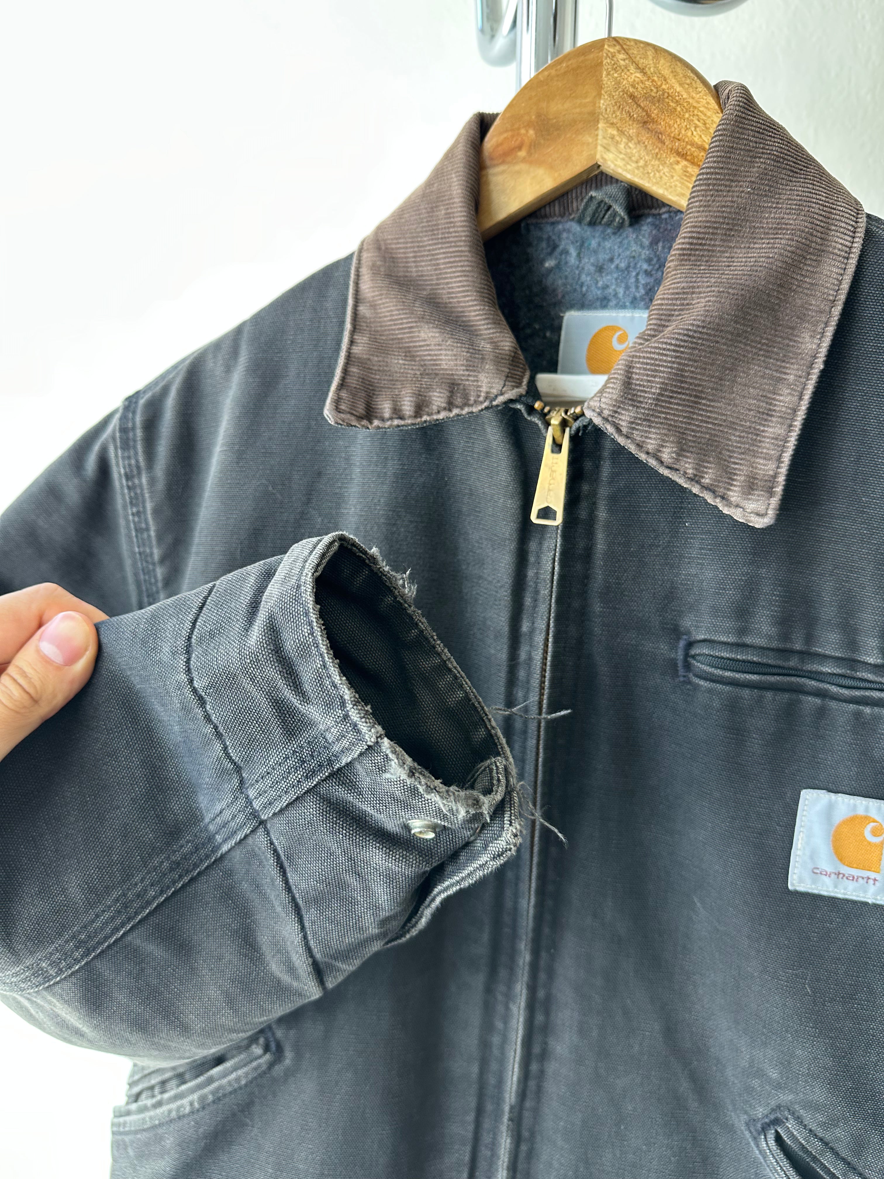 True American workwear — this is an original Carhartt J97 Detroit Jacket, made in the USA in the 1990s. Crafted from heavyweight duck canvas with a warm blanket lining and iconic brown corduroy collar. The black outer has faded into a beautiful charcoal tone over time, with just the right amount of wear. Every detail — the brass zipper, triple-stitched seams, and classic cut — speaks to its era and durability.