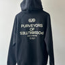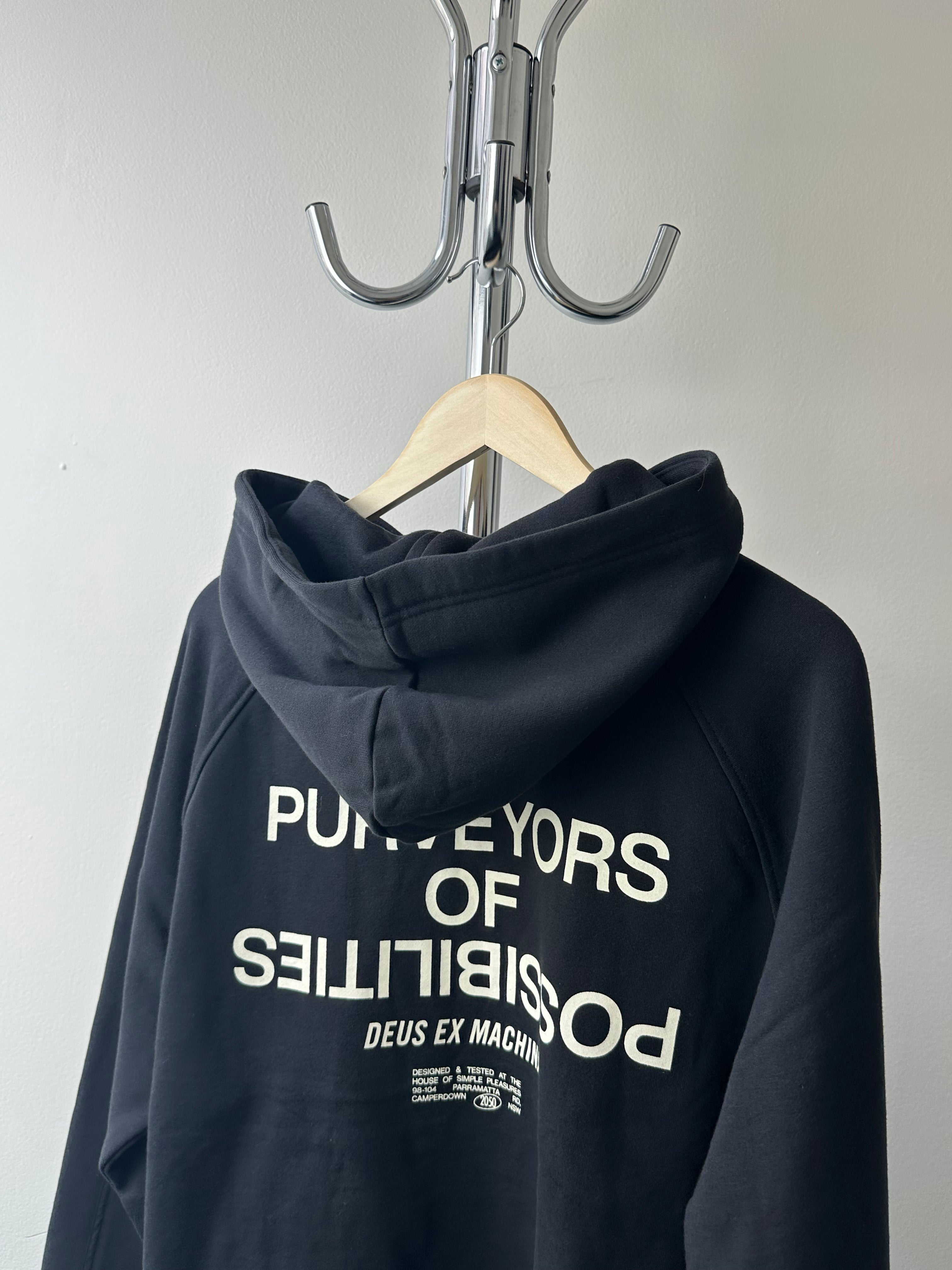 The design features nylon ripstop sleeve panels, graphic art at chest and back (spelling “Purveyors of Possibility”), and classic hooded construction. A piece that balances streetwear ease with functional accents.