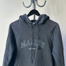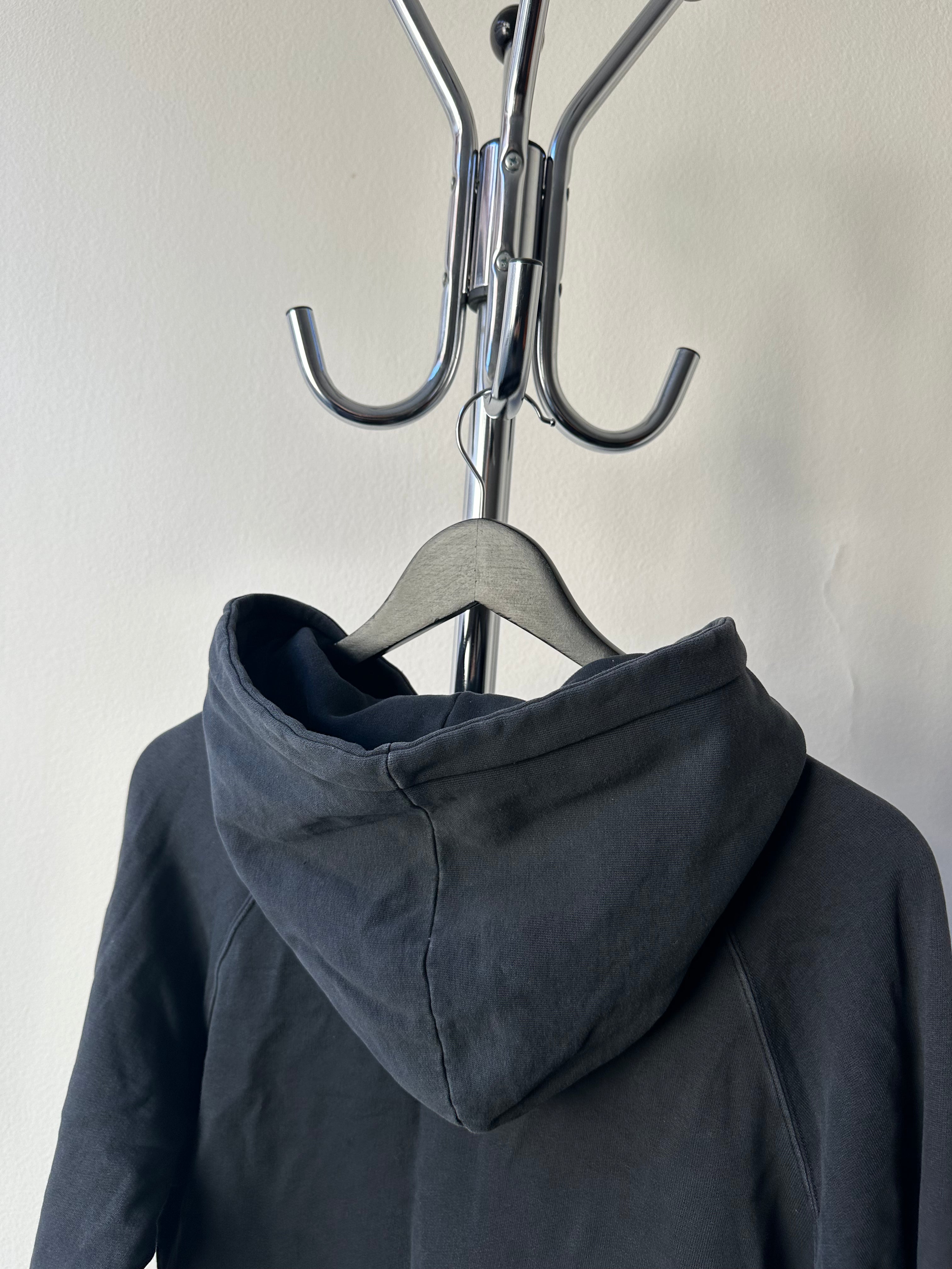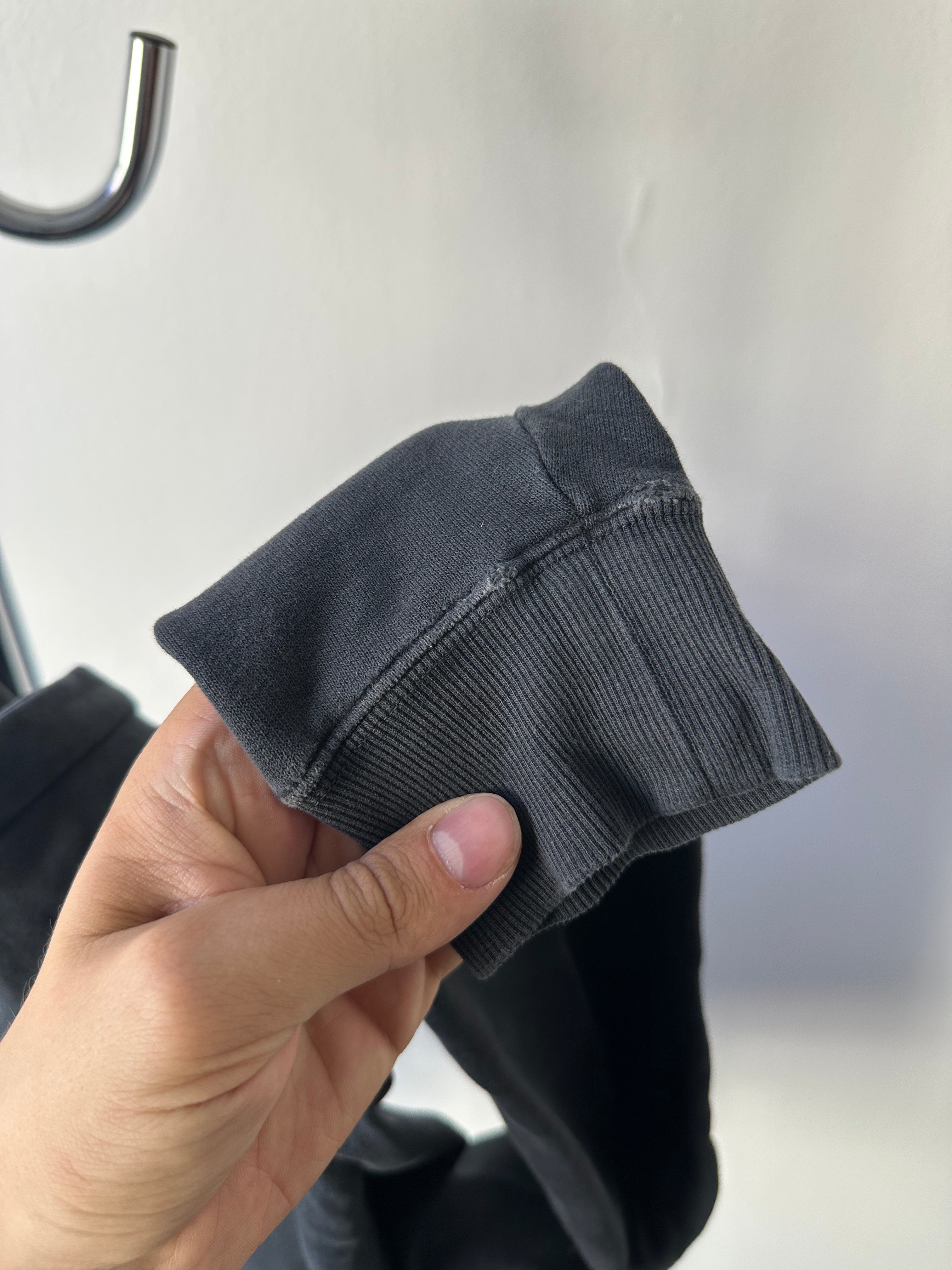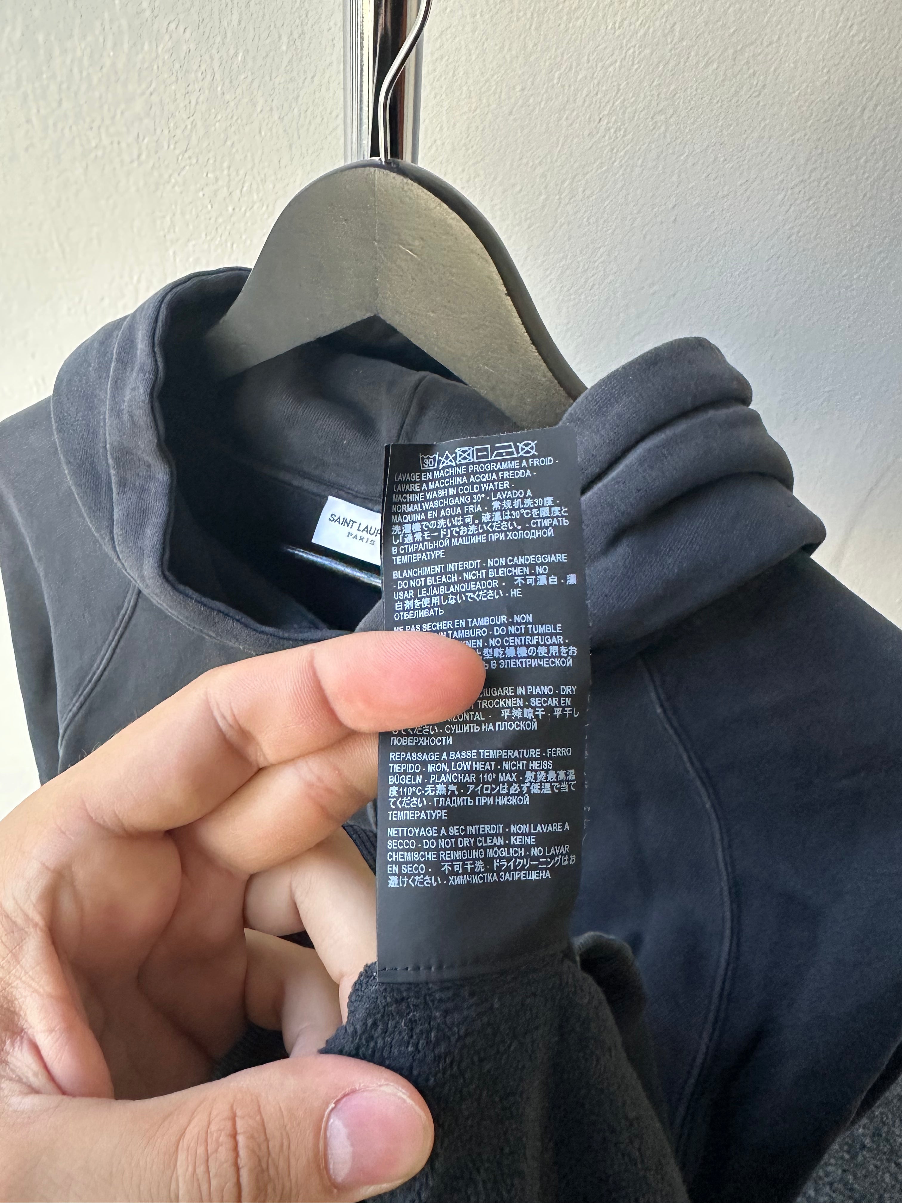 A relaxed staple elevated through Saint Laurent’s subtle irreverence. This faded black hoodie features the iconic Malibucollegiate lettering across the chest, finished with the understated "Saint Laurent" mark beneath — a contrast of nostalgia and luxury. Crafted from midweight cotton fleece with a lived-in feel, the piece has a raglan cut, long drawstrings, and a perfectly washed surface with minor distressing on the edges.