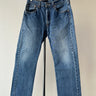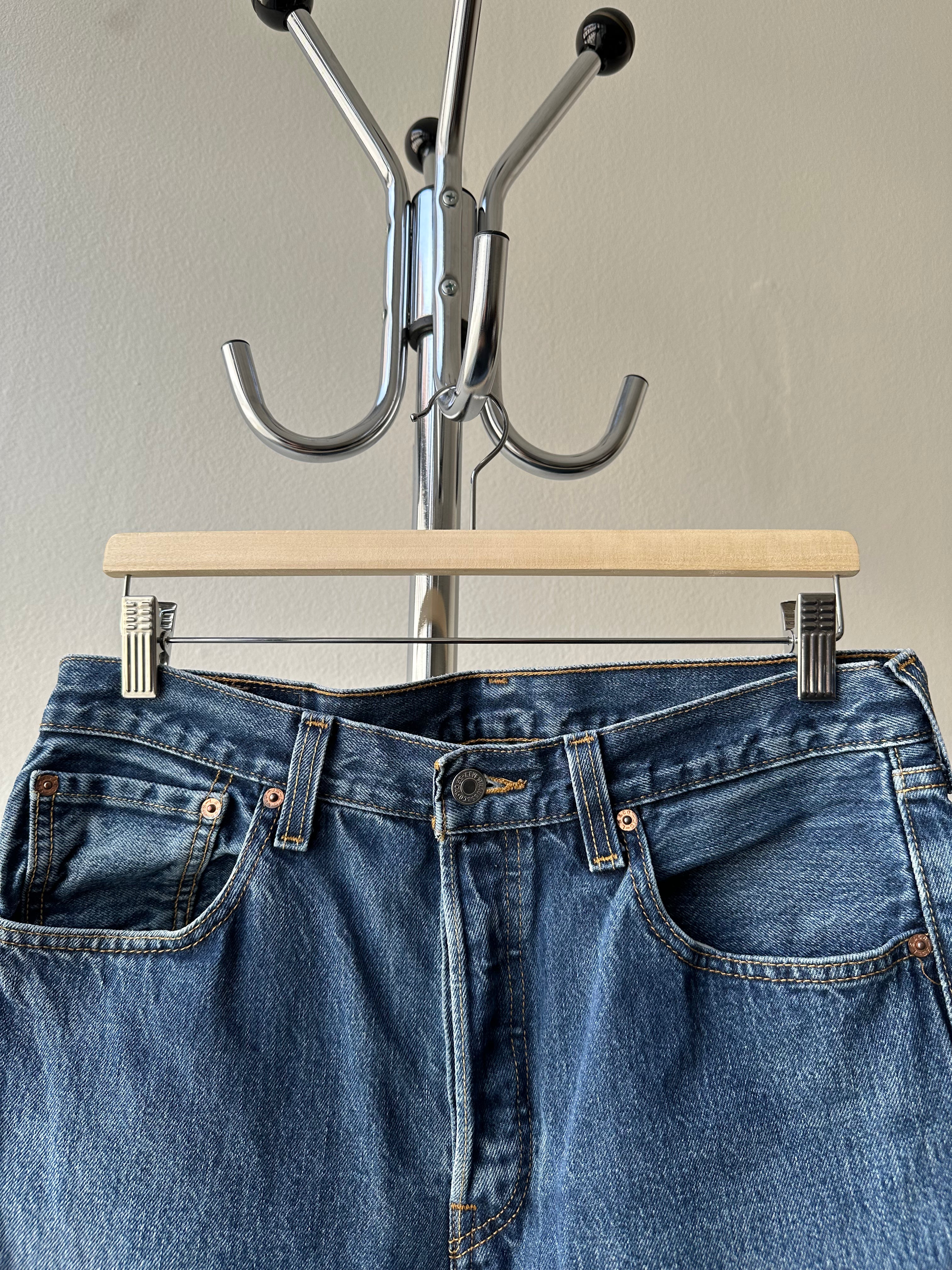 An iconic pair of Levi's 501 pants from the early 00s, featuring perfectly worn-in blue denim which has natural fading, adding to its vintage character. With a straight-leg fit, these jeans are a must-have for collectors and vintage denim lovers.
