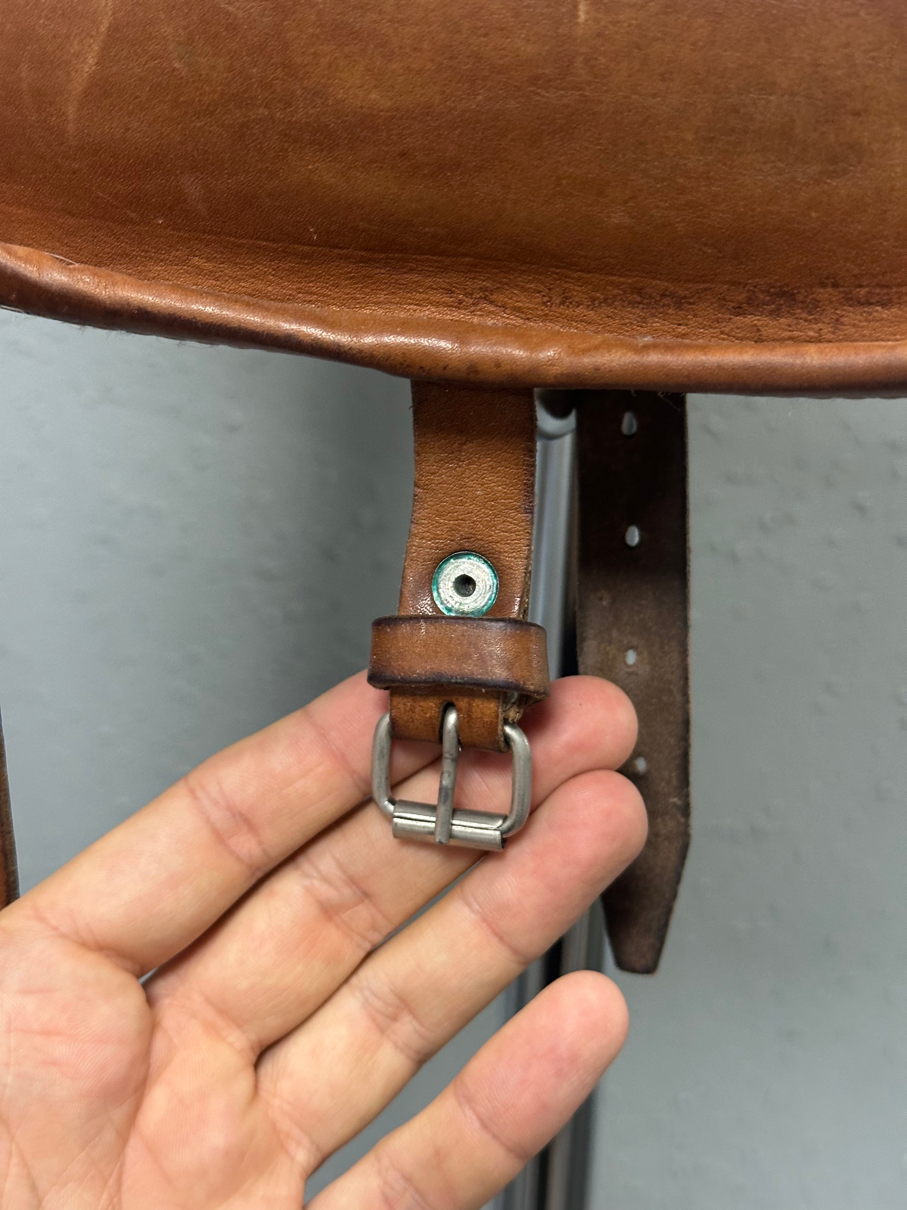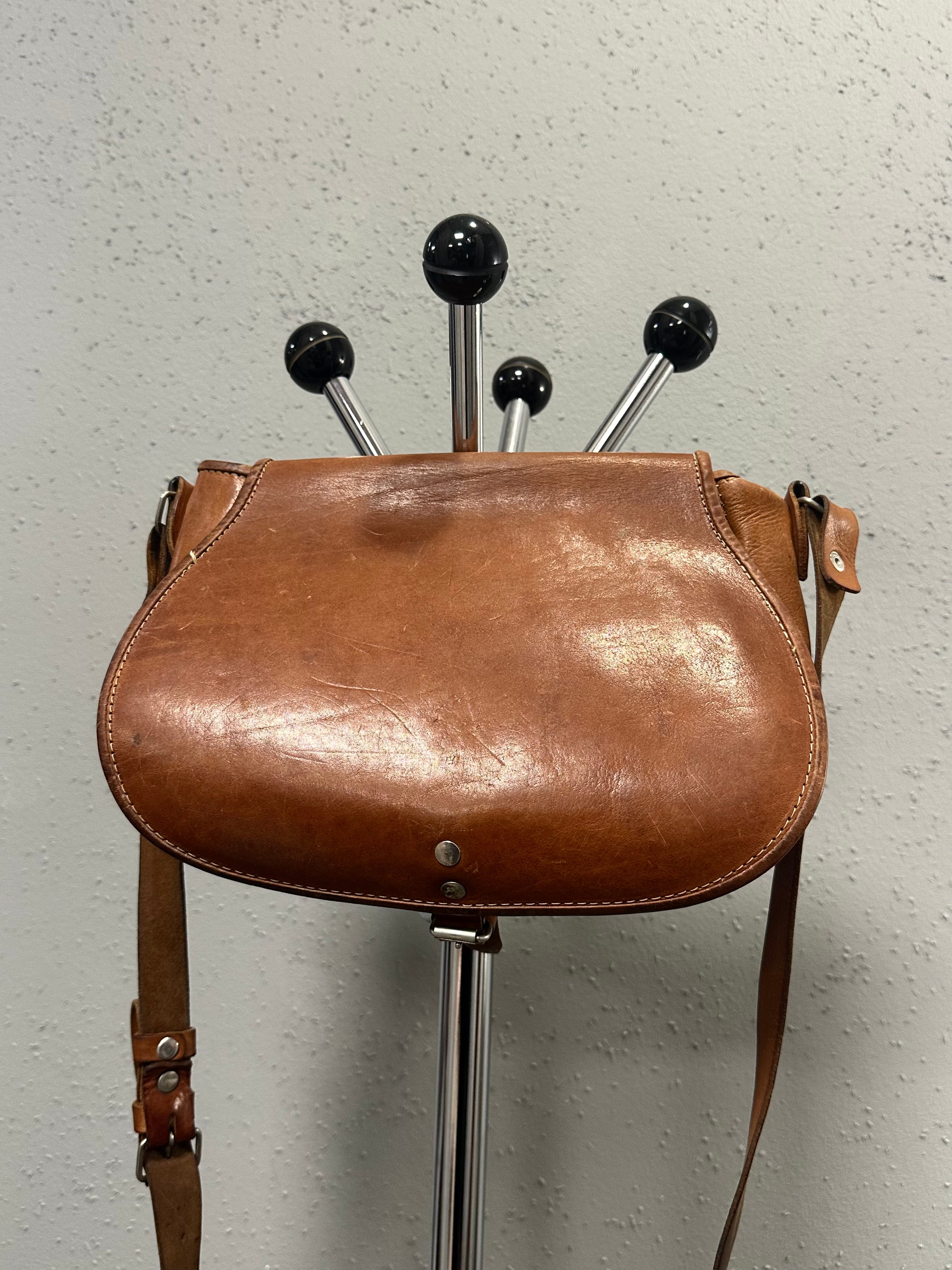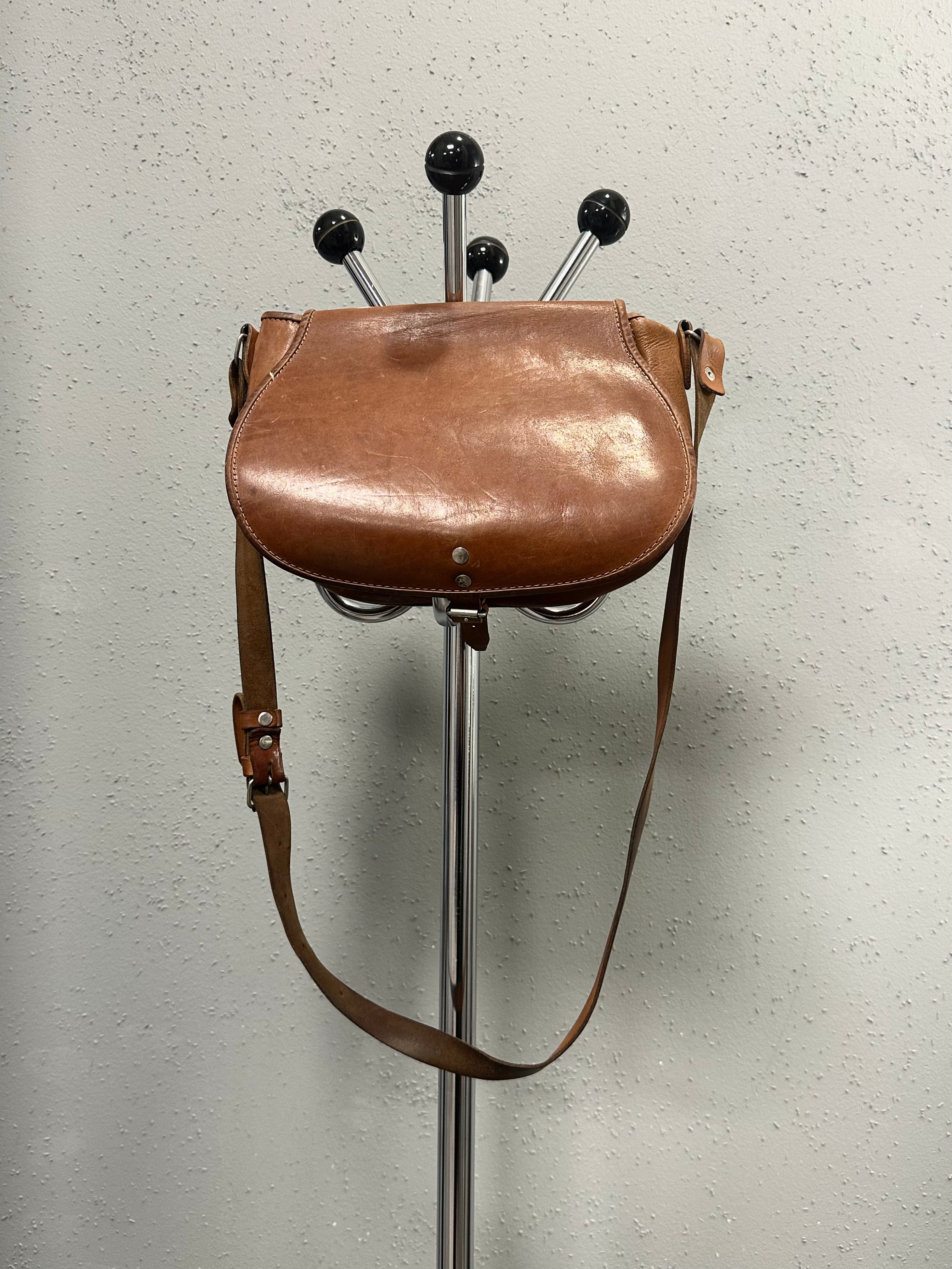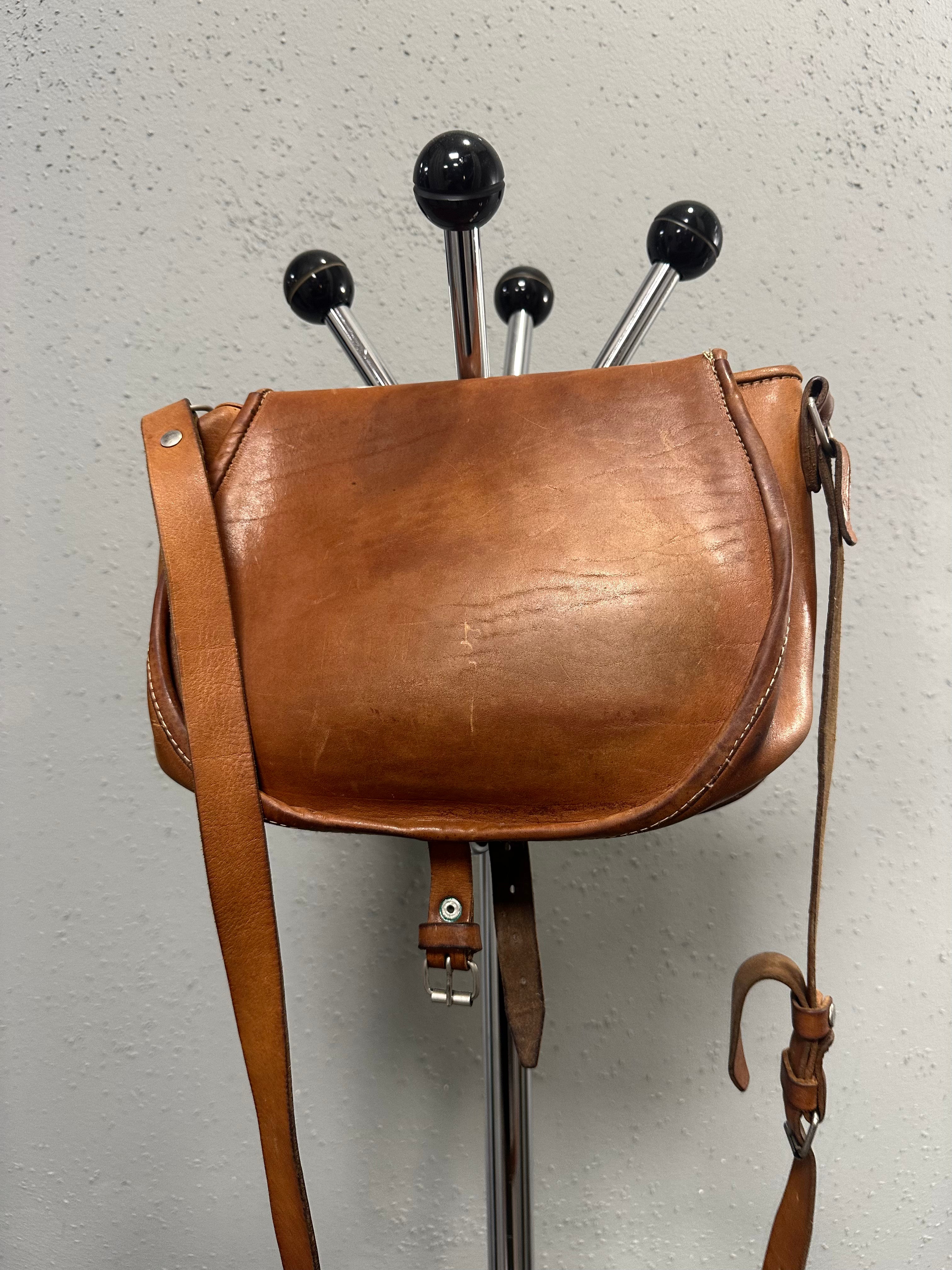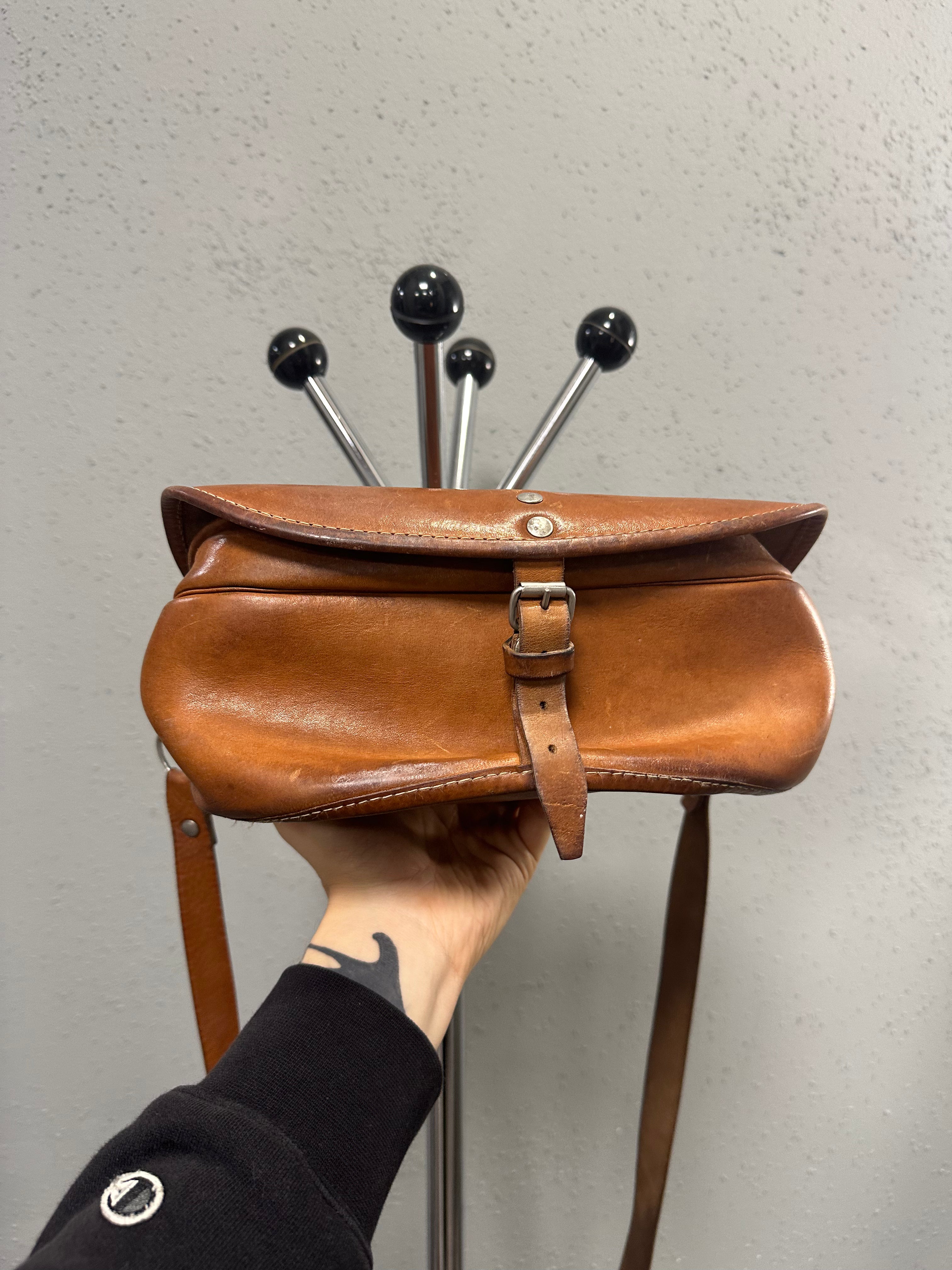 A rare mid-century leather hunting bag, likely dating to the 1950s. Built as a functional field object, not a fashion accessory — and it shows in every detail.