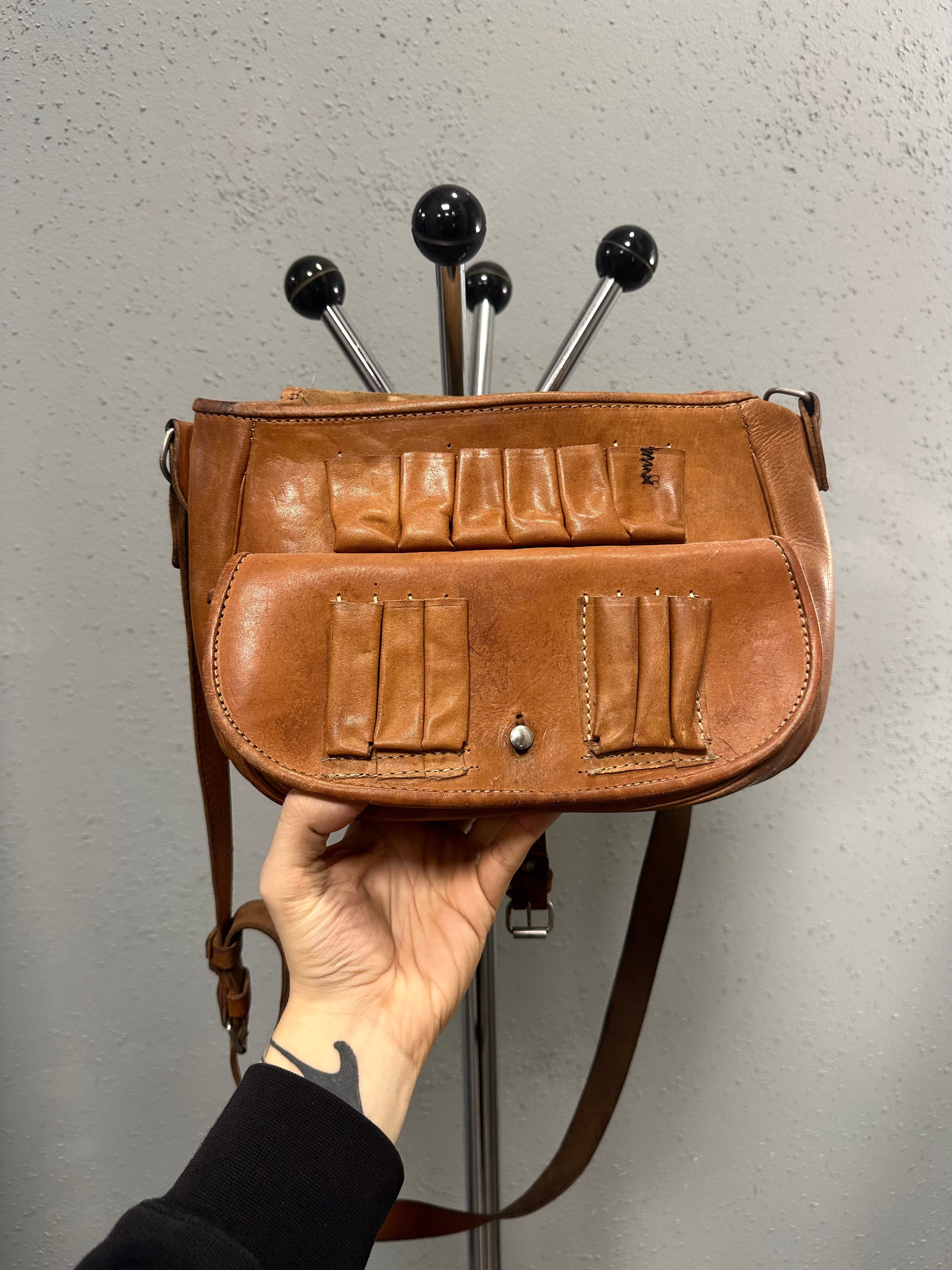 Crafted from thick, vegetable-tanned leather with a rich patina developed through decades of use. The leather has softened but remains structurally solid, carrying visible marks, creases, and tonal variation that speak to age rather than wear. The interior features multiple stitched compartments originally intended for cartridges or tools, now functioning as practical organization for everyday carry.