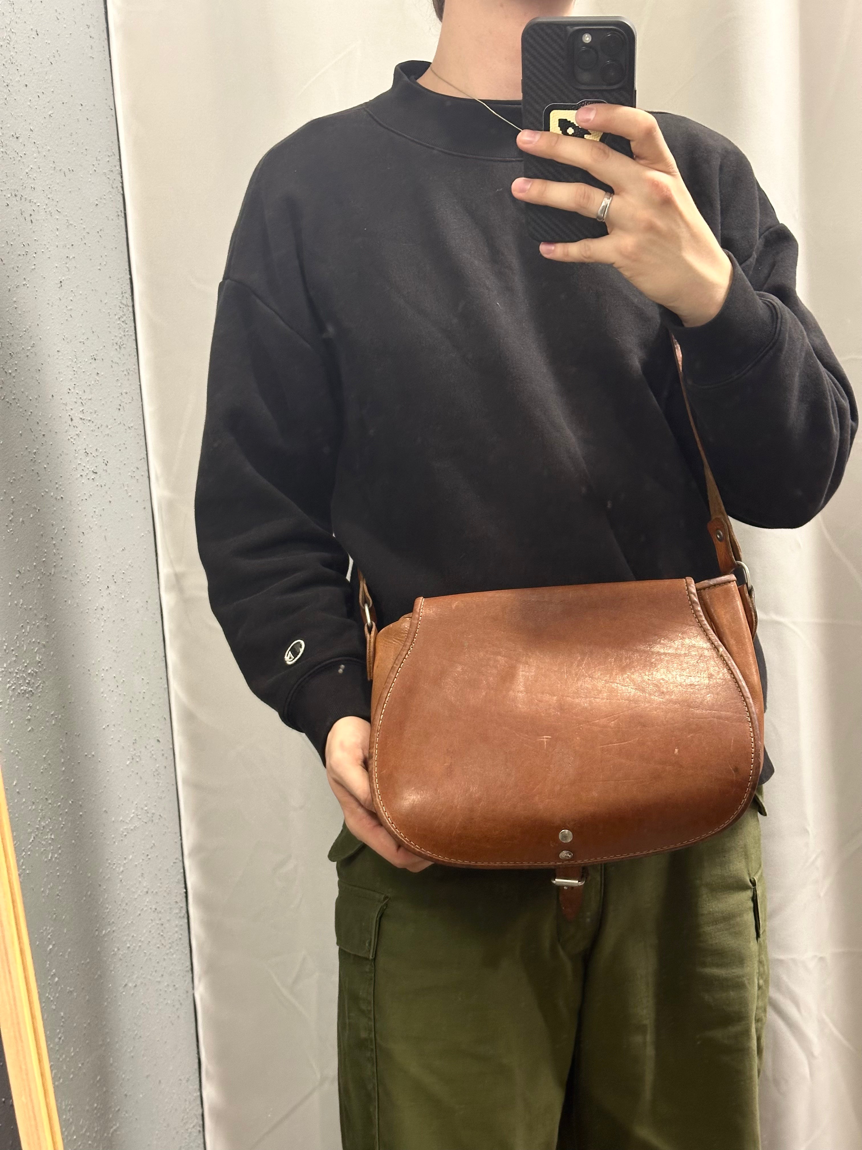 The silhouette is compact yet substantial, with a long adjustable shoulder strap that allows for crossbody or shoulder wear. Worn today, it reads less as “vintage” and more as something timeless — utilitarian, honest, and quietly expressive.