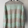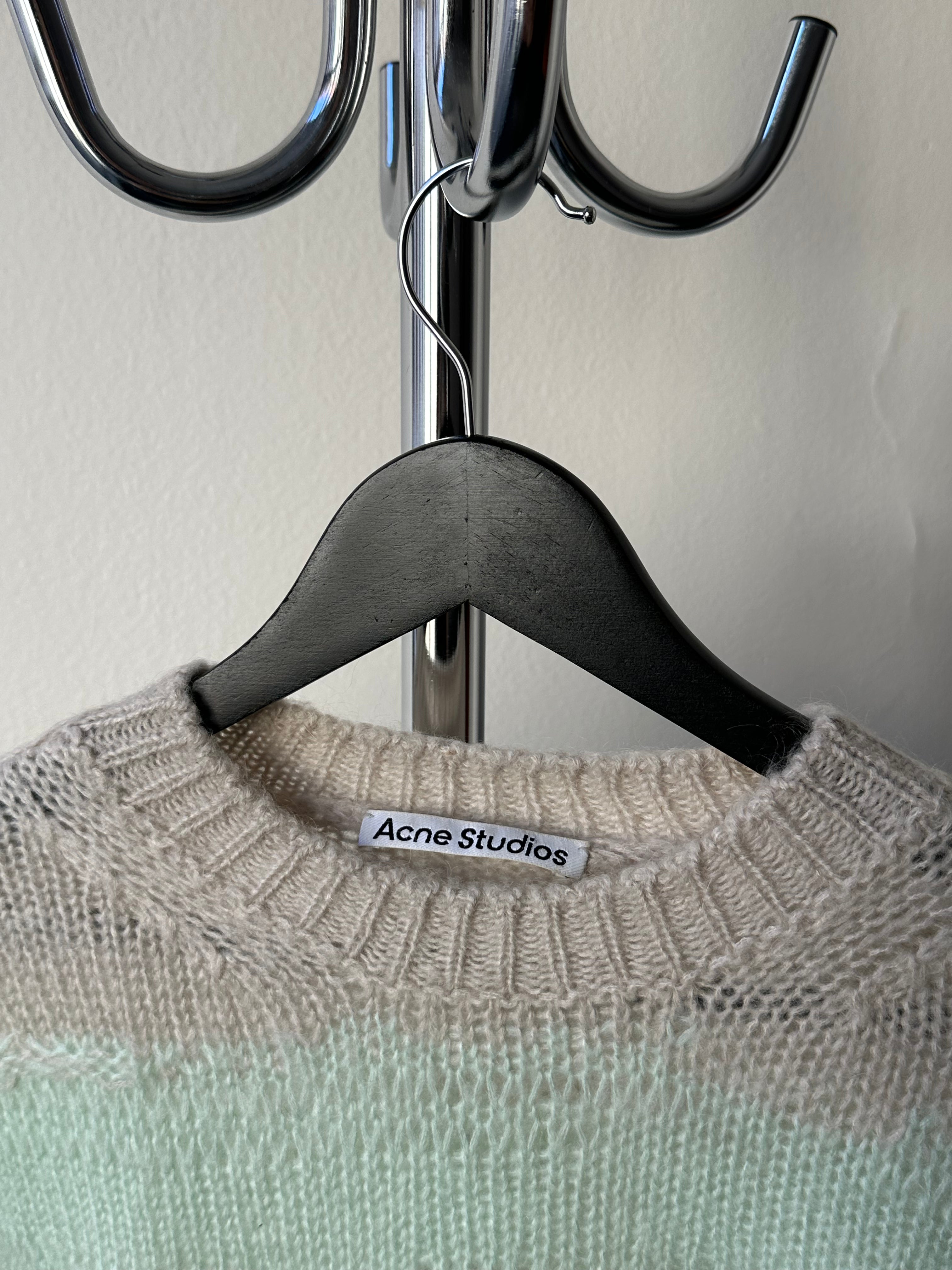 Grunge gone ethereal. This Acne Studios oversized knit offers a gentler twist on deconstructed knitwear — rendered in wide stripes of pale mint and warm taupe, it balances softness with subversion. Raw hems, frayed threads, and loose weave give it that signature destroyed texture — equal parts Cobain-era thrift and Scandinavian minimalism.