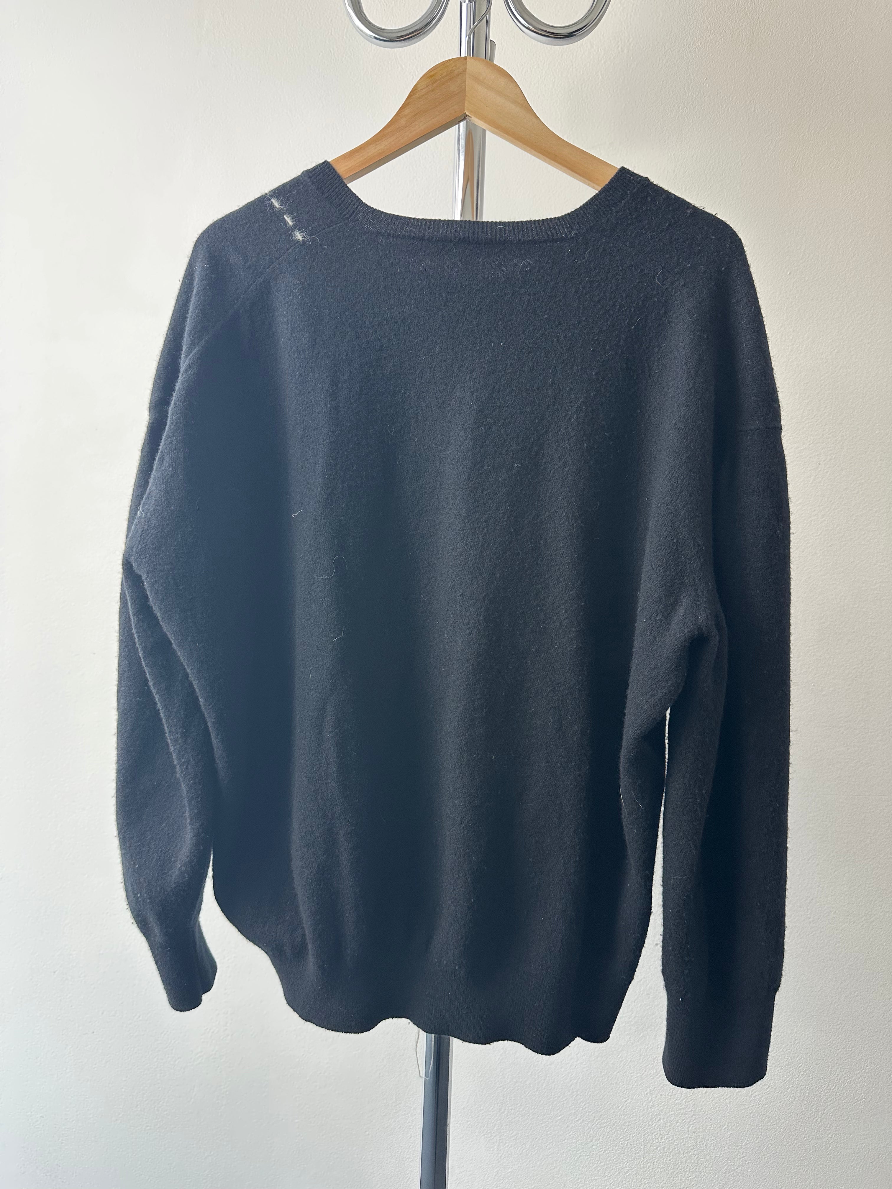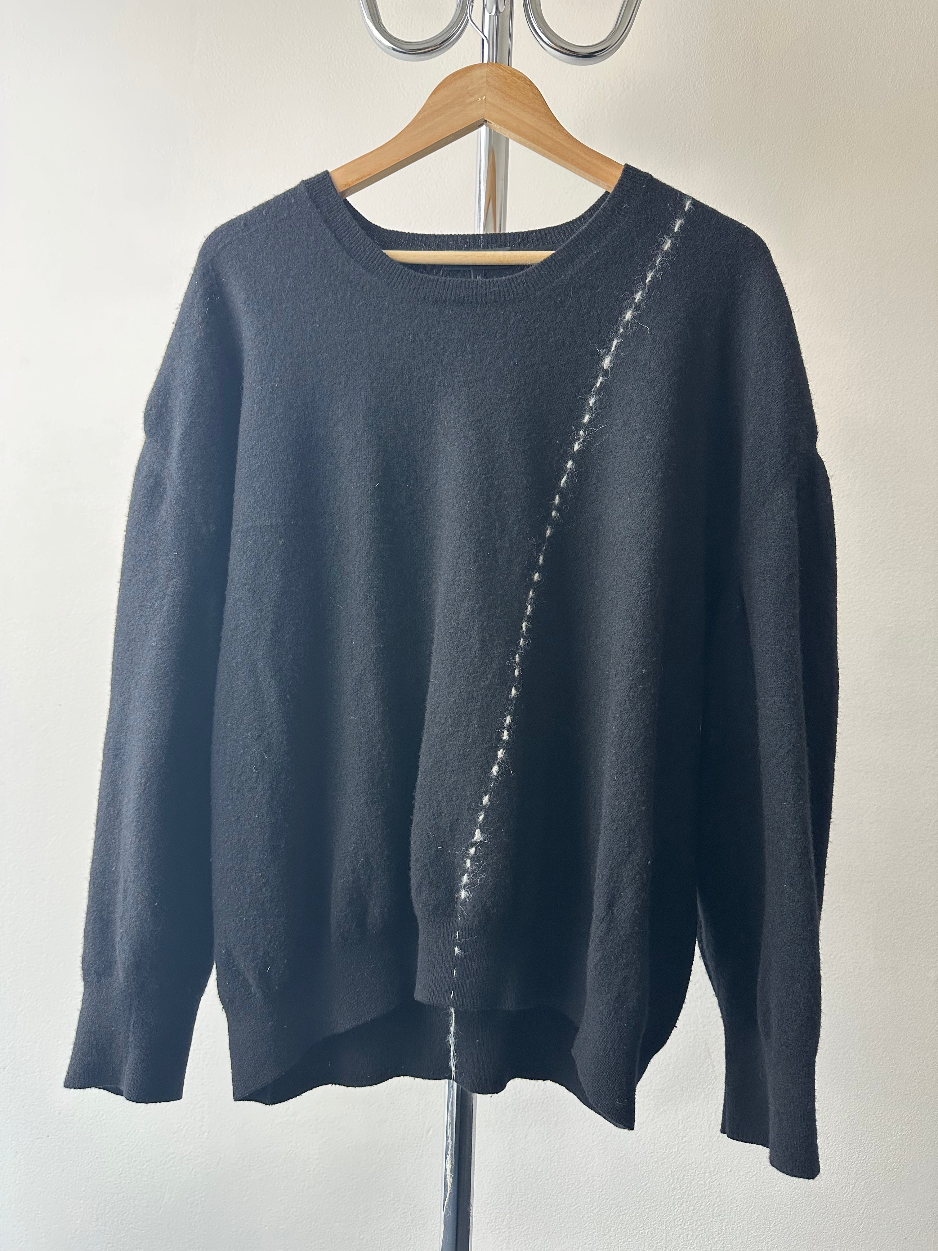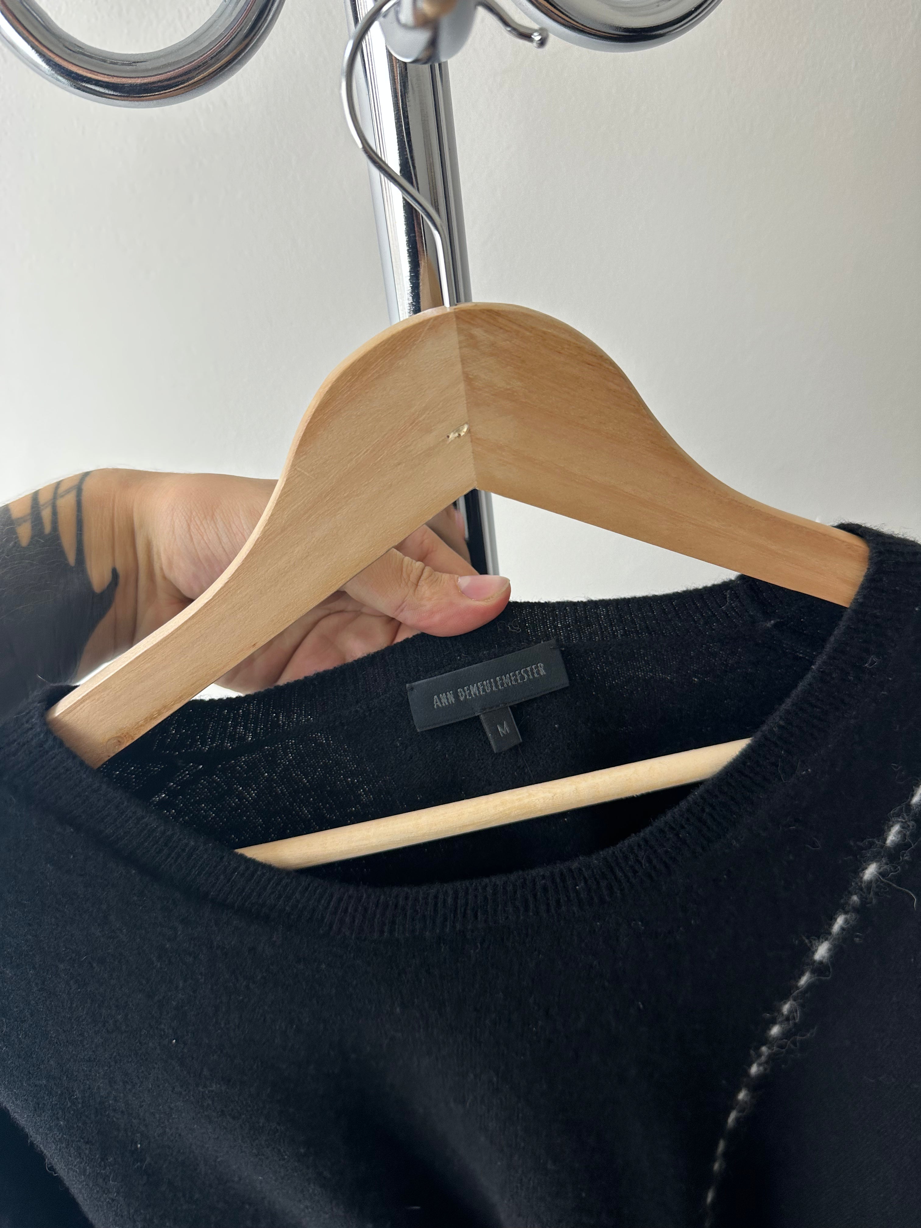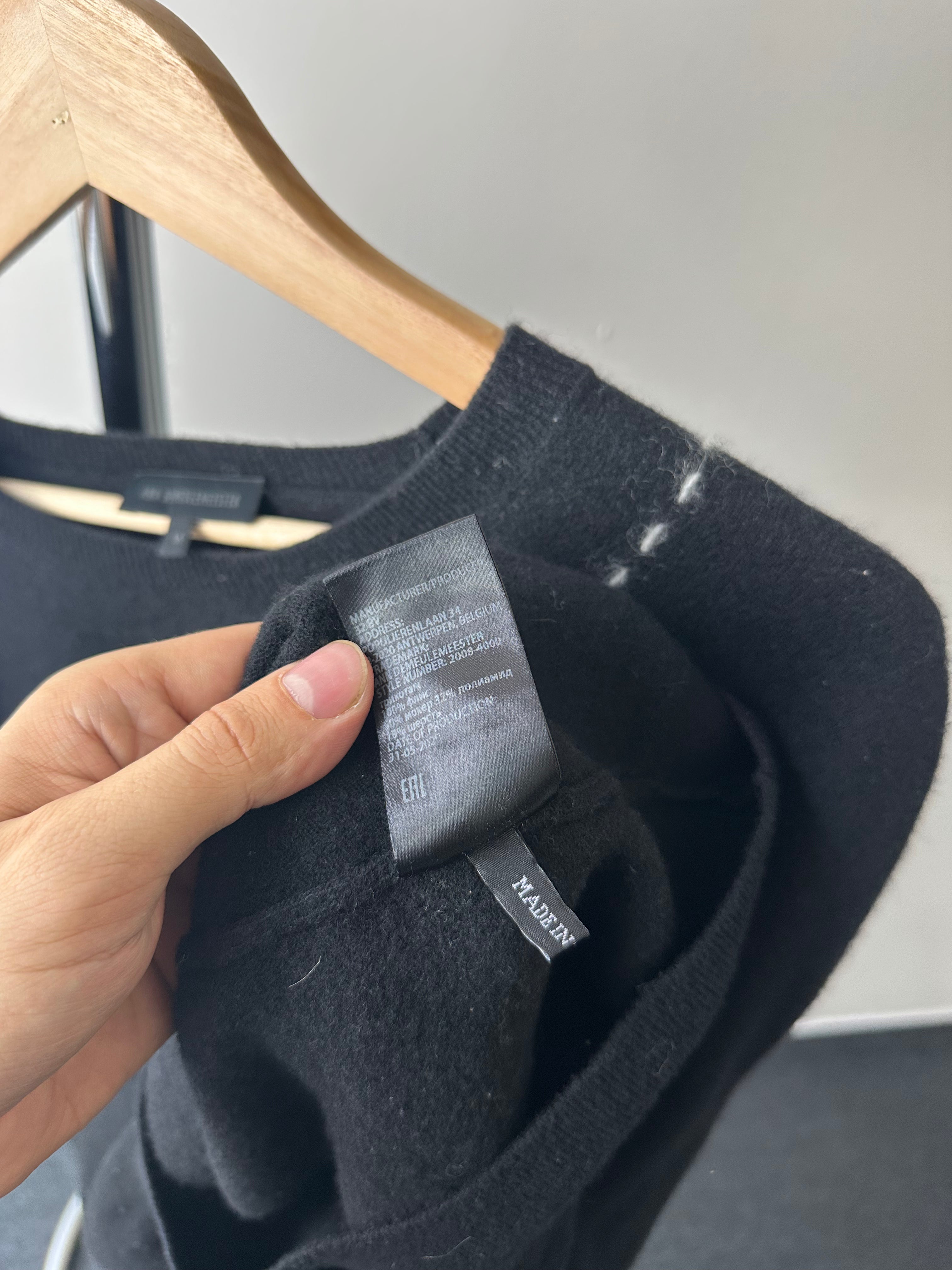 A sculptural Ann Demeulemeester knit defined by a slanted stitched seam that runs across the front — a quiet gesture of asymmetry that captures the brand’s signature balance between discipline and emotion.