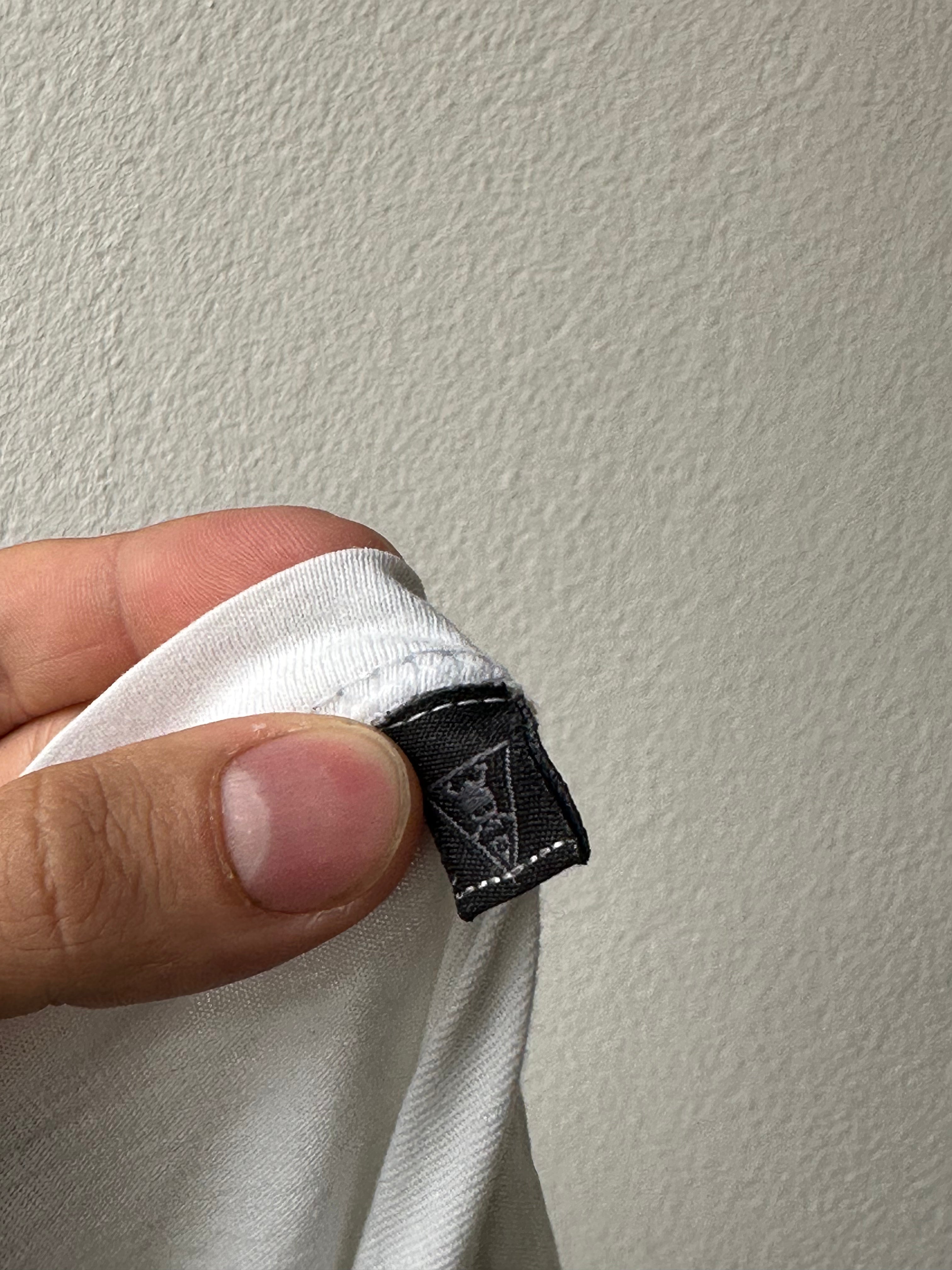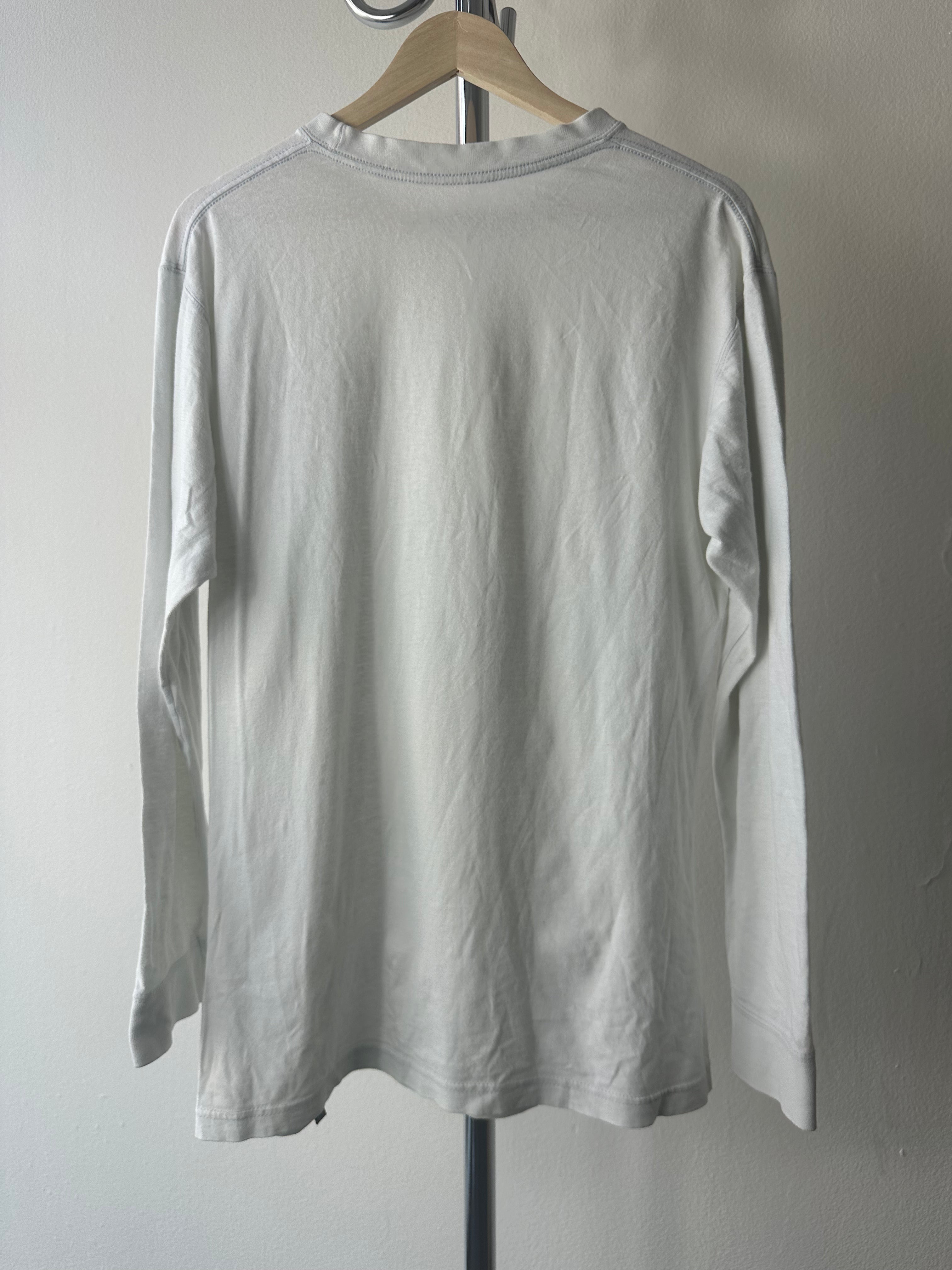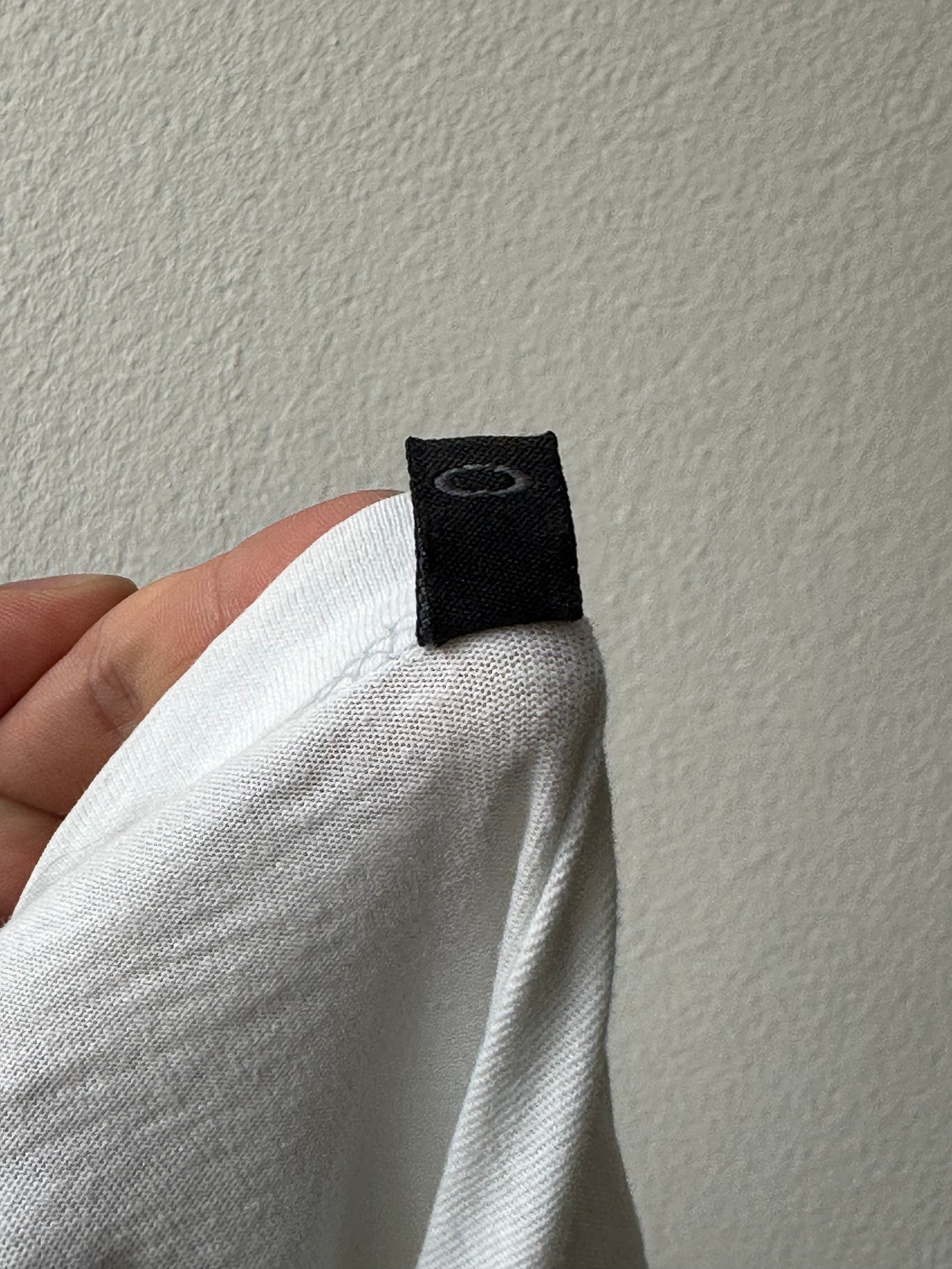 Clean, streamlined, unmistakably Oakley. This early 2000s long sleeve tee delivers the kind of futuristic minimalism the brand nailed in its golden era—featuring the signature silver Oakley logo stretched across the chest in a slightly metallic print. Soft white cotton with a subtle slub texture and a relaxed, slightly boxy fit that wears like a true L. Finished with a black woven tab on the hem: the front with the classic oval “O,” the reverse showing the Oakley icon skull—small but serious details for those who know.
