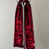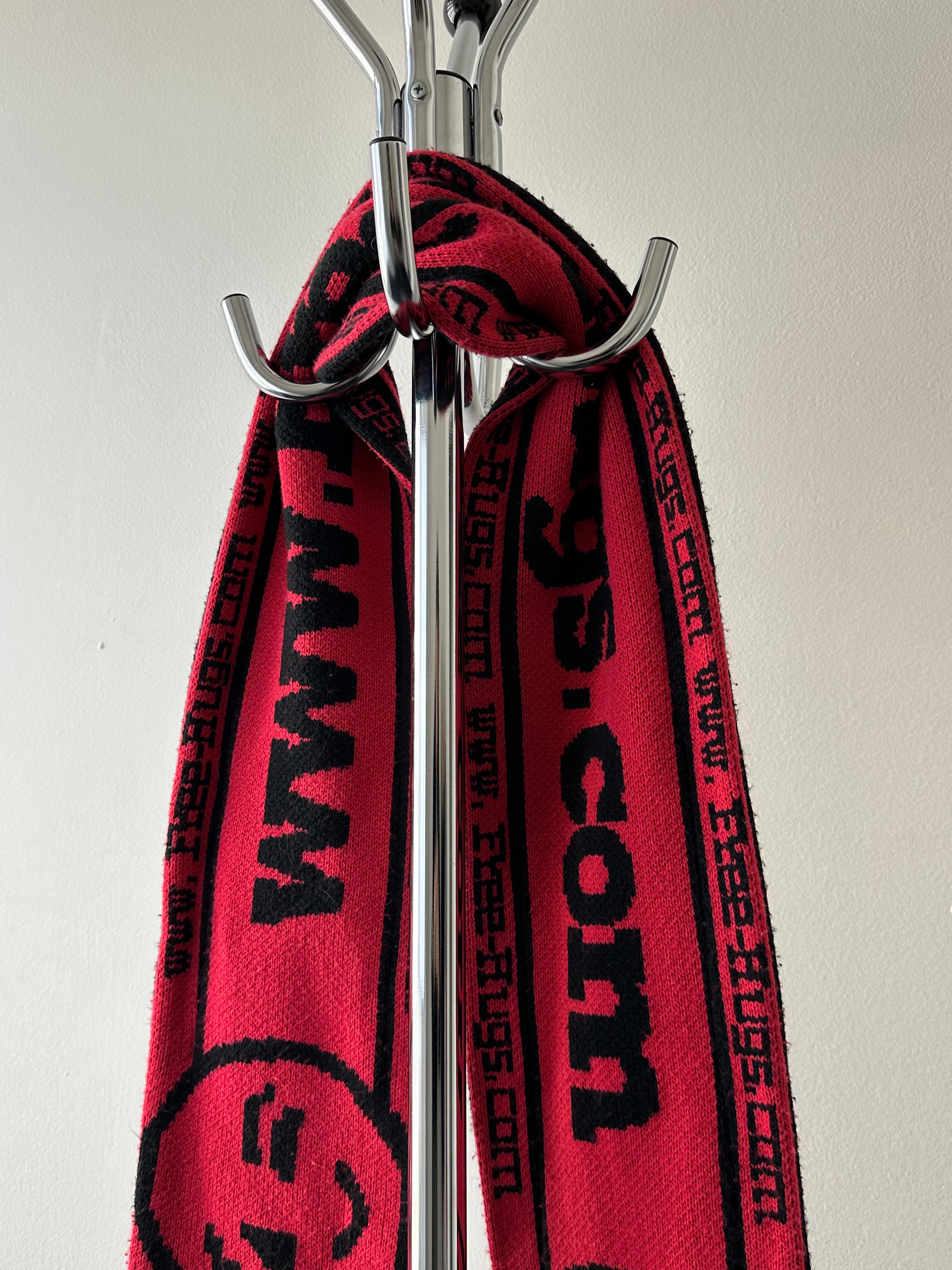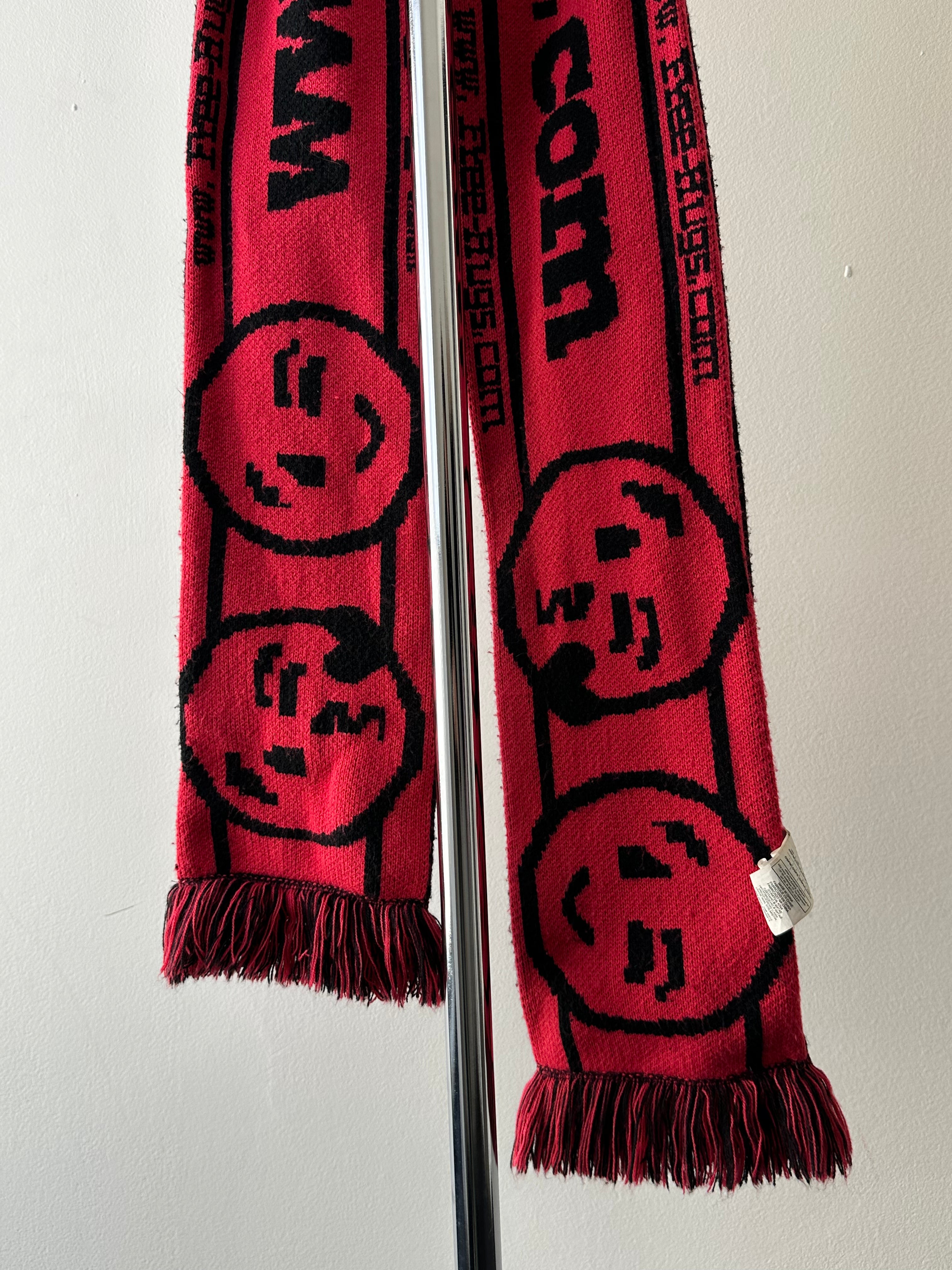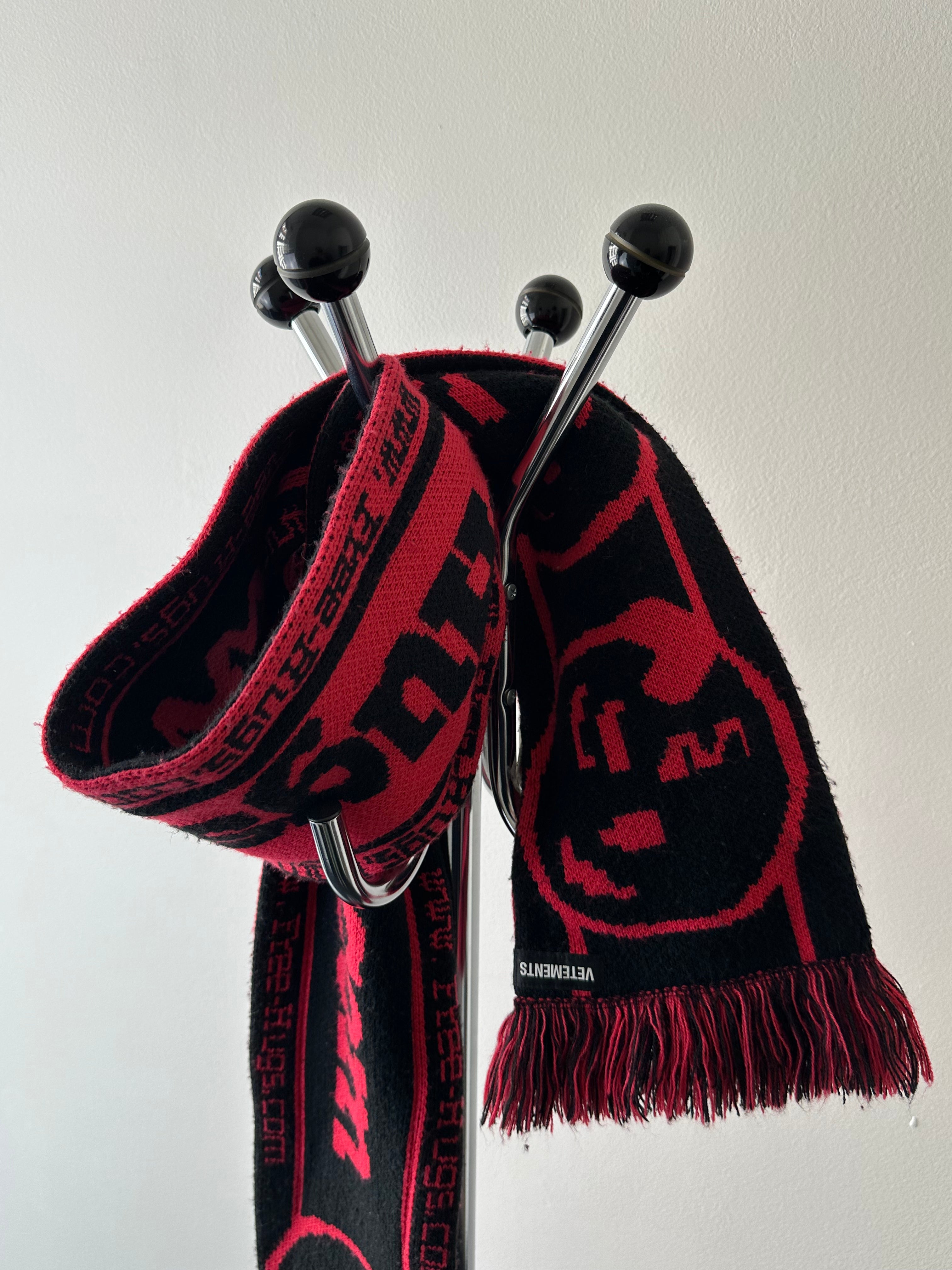 This Vetements x Reebok runway scarf twists the language of branding into something both absurd and iconic. Woven in bold red and black, it features oversized smiley faces alongside the “Vetements.com” motif — a subversive nod to internet culture, corporate logos, and fashion’s love for self-reference.