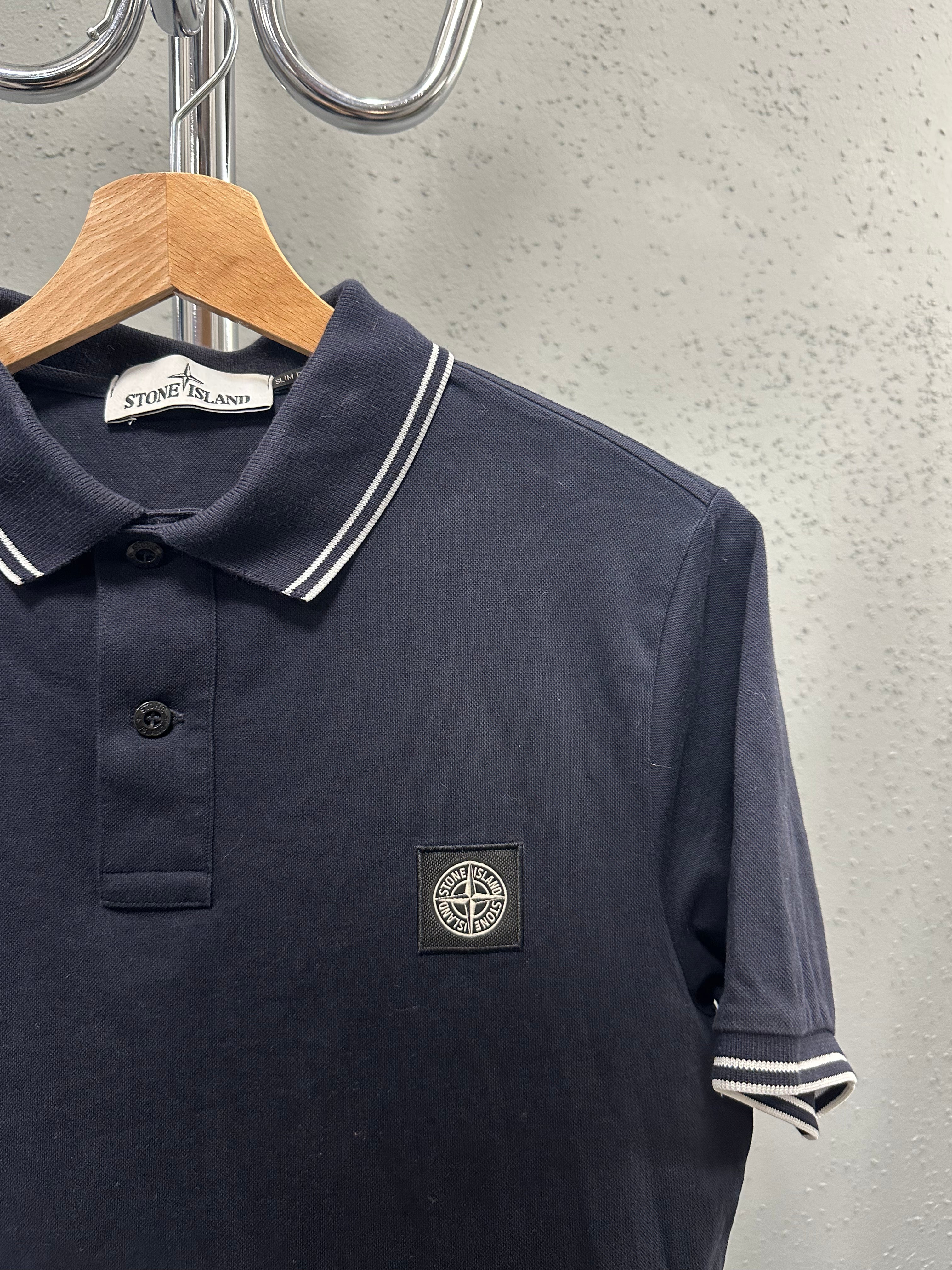 A Stone Island polo shirt in a deep midnight blue, cut in a slim, precise silhouette. Made from fine cotton piqué with a smooth, compact hand feel that sits close to the body without feeling restrictive.