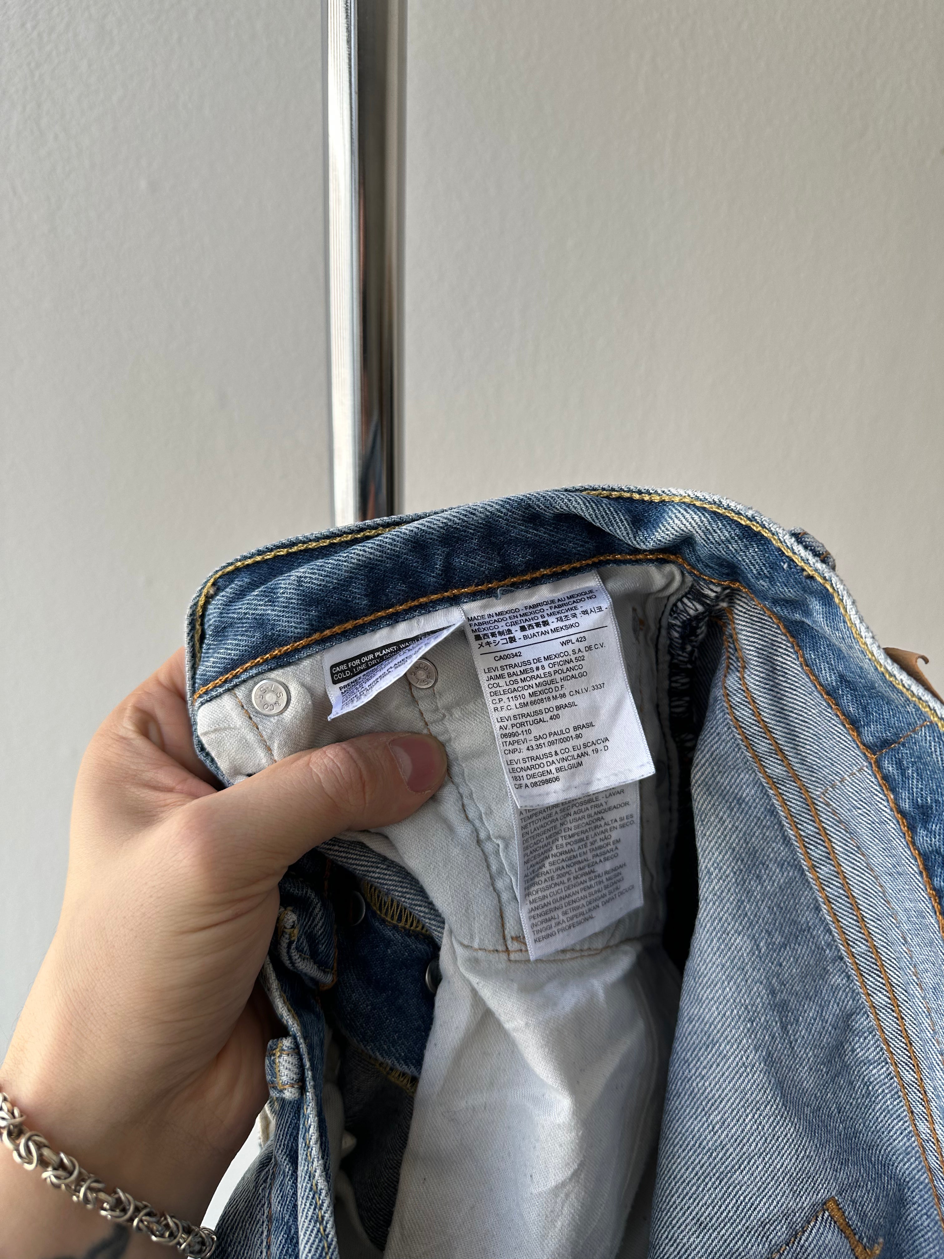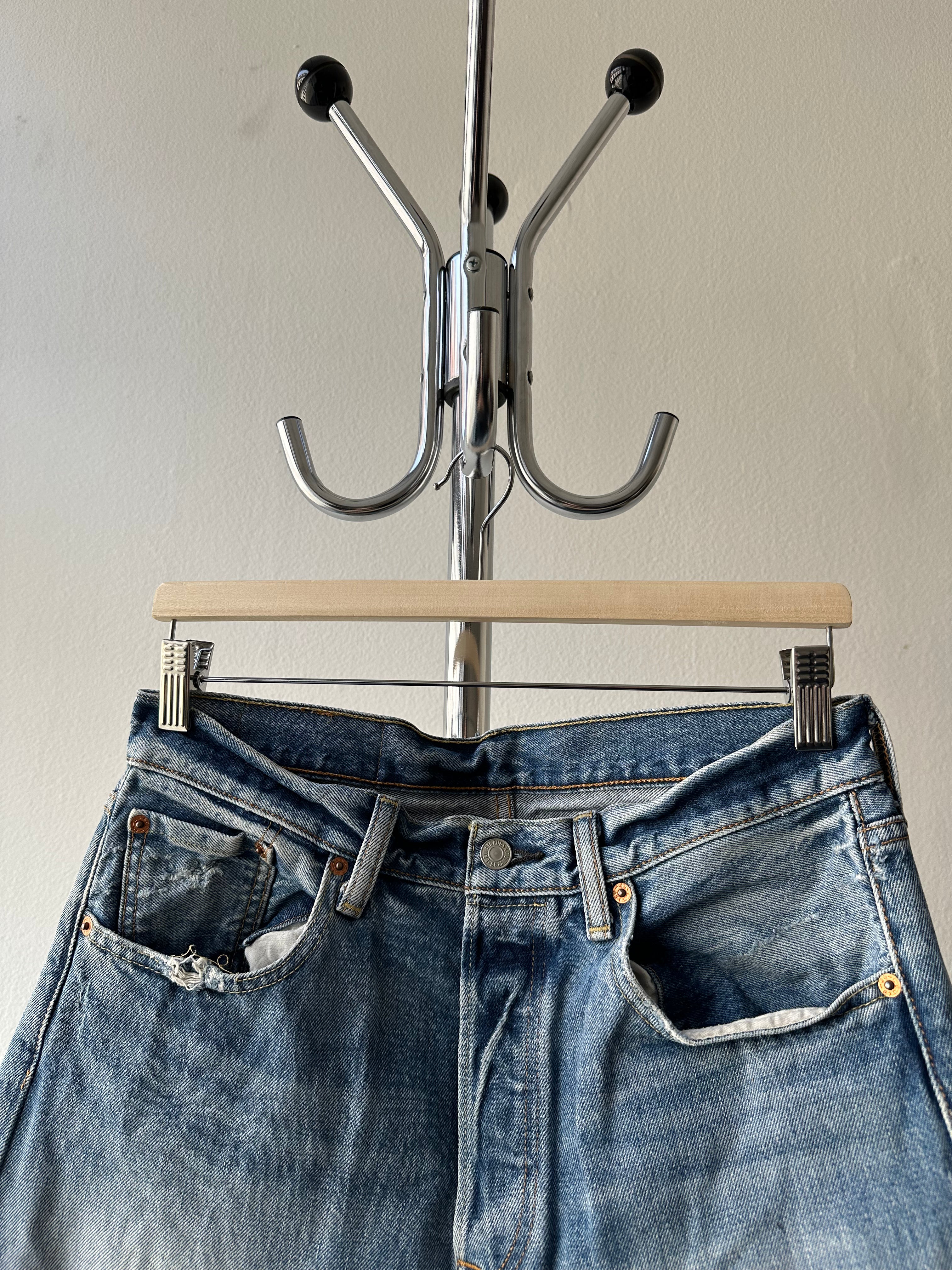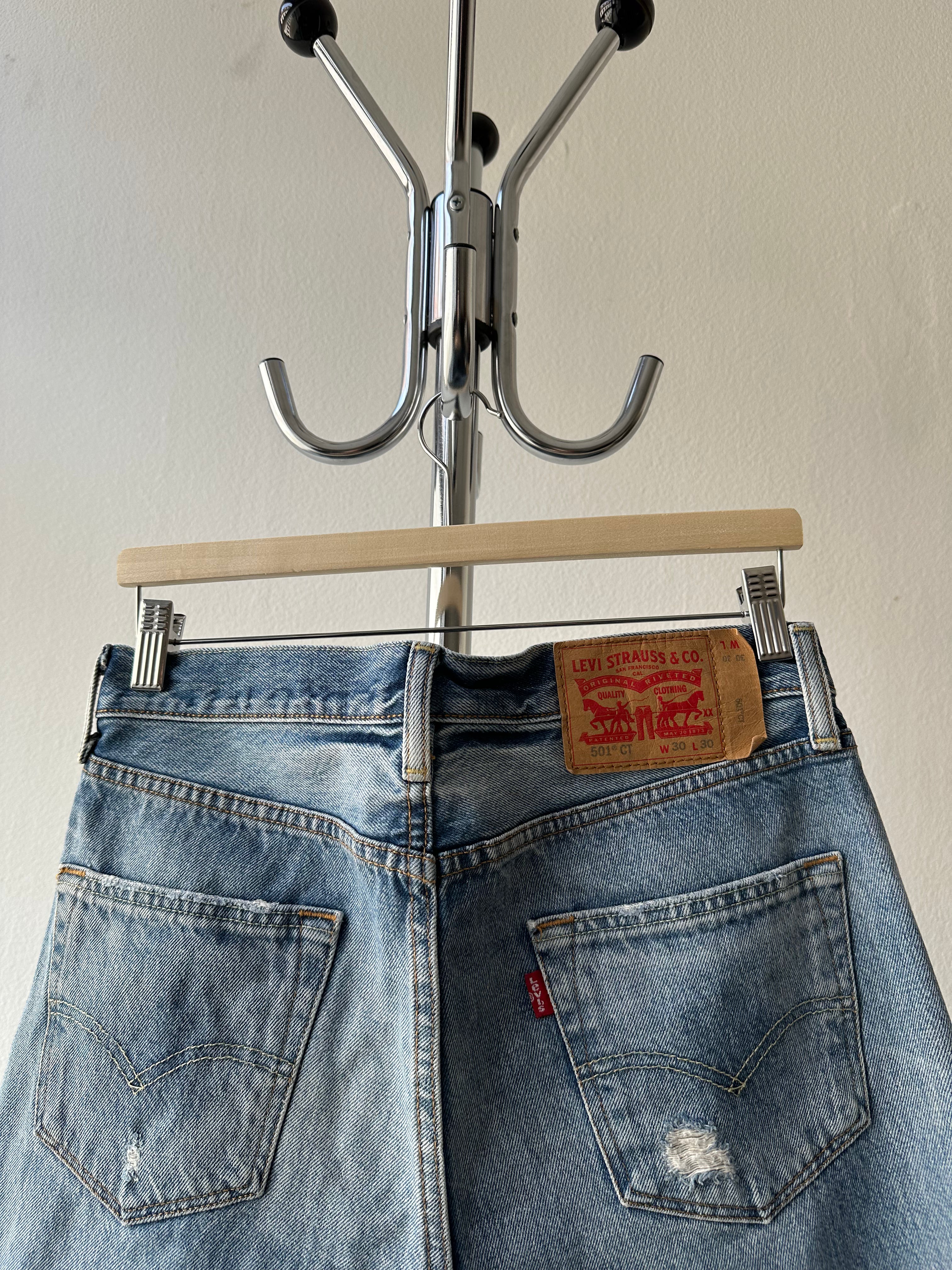 A pair of well-worn Levi’s 501 CT (Customized & Tapered) in a perfectly broken-in light wash. Heavy distressing, frayed edges, and soft denim give them a vintage feel, even though they’re a more modern release. Classic red tab, button fly, and signature 501 details make them a great addition to any wardrobe.