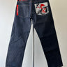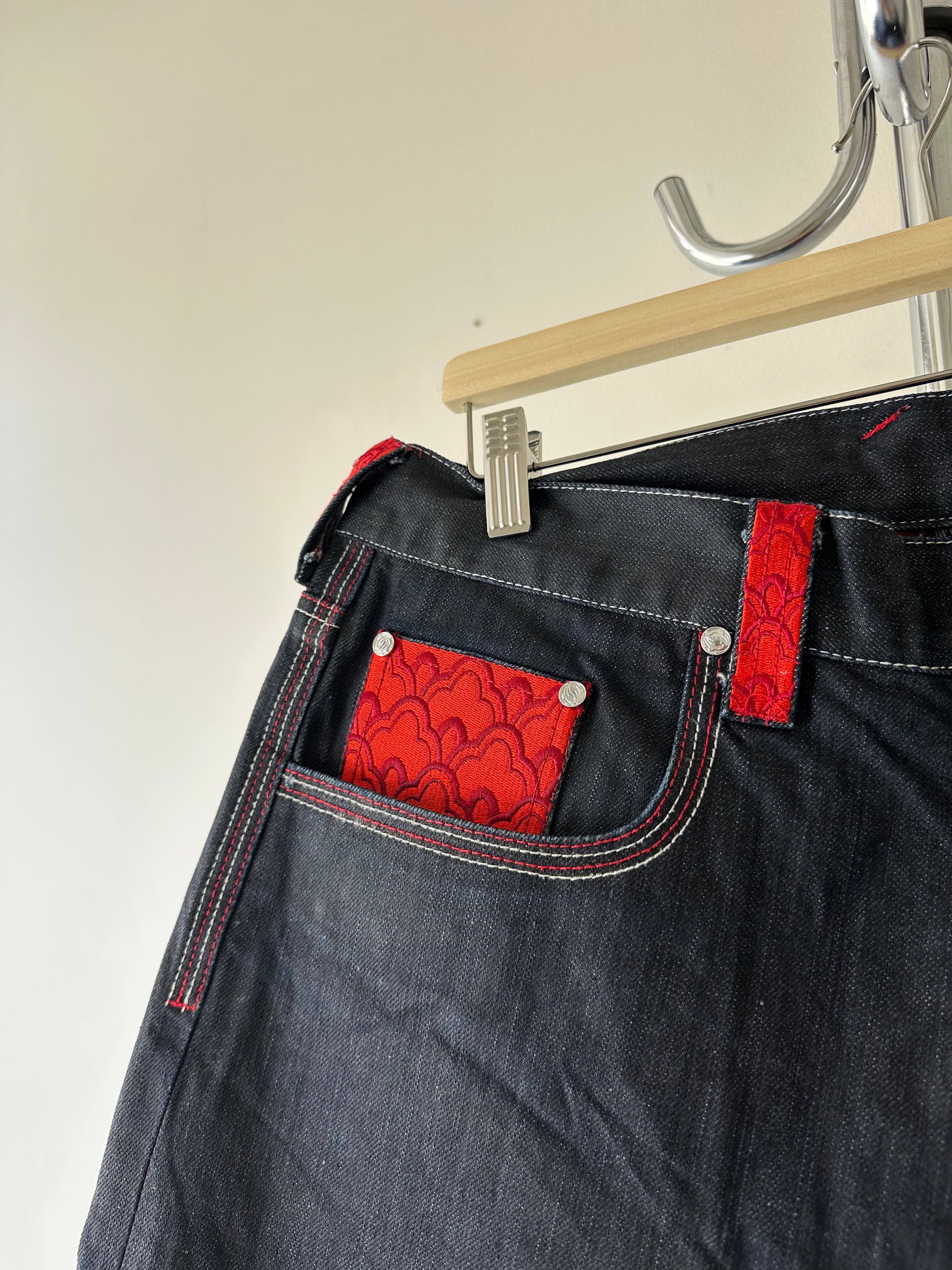 Cut from heavyweight indigo selvedge denim with tonal stitching, red bartack details, and patterned inner lining. The contrast between the deep indigo and bold embroidery captures the balance of craft and attitude that defines early 2000s Japanese denim culture.