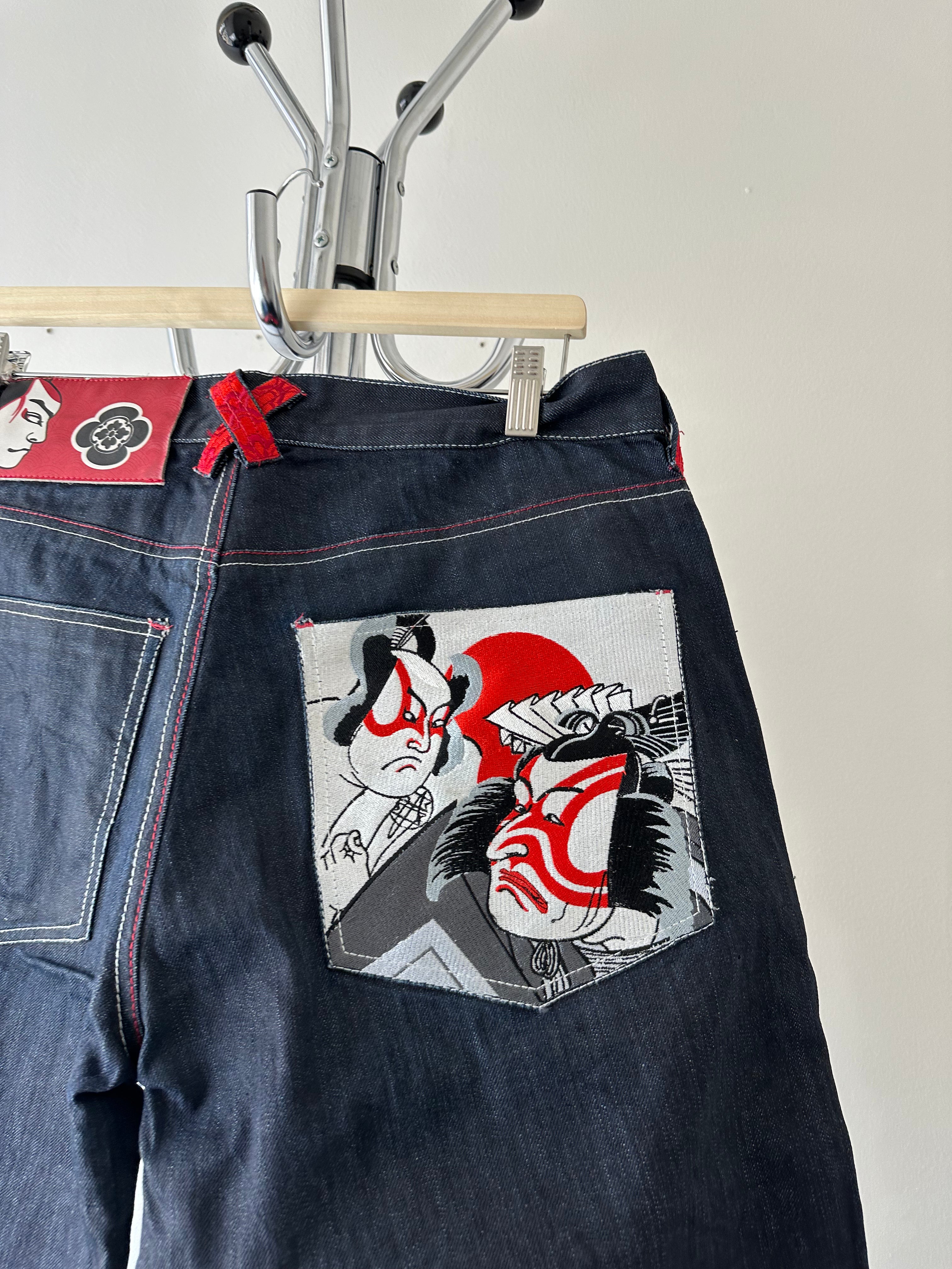 Rare S2ONE’d Japan denim featuring full-scale Kabuki-inspired embroidery on the back pocket — a striking depiction of traditional Japanese theater masks rendered in red, white, and black.