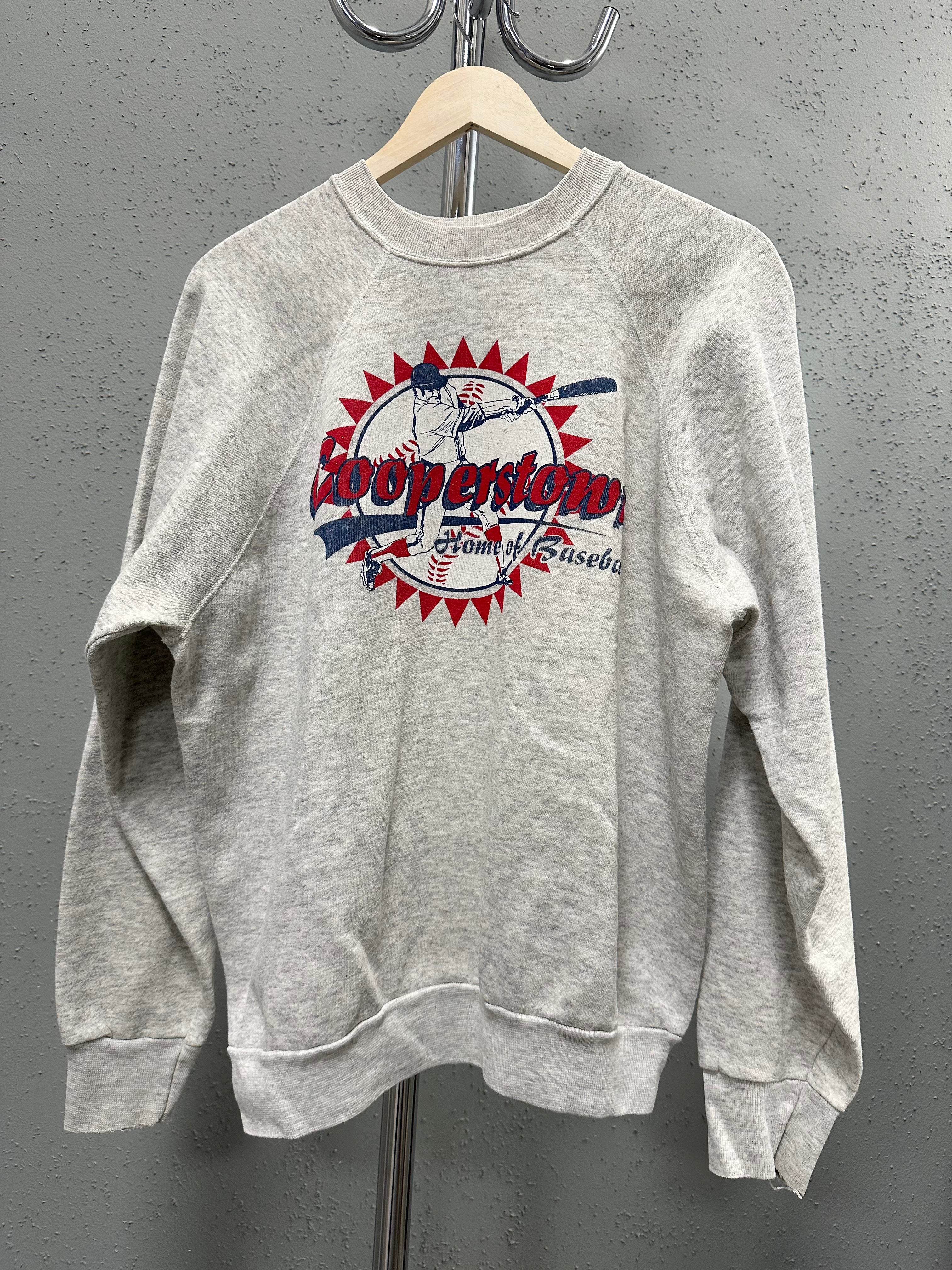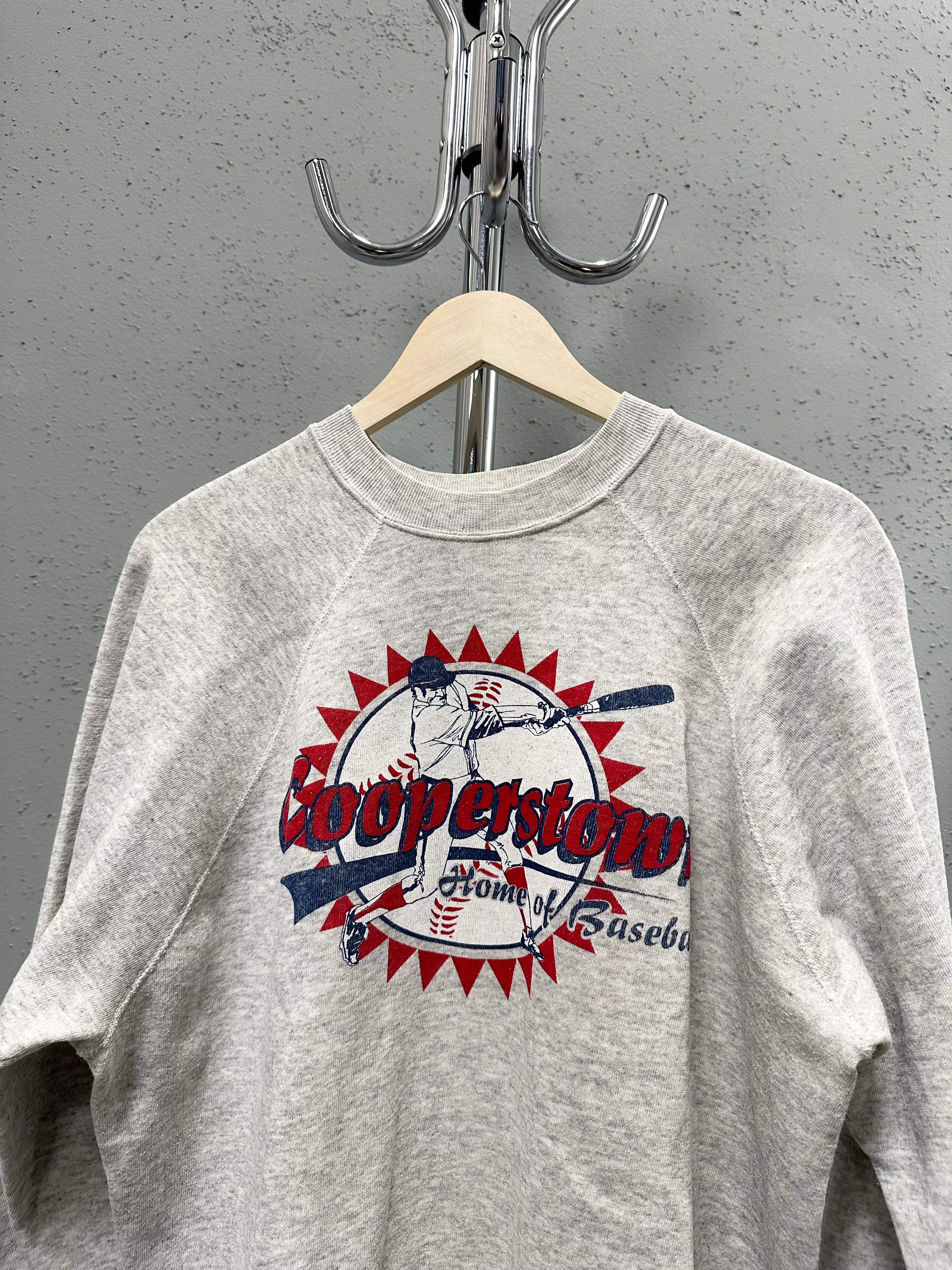 The front graphic references Cooperstown – Home of Baseball, rendered in a bold yet understated print typical of the era. The raglan sleeve construction and heather grey base place it firmly in the late 80s athleticwear tradition — before oversized branding and heavy licensing took over in the 1990s.