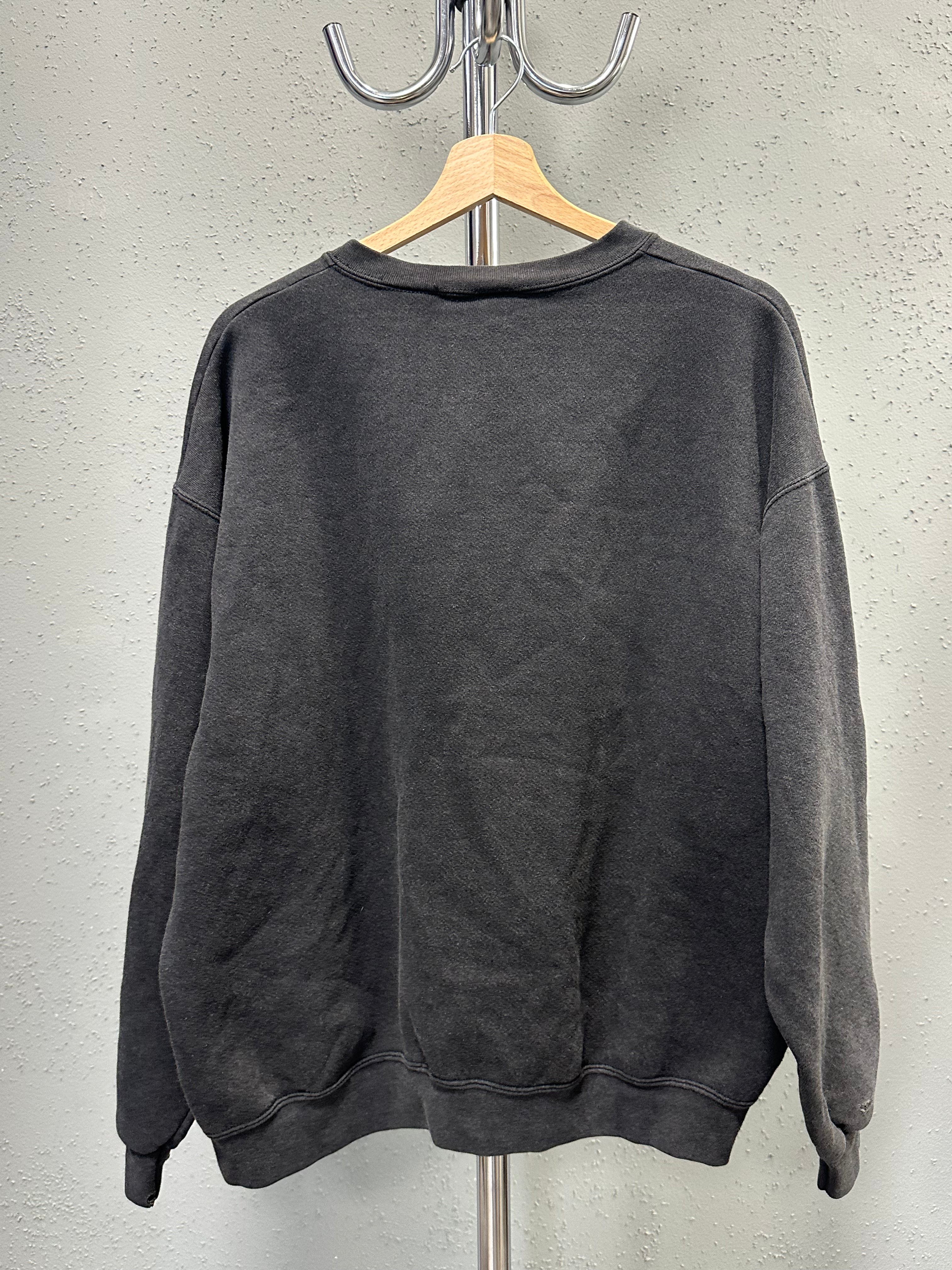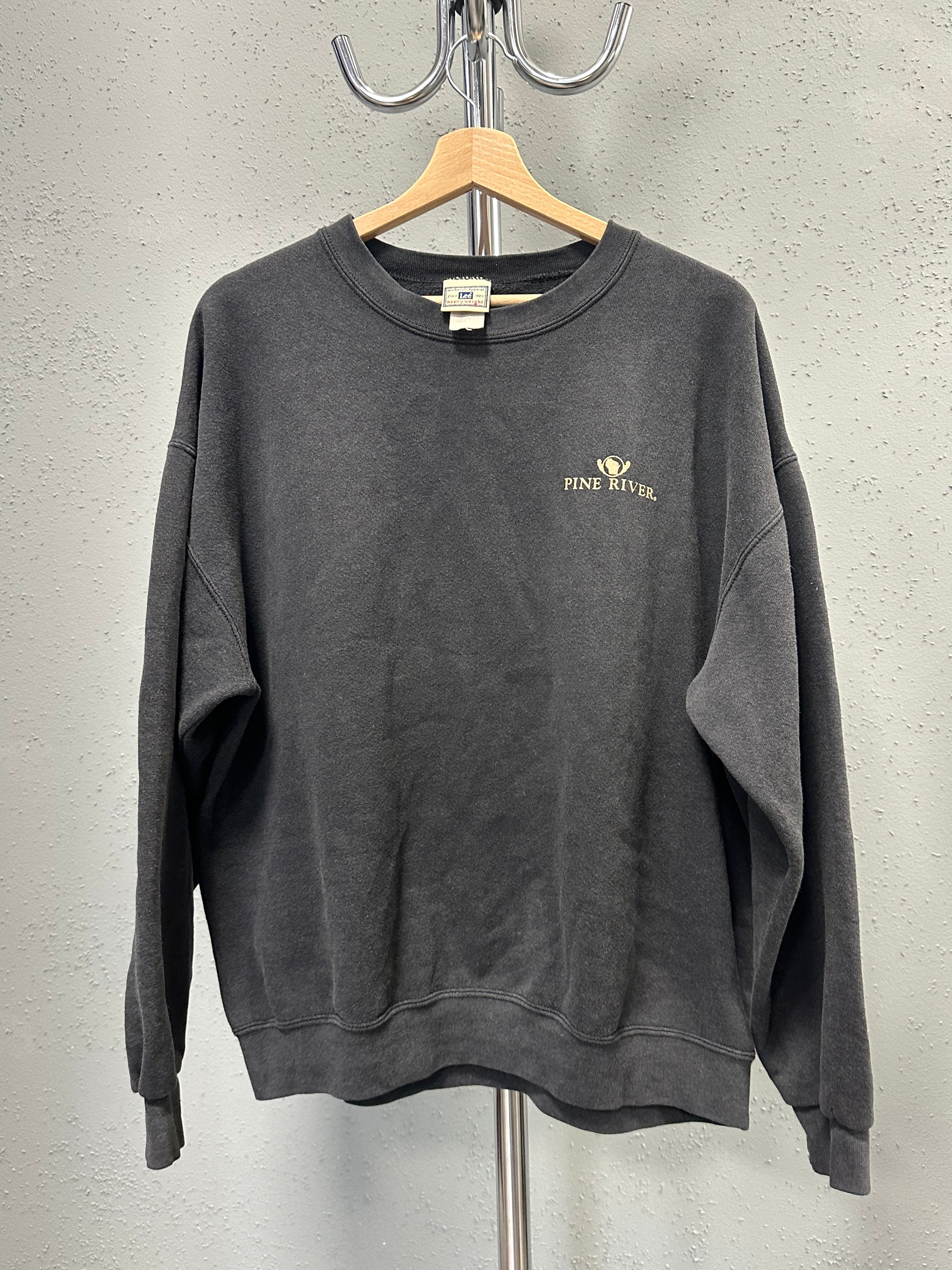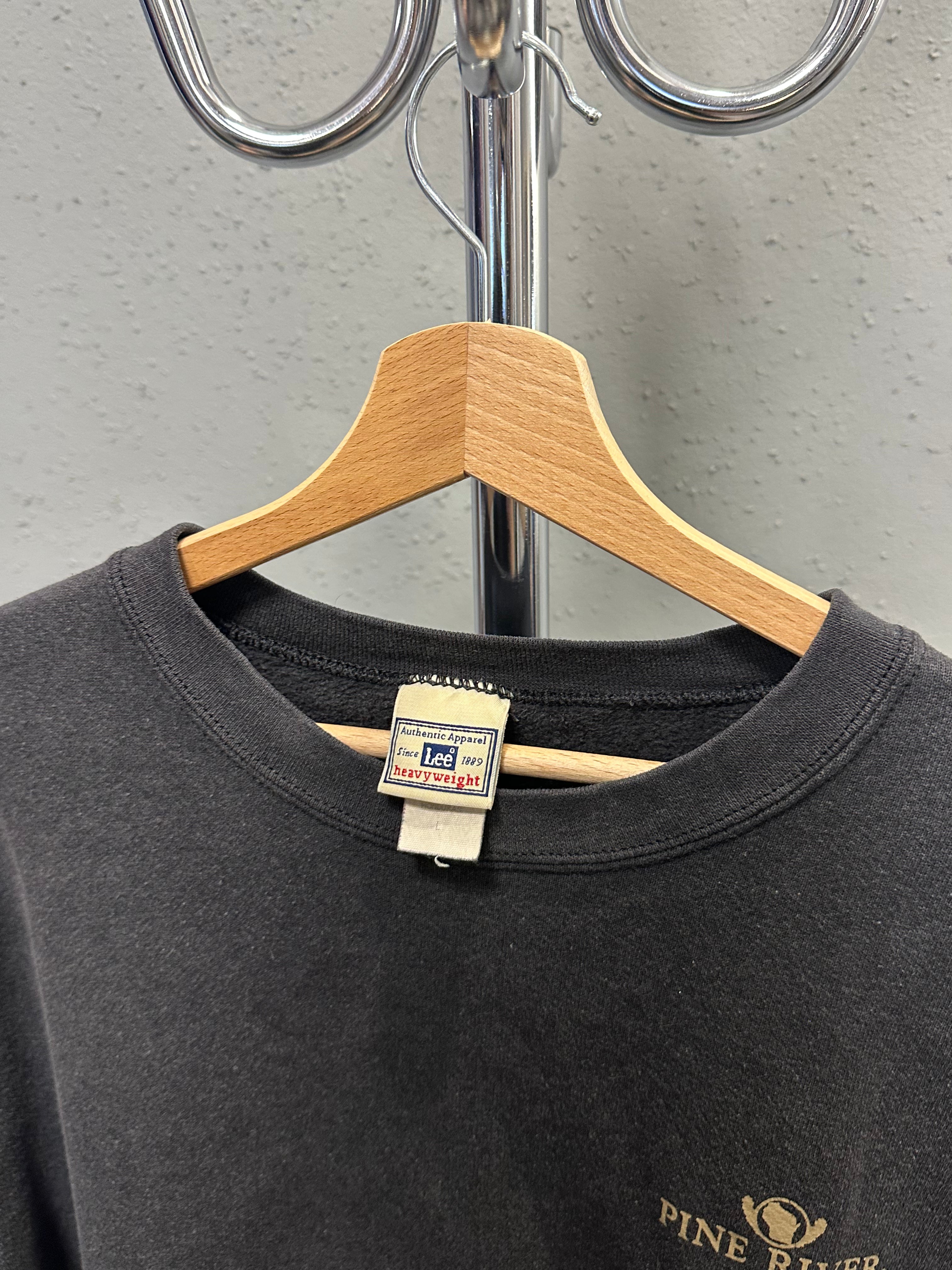 A quiet 1990s Lee crewneck with the kind of wear you can’t fake. Heavyweight cotton, softened over time, finished in a naturally faded black that sits closer to charcoal. Small “Pine River” chest embroidery keeps it understated — present, but never loud.