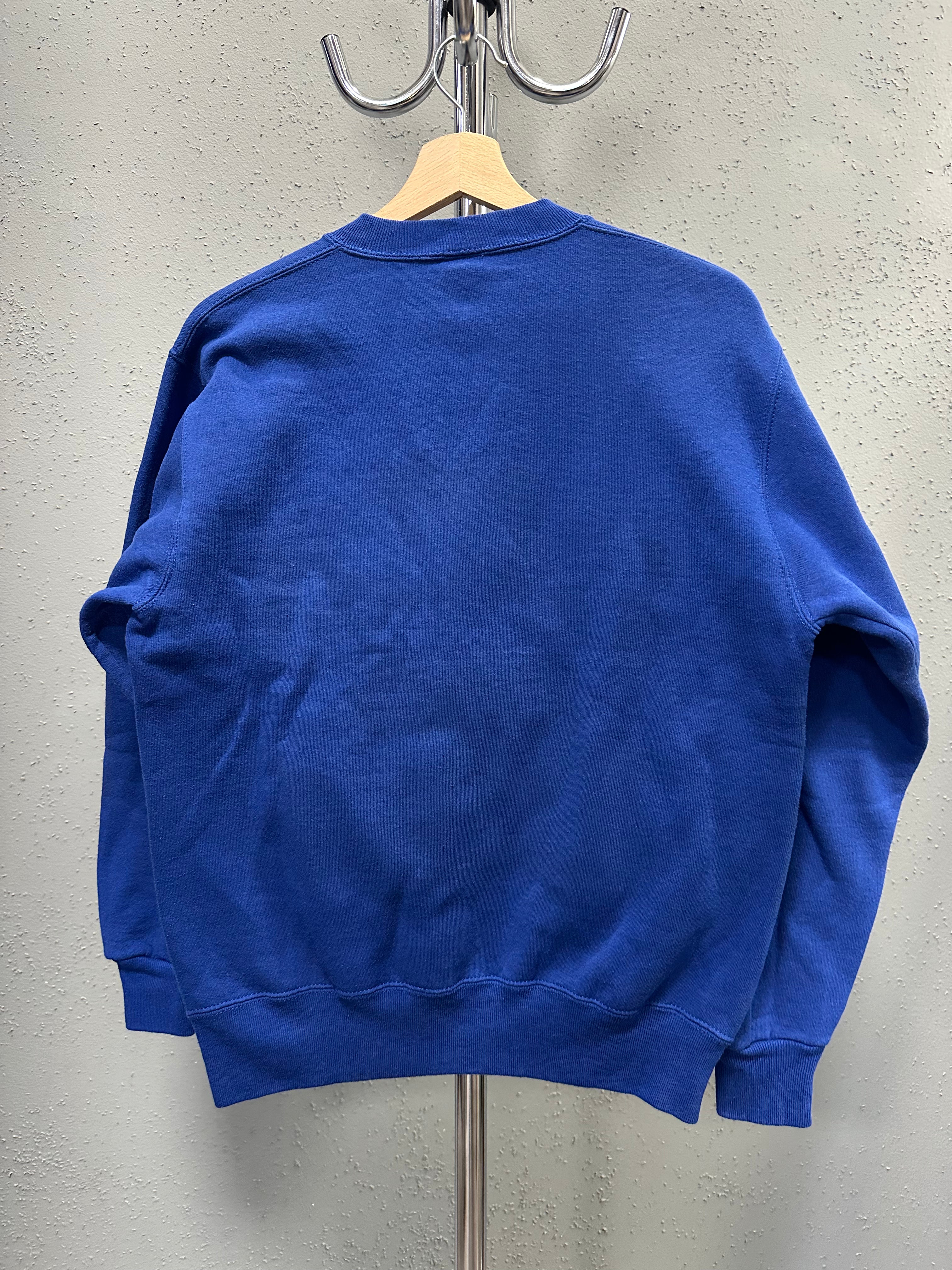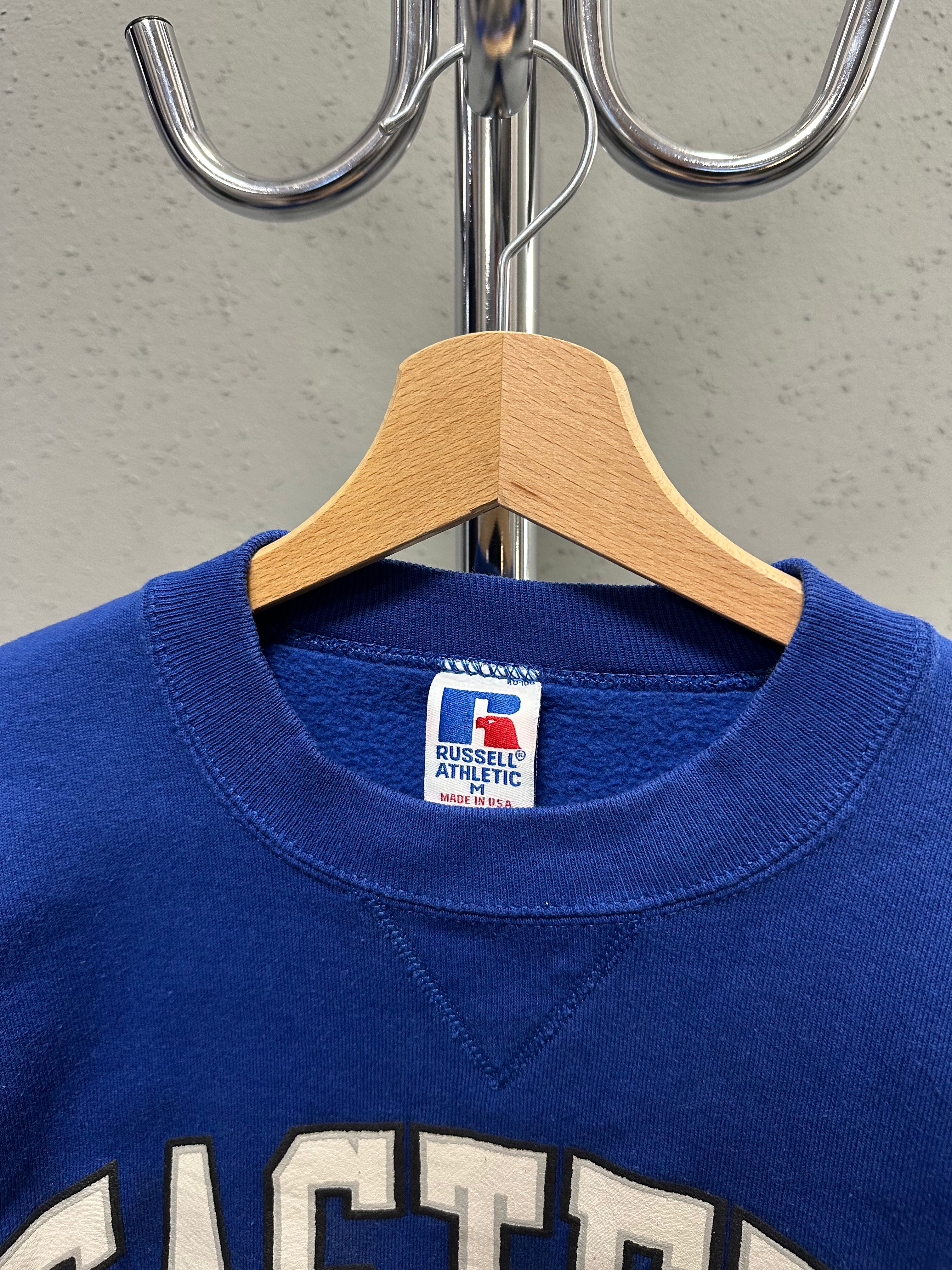 A classic 1990s Russell Athletic crewneck, made in the USA, in a deep collegiate blue with bold “Eastern Illinois” lettering across the chest. Heavy cotton fleece with the dense, structured feel Russell was known for in this period.