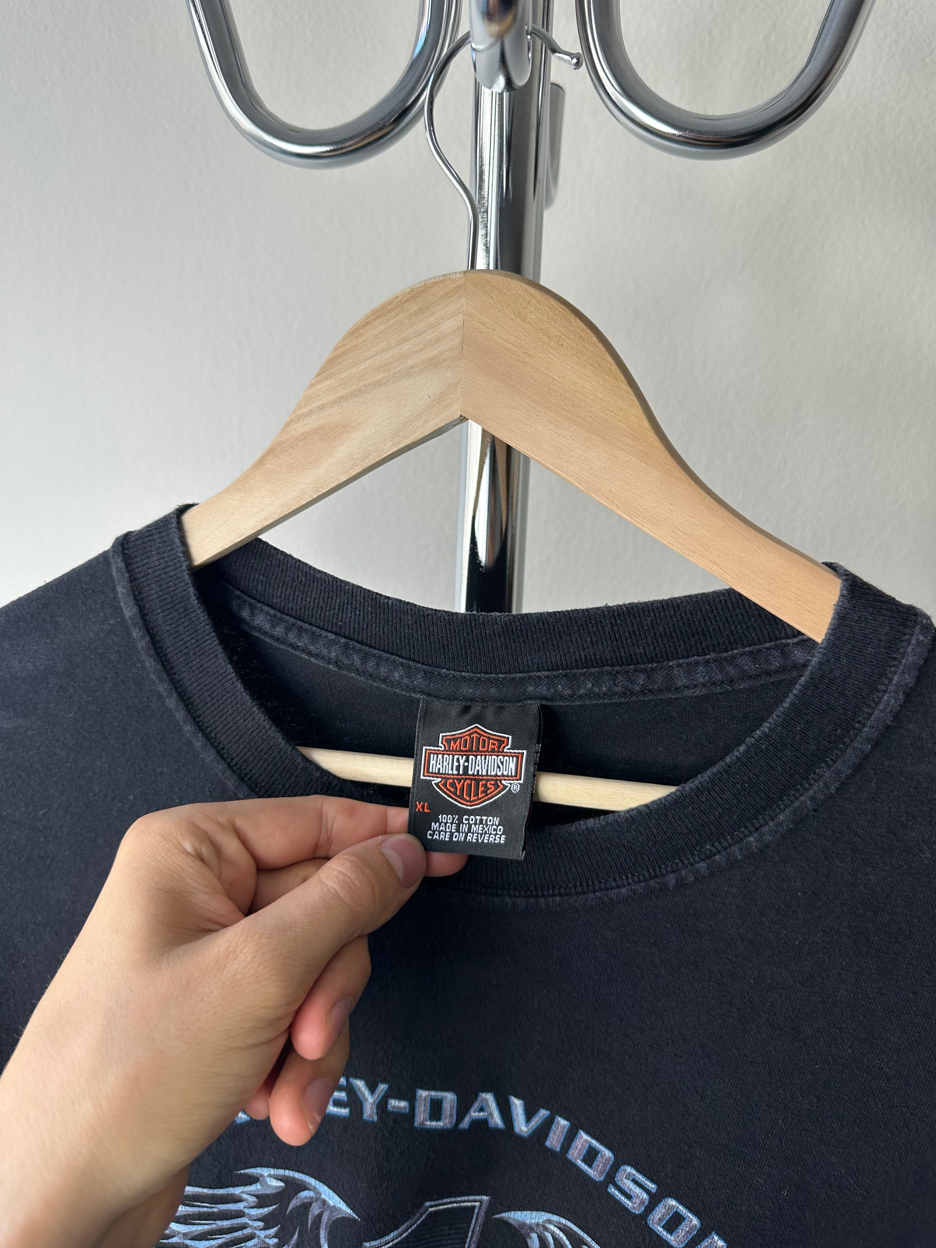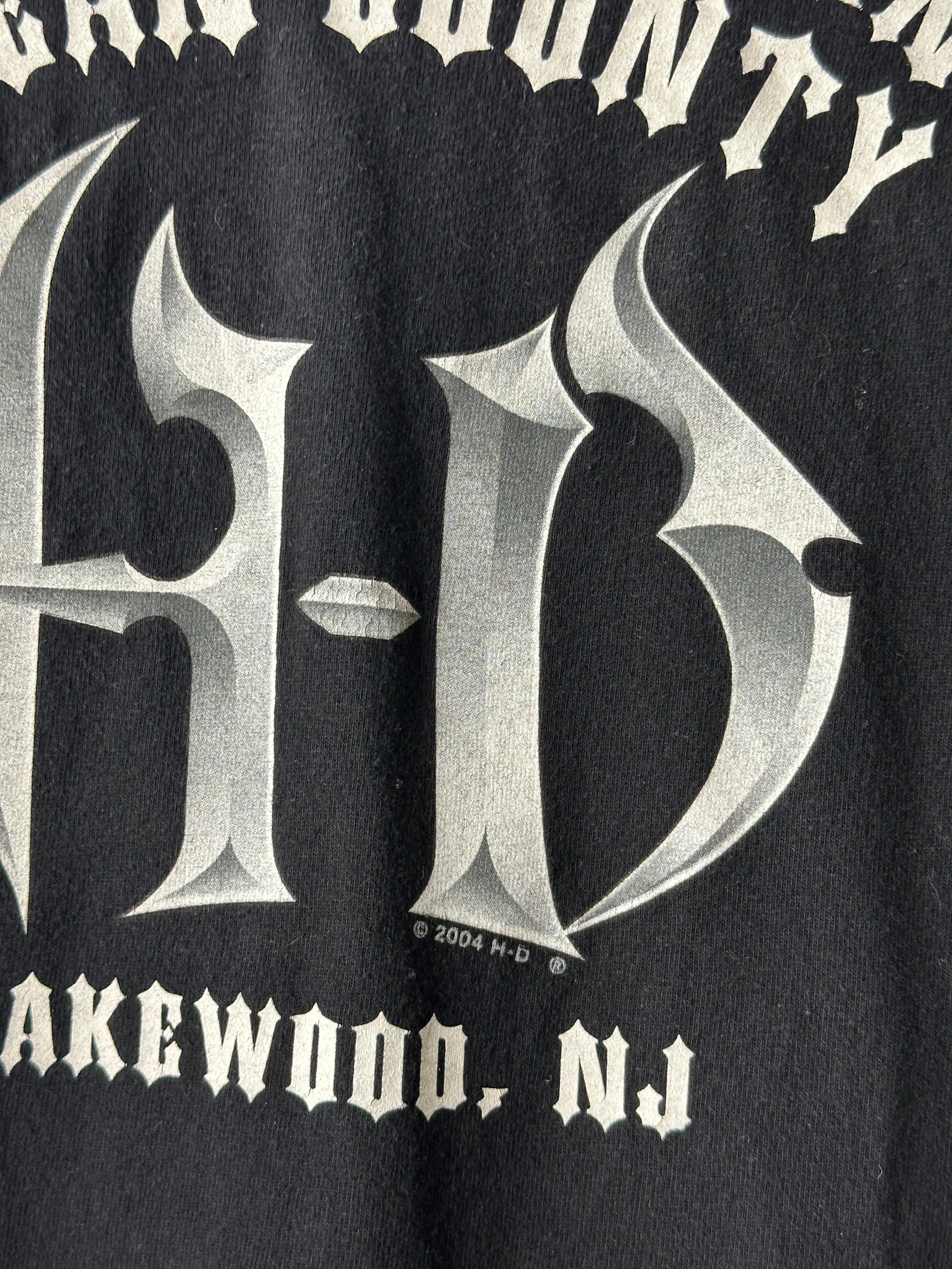 2004 Harley-Davidson tee featuring the iconic All American #1 winged graphic across the chest, printed in icy chrome tones on jet black cotton. The back hits just as hard — bold gothic HD lettering stamped with Lakewood, NJ beneath it. A piece that leans into its own mythos — American steel, speed, and defiance.