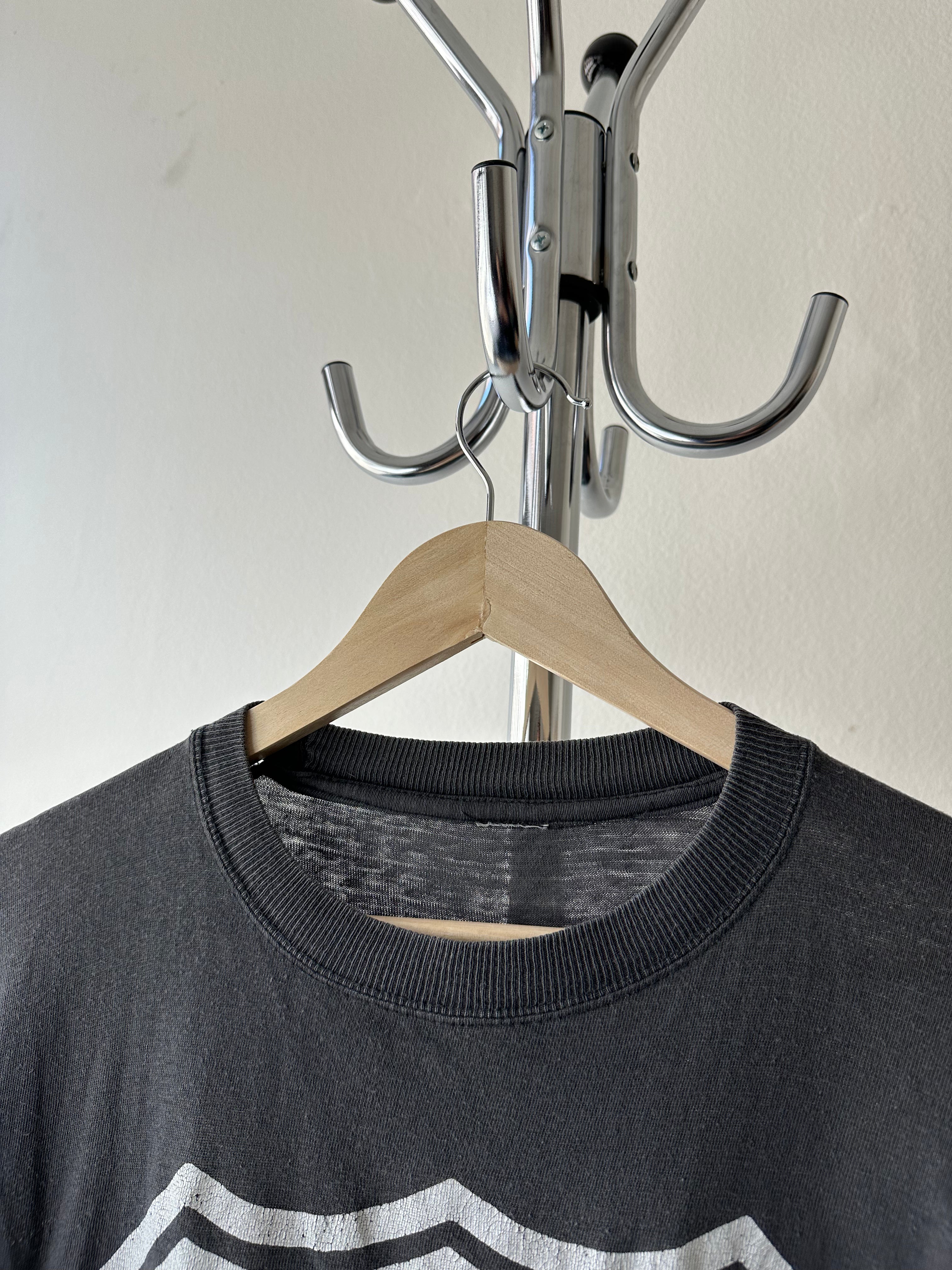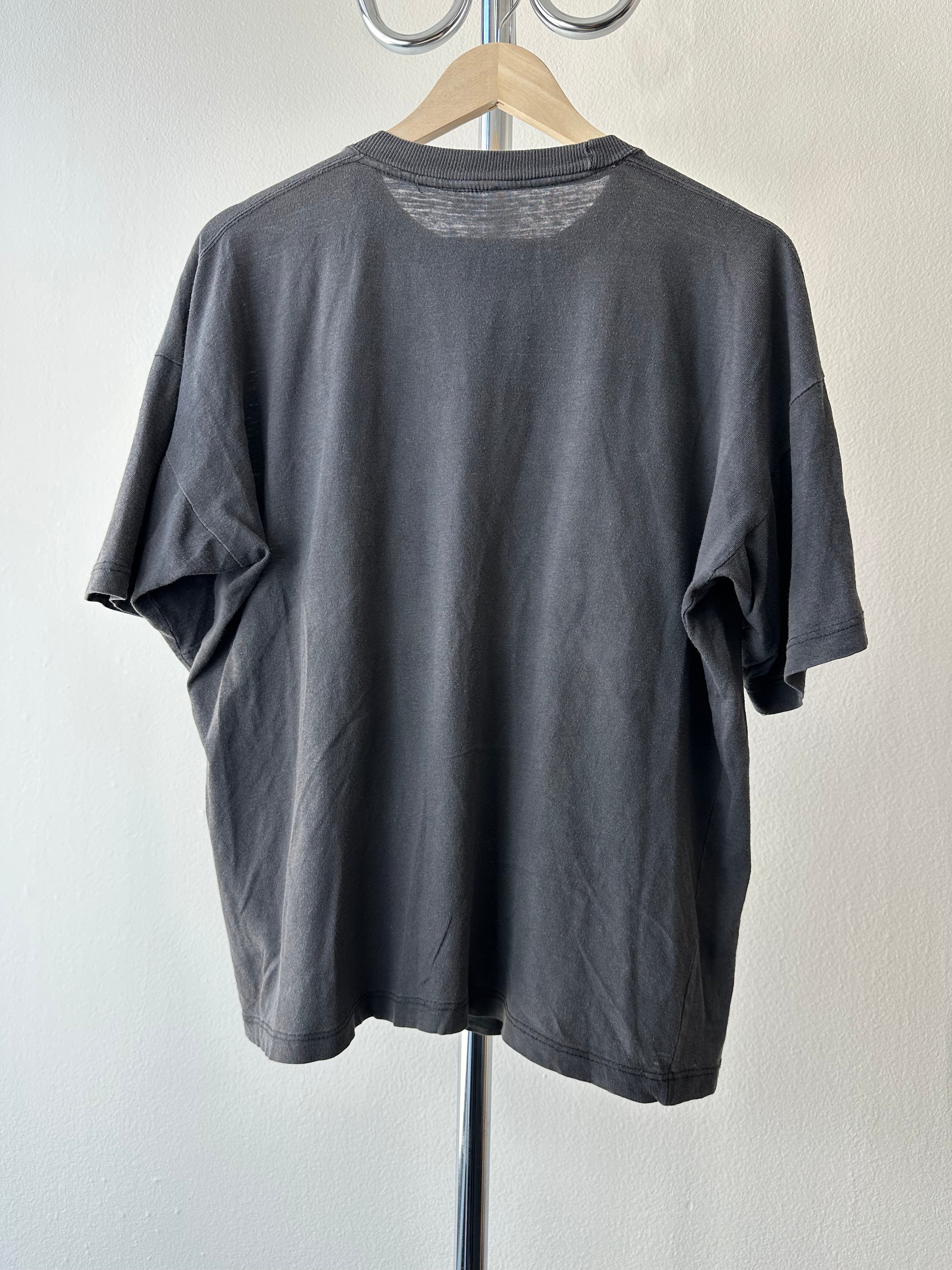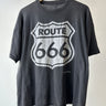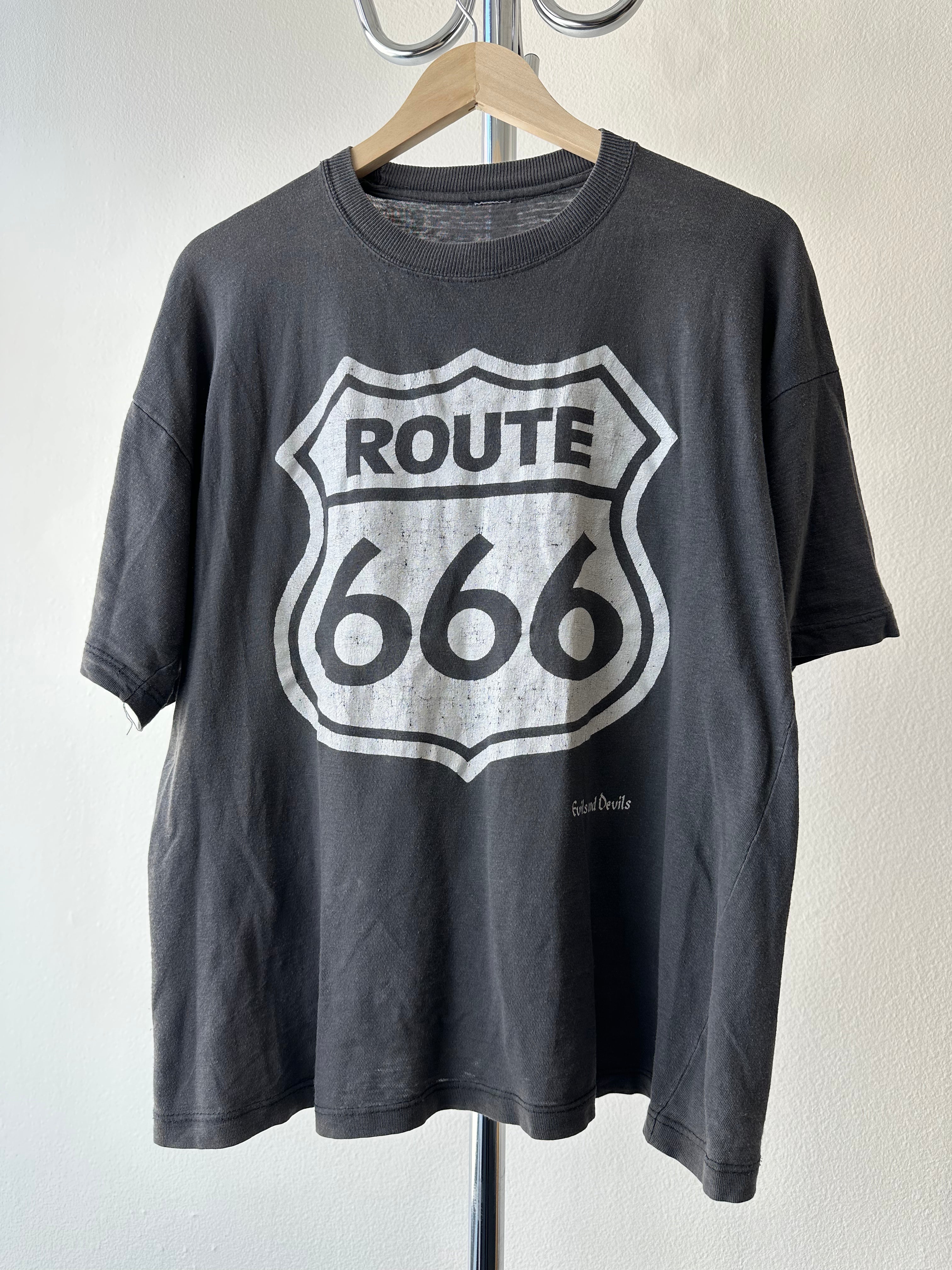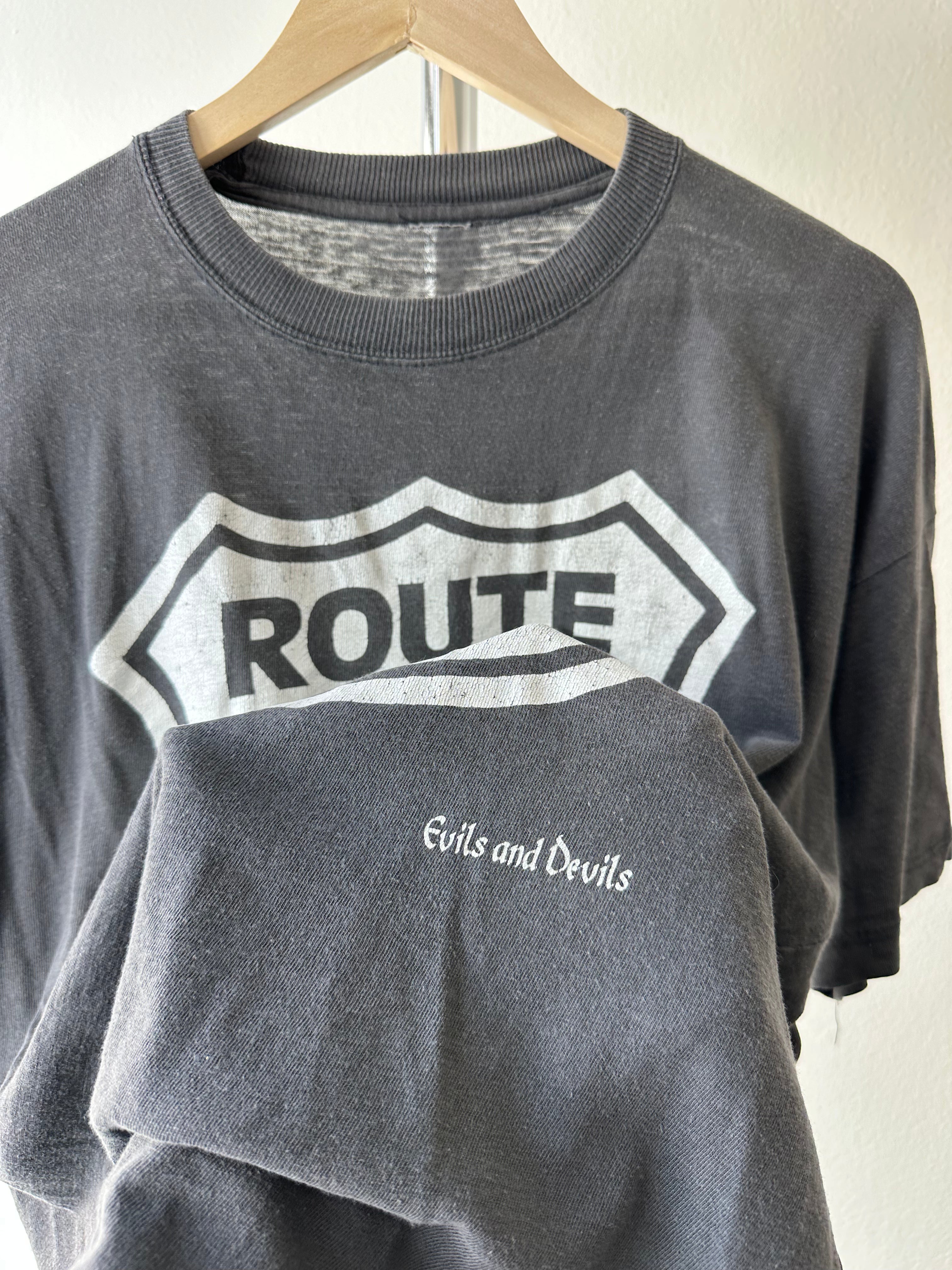 Original Route 666 tee from the 1990s, featuring the bold highway emblem front and center, with “Evils and Devils” script at the hem and chest. Thick white ink, softened over time.