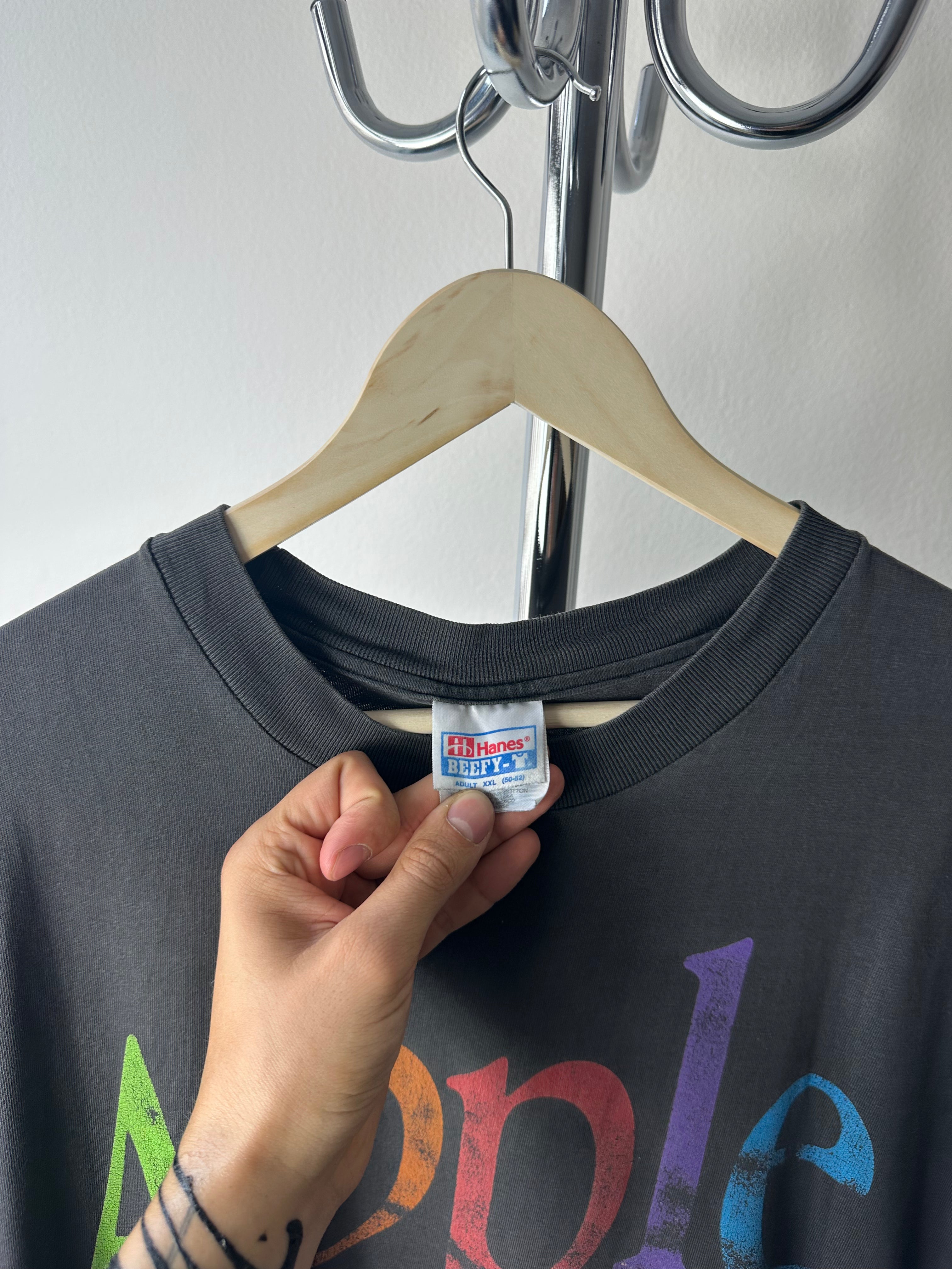 Soft and worn-in with a wide, boxy cut typical of early 90s Hanes Beefy tees. The rainbow Apple branding is not just nostalgic — it’s iconic.