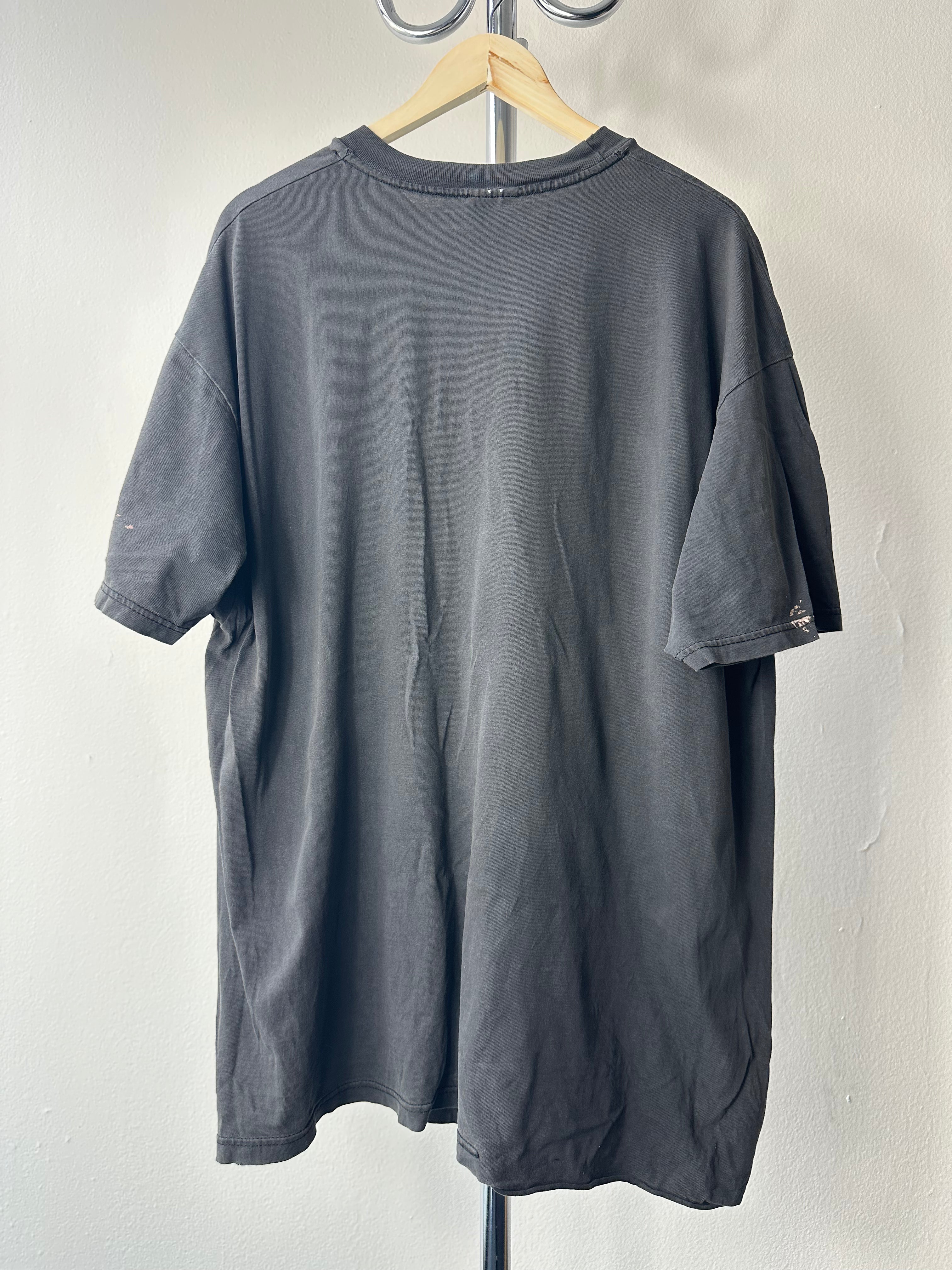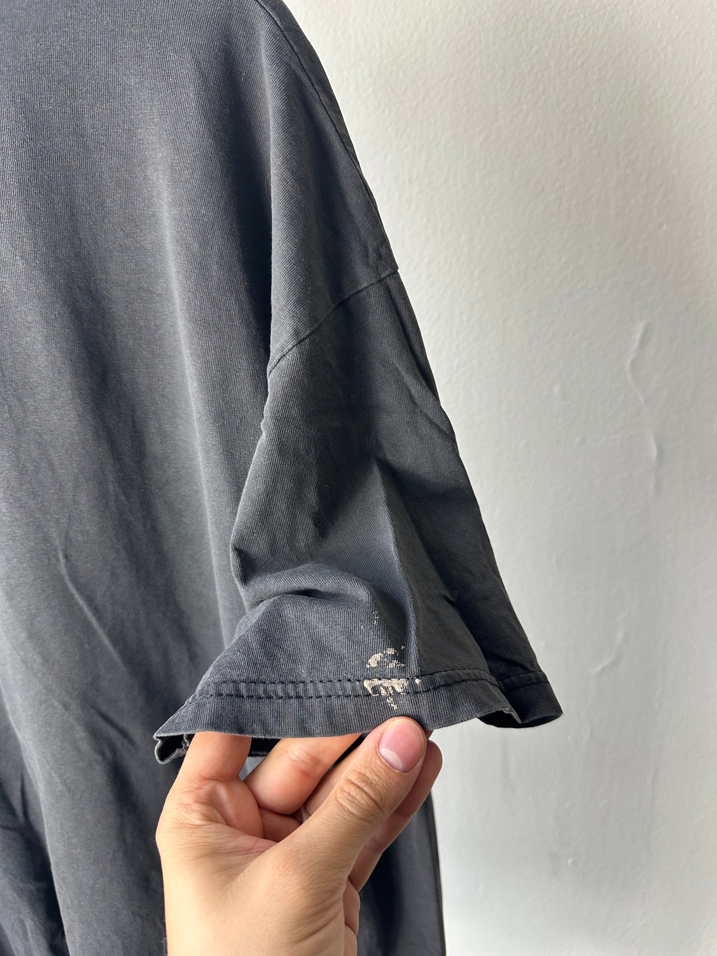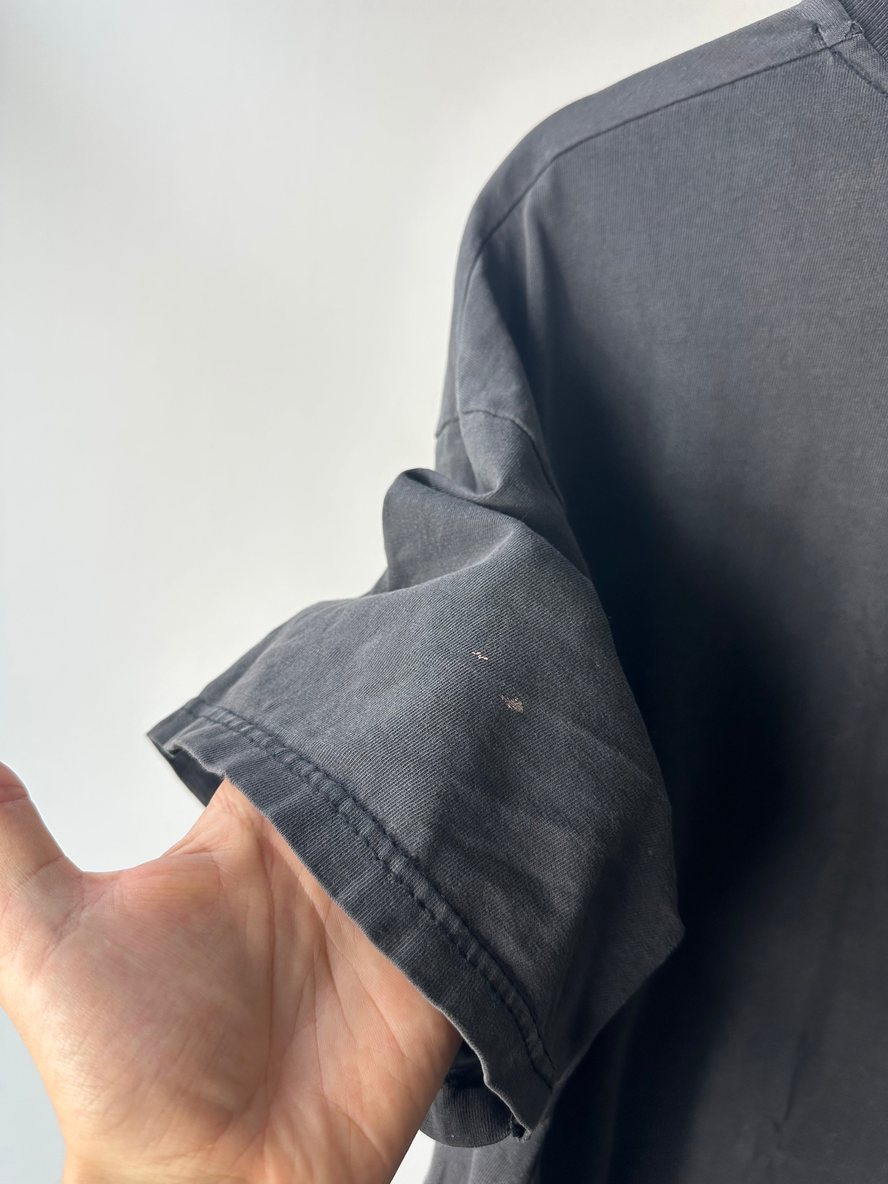 A rare and striking piece of tech history. This original 90s tee features the Apple logotype in vibrant rainbow letters, set against a deeply faded black cotton. Subtle distressing and faint paint marks along the hem and sleeve hint at decades of wear — from startup garages to studio desks.