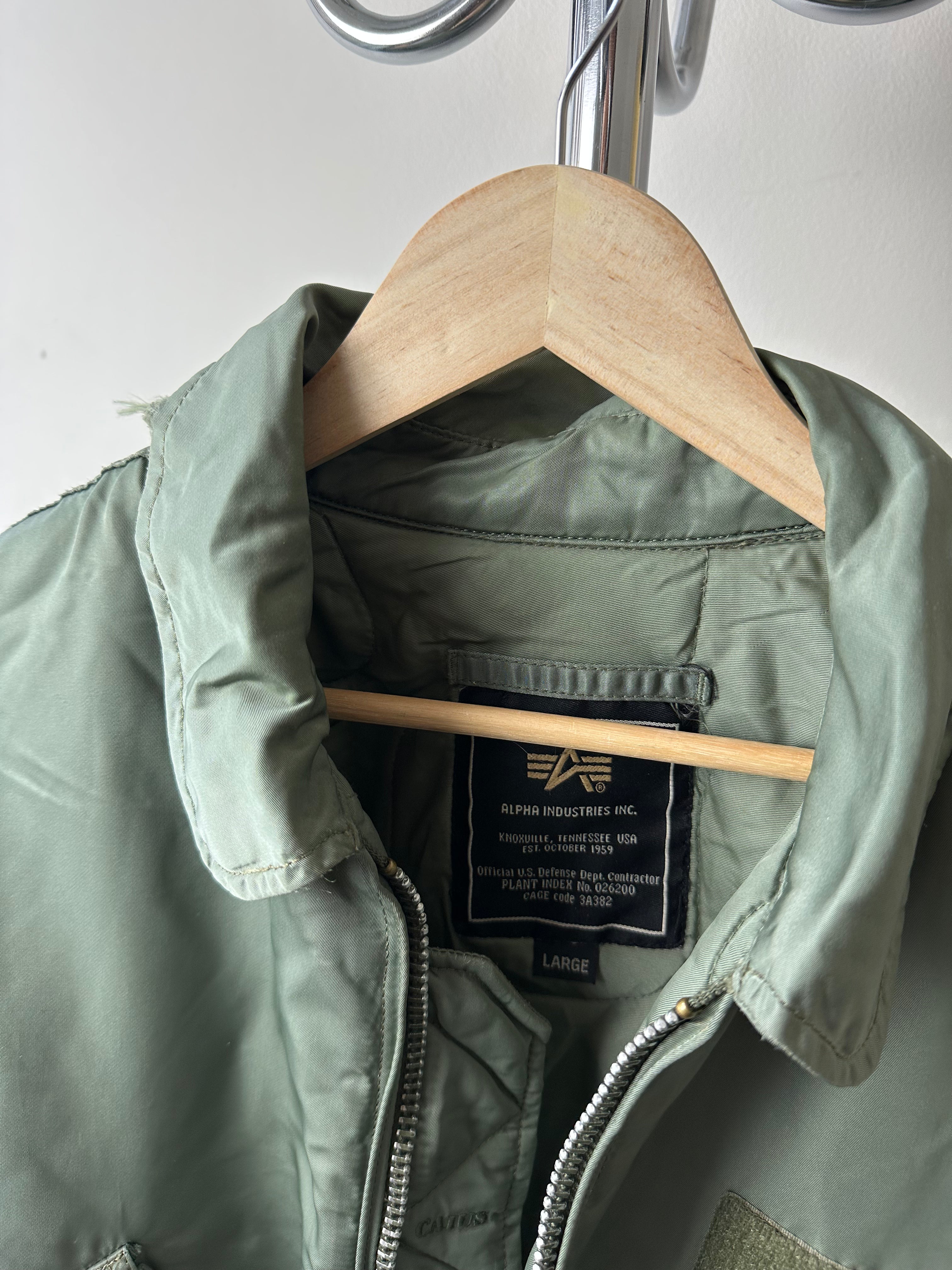 Lightweight vintage flight jacket by Alpha Industries, manufactured in the U.S. around the late 1980s–early 1990s. Constructed in durable sage-green nylon with heavy ribbed cuffs and waistband, sleeve utility pocket, and two front flap pockets.