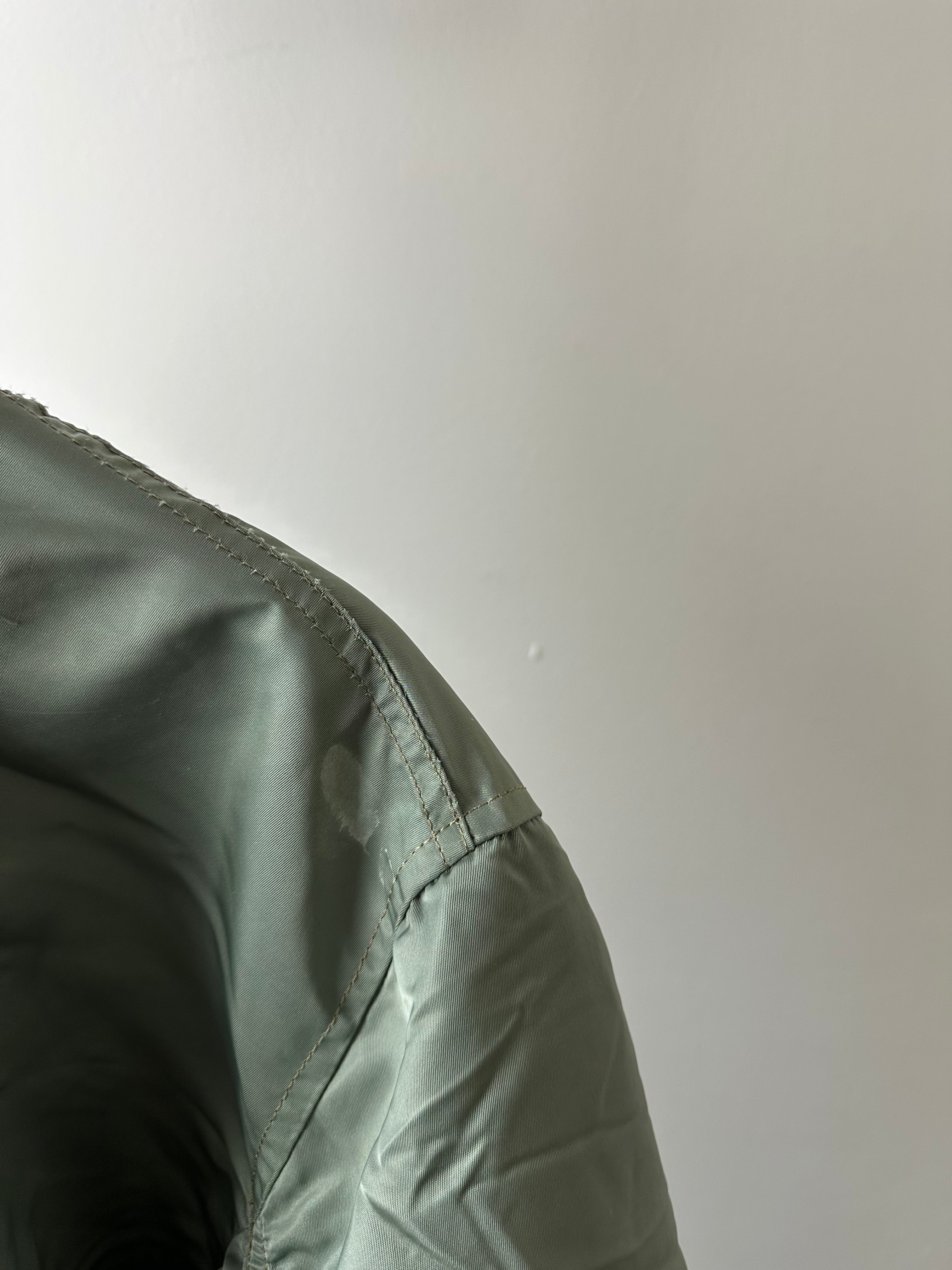 Originally designed for pilots in mild weather, the L-2B is a clean, minimal take on military outerwear — practical yet precise. The nylon has developed a soft patina and natural creasing that gives the jacket an unmistakable lived-in texture.