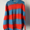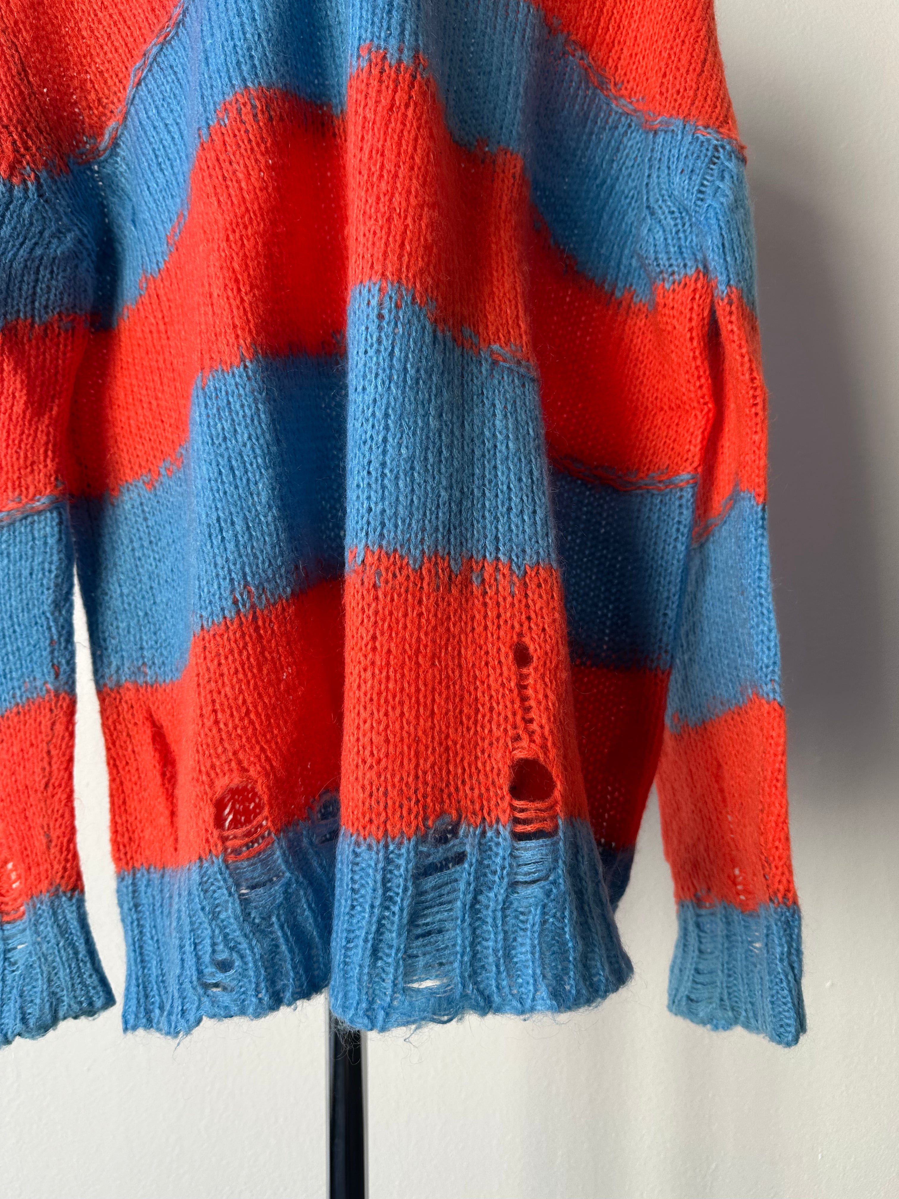 Woven in saturated stripes of electric red and washed-out cyan, the open-knit structure is full of tension: sheer in places, slashed at the hem, with loose threads and holes placed just-so. It feels disintegrated yet intentional — more sculpture than sweater.