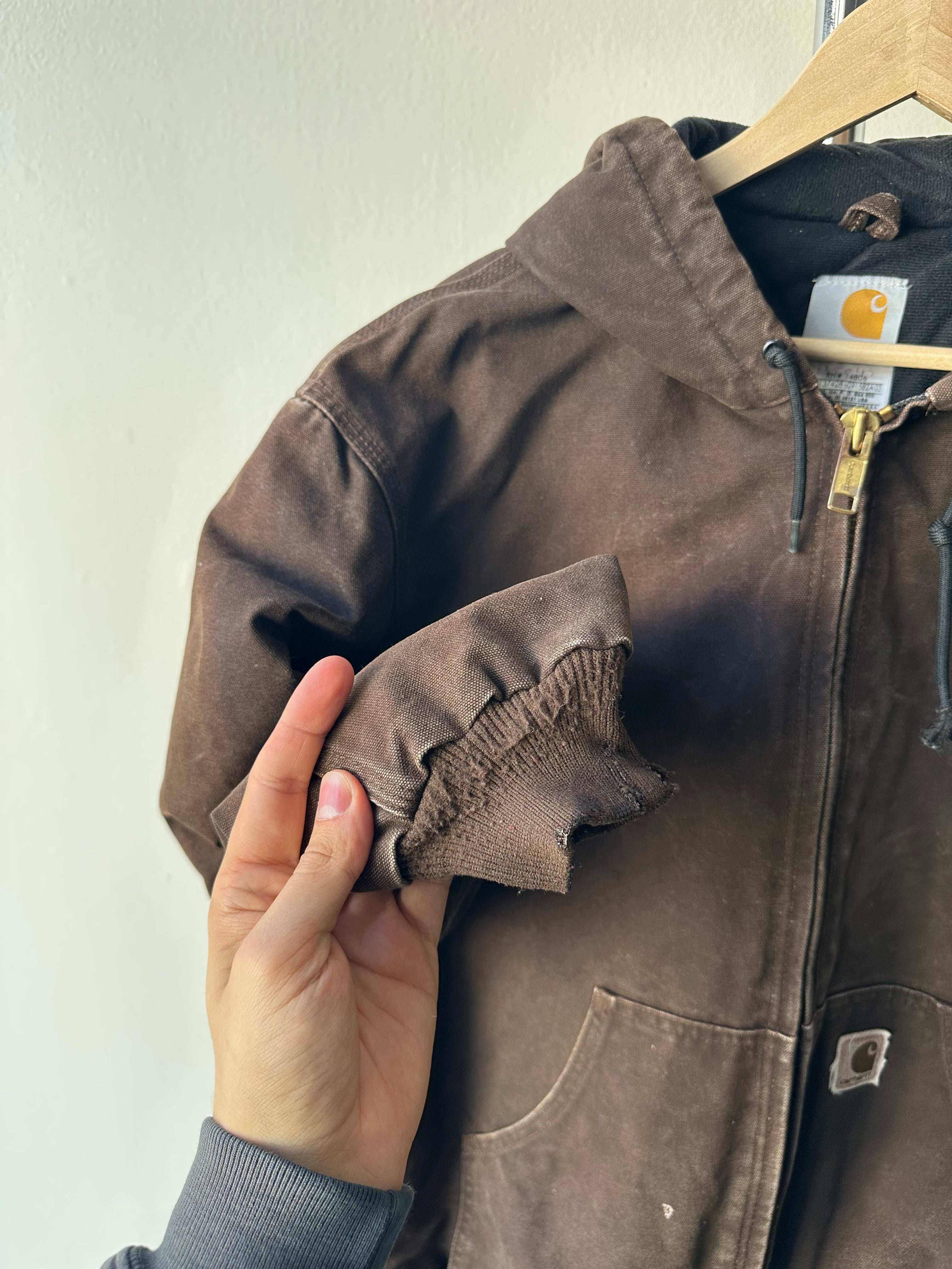 Classic J130 in the iconic Carhartt dark brown colorway. Heavy-duty canvas outer, quilted flannel lining, and signature triple stitching. Tagged Medium Regular, but fits closer to a relaxed medium or true large (see measurements). Heavily worn with all the right signs: paint splatters, fraying cuffs, faded patina — a true workwear soul piece.