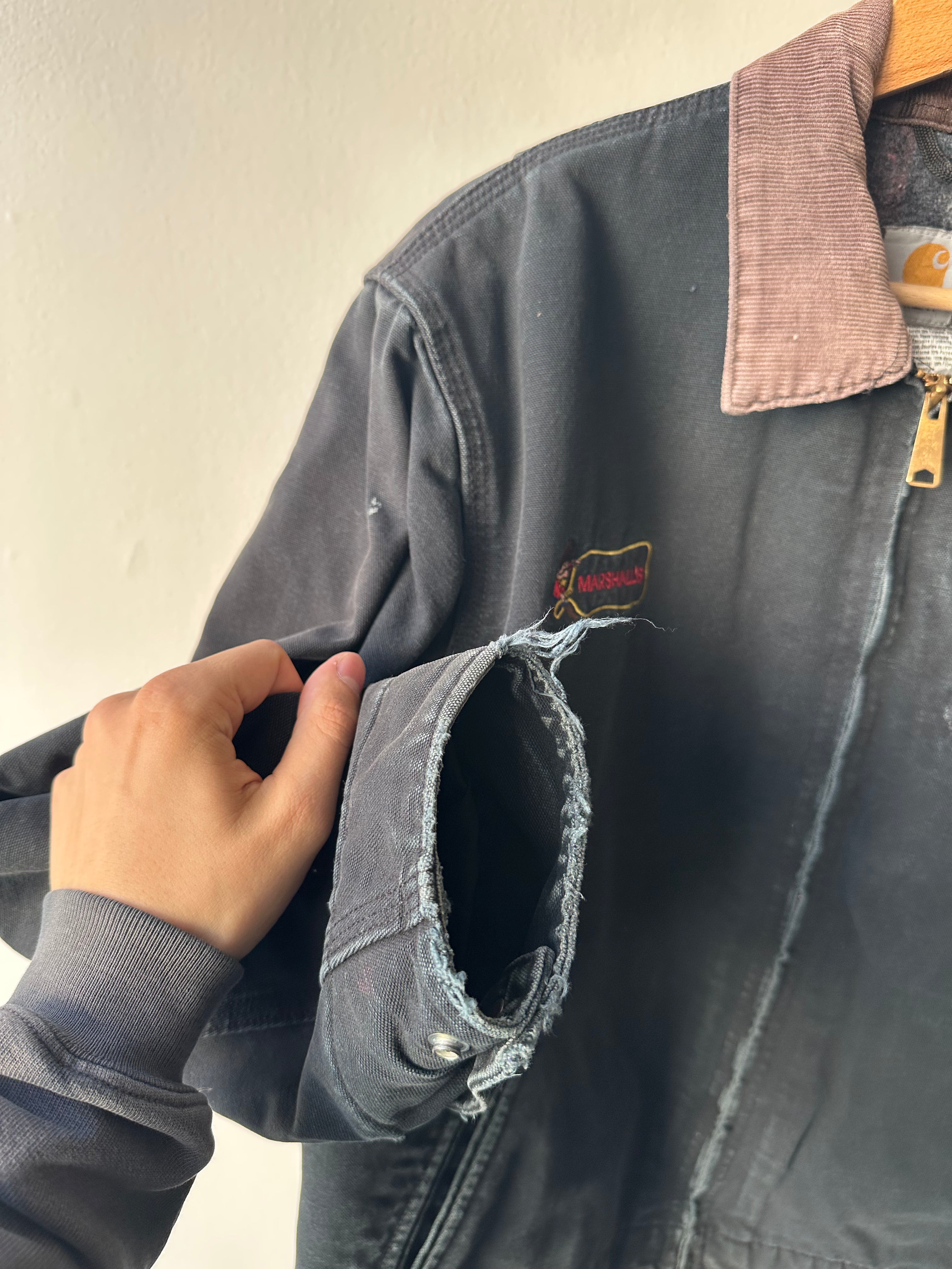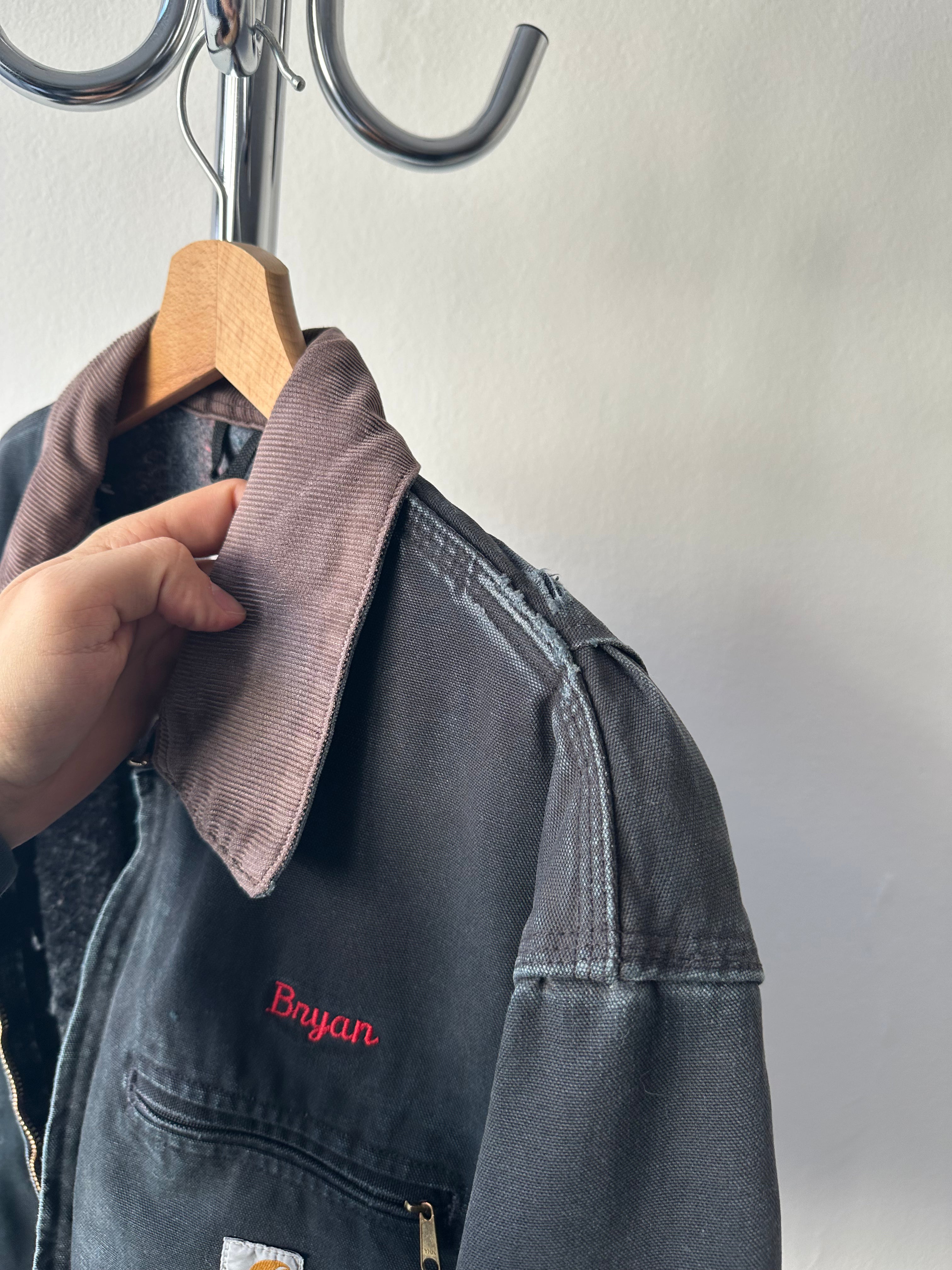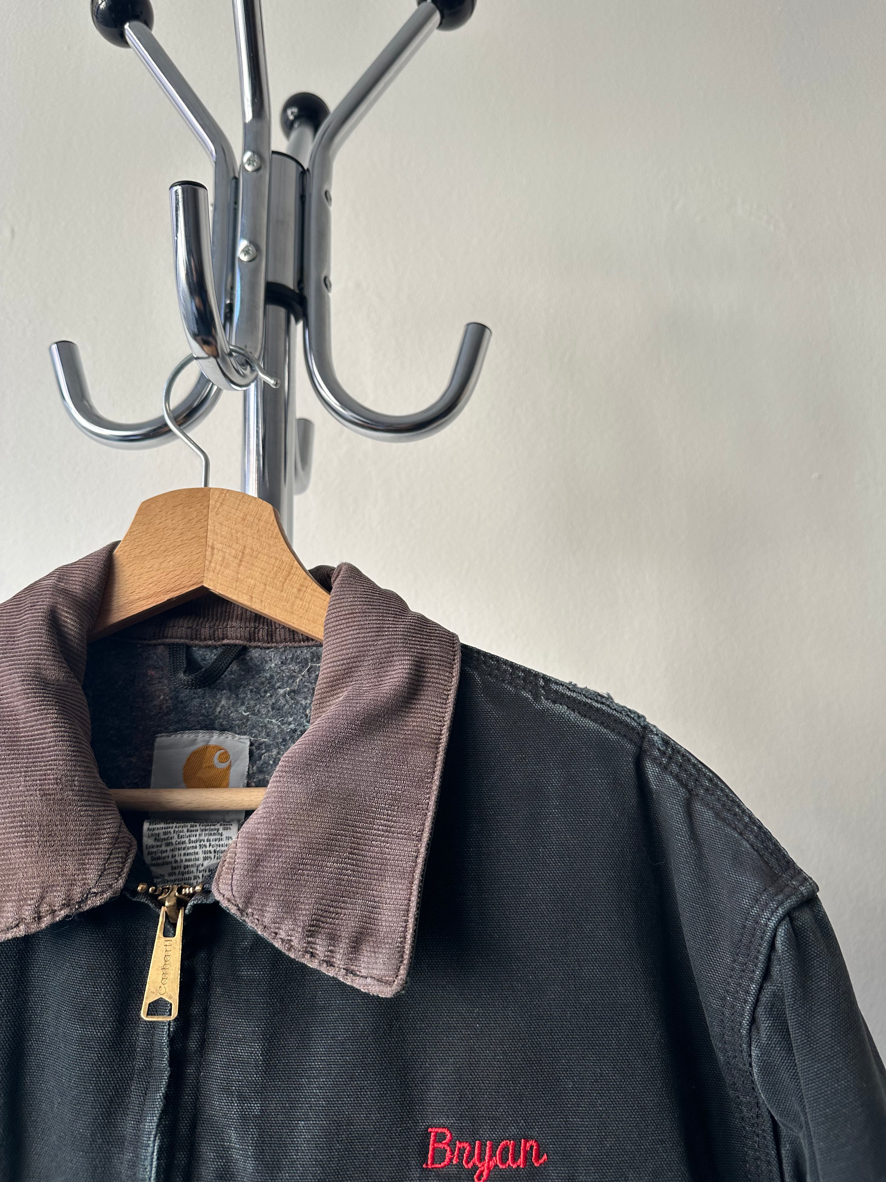 Worn, faded, and built like a tank. This Carhartt Detroit Jacket from 2004 comes in a well-aged black canvas with dusty brown corduroy collar and heavy-duty brass zipper. Personalized with original “Bryan” and “Marshall’s” embroidery on the chest. Triple-stitched for durability, blanket-lined for warmth.