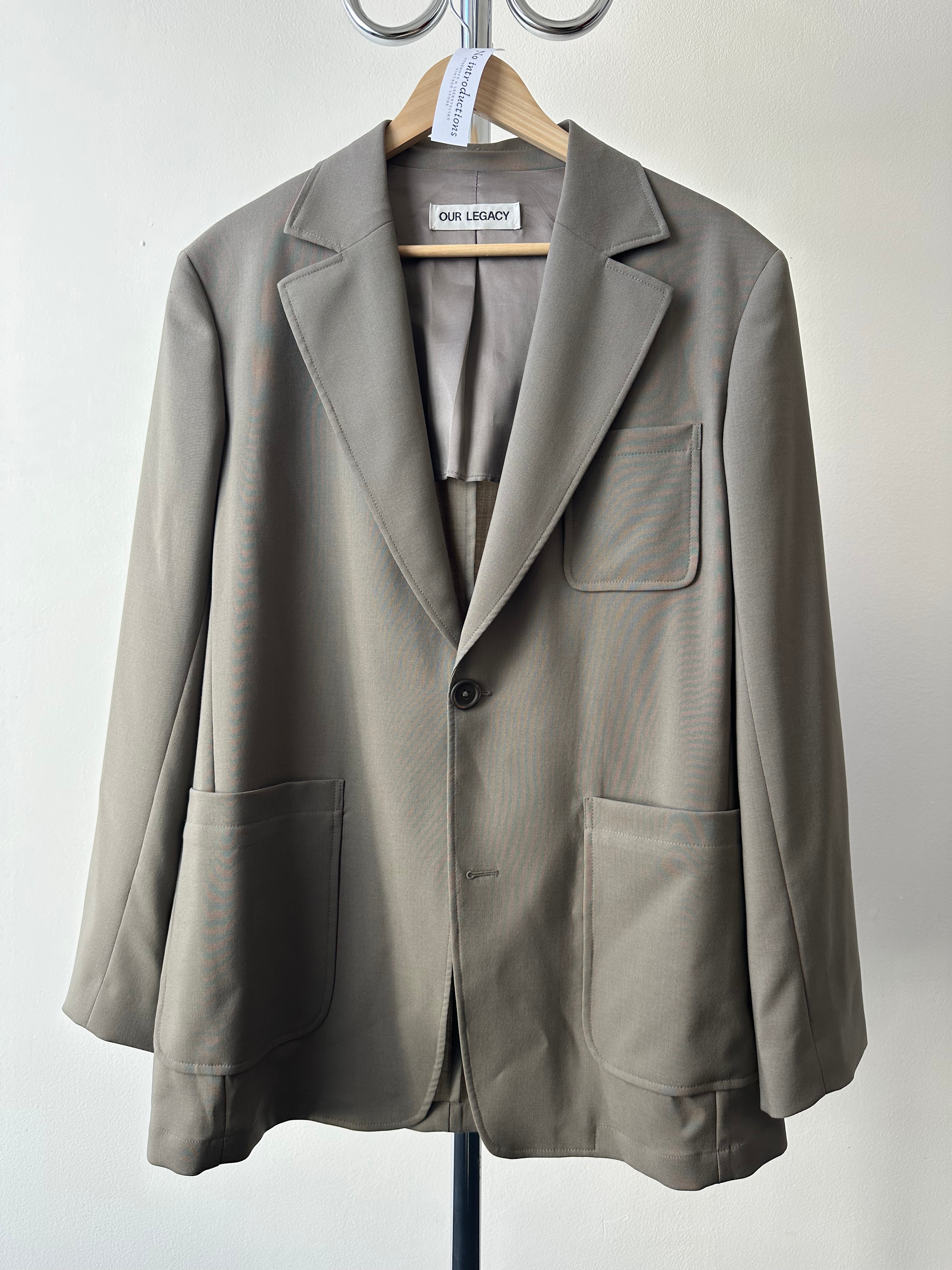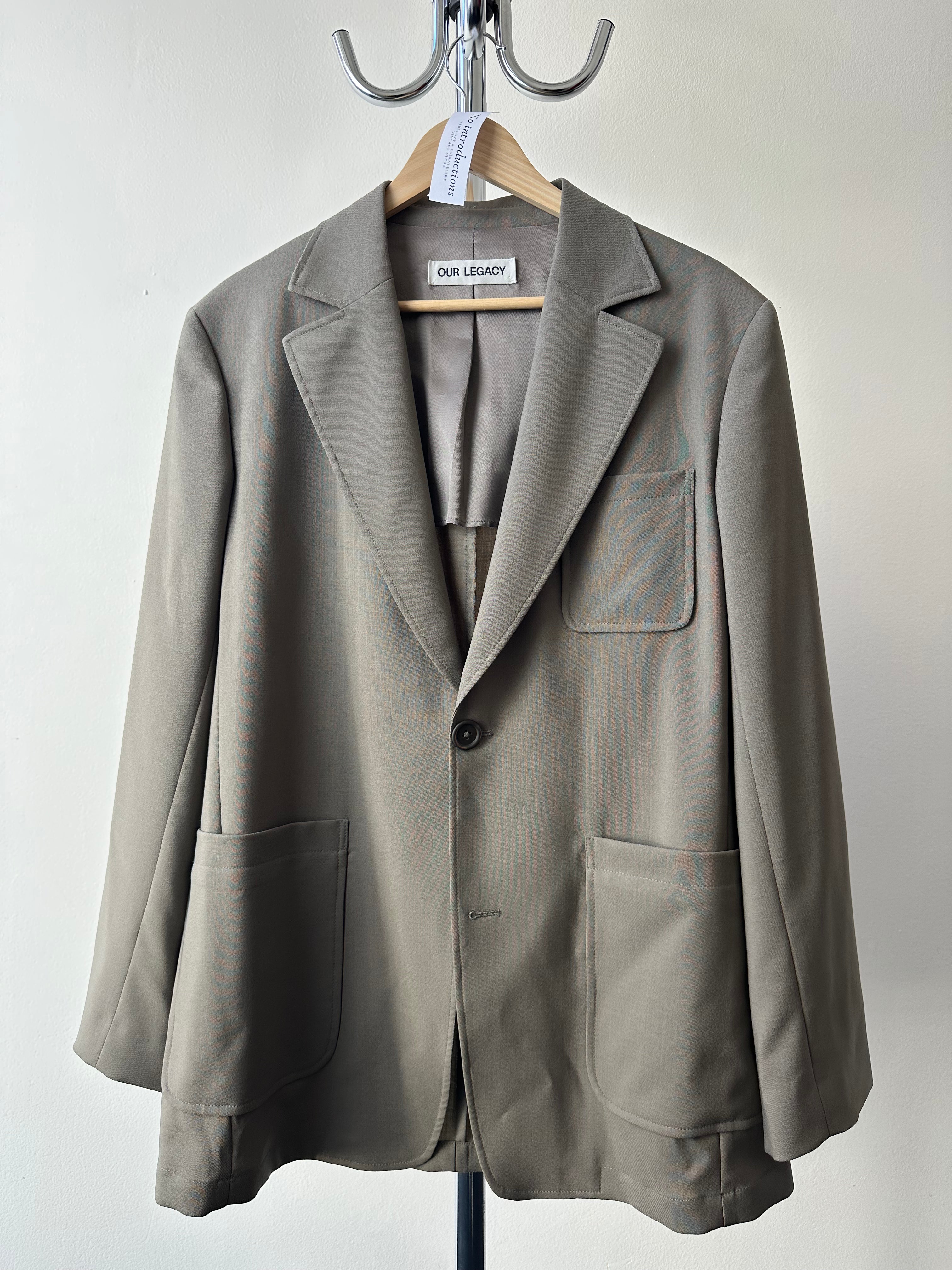 Our Legacy, tailoring unbuttoned. This blazer strips classic structure down to its essentials: single-breasted, soft shoulders, oversized patch pockets, and a relaxed drape. Cut in muted taupe-grey, it carries that Our Legacy balance of Scandinavian restraint and subtle subversion — formal lines reworked into something lived-in and unforced.