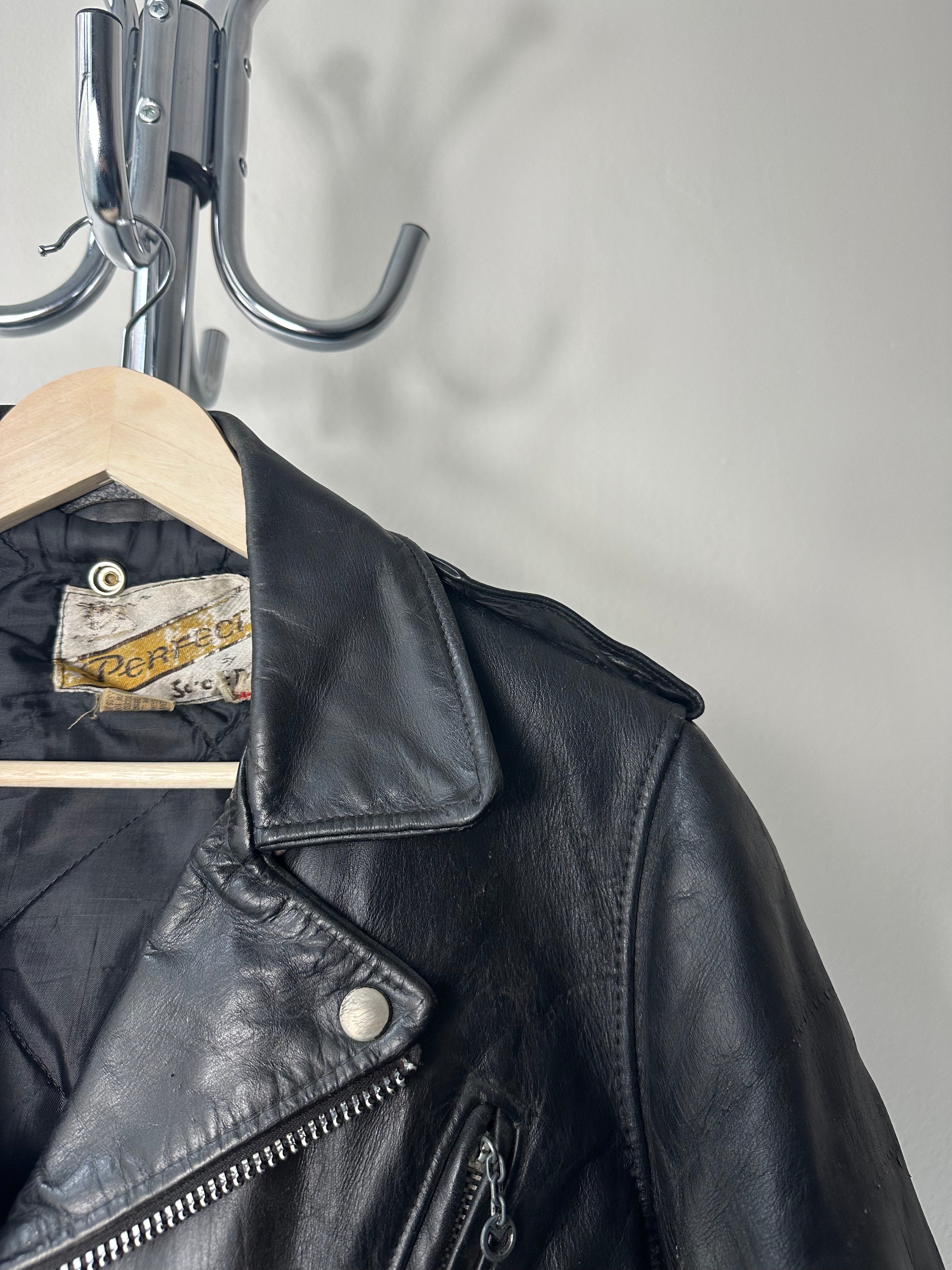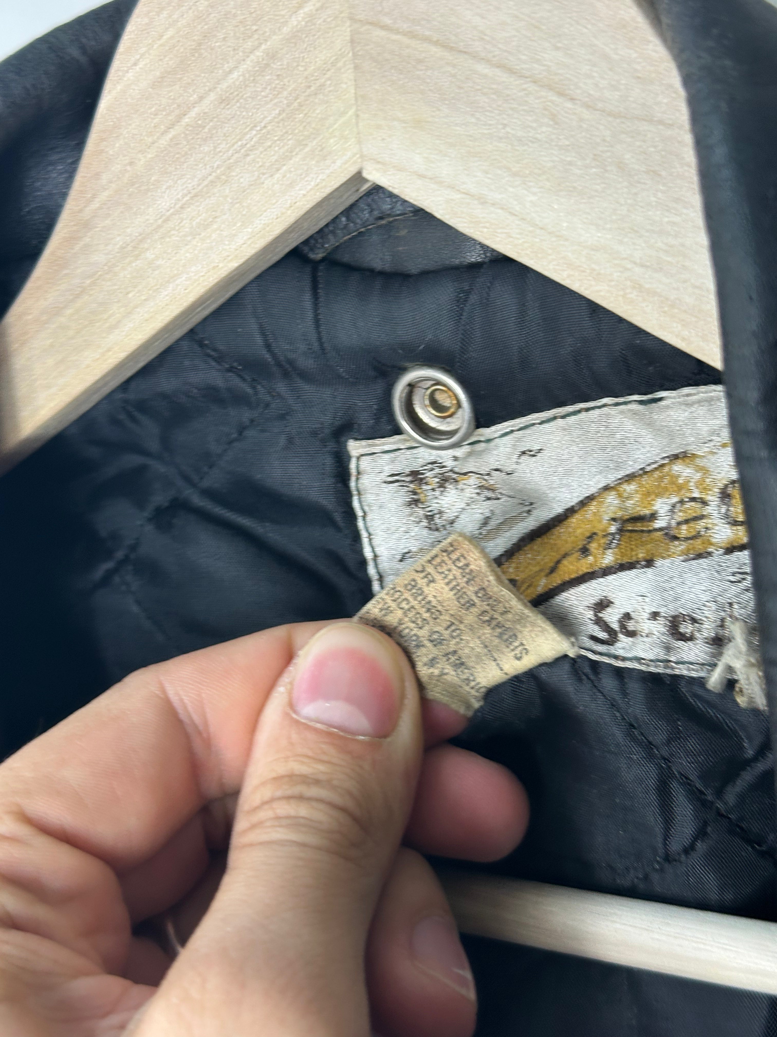 The original Perfecto by Schott label — with the black-and-gold script — is heavily worn but still intact, affirming its authentic mid-century roots. Quilted liner inside. One small tear on the back shoulder adds to the jacket’s storied character without affecting wearability.