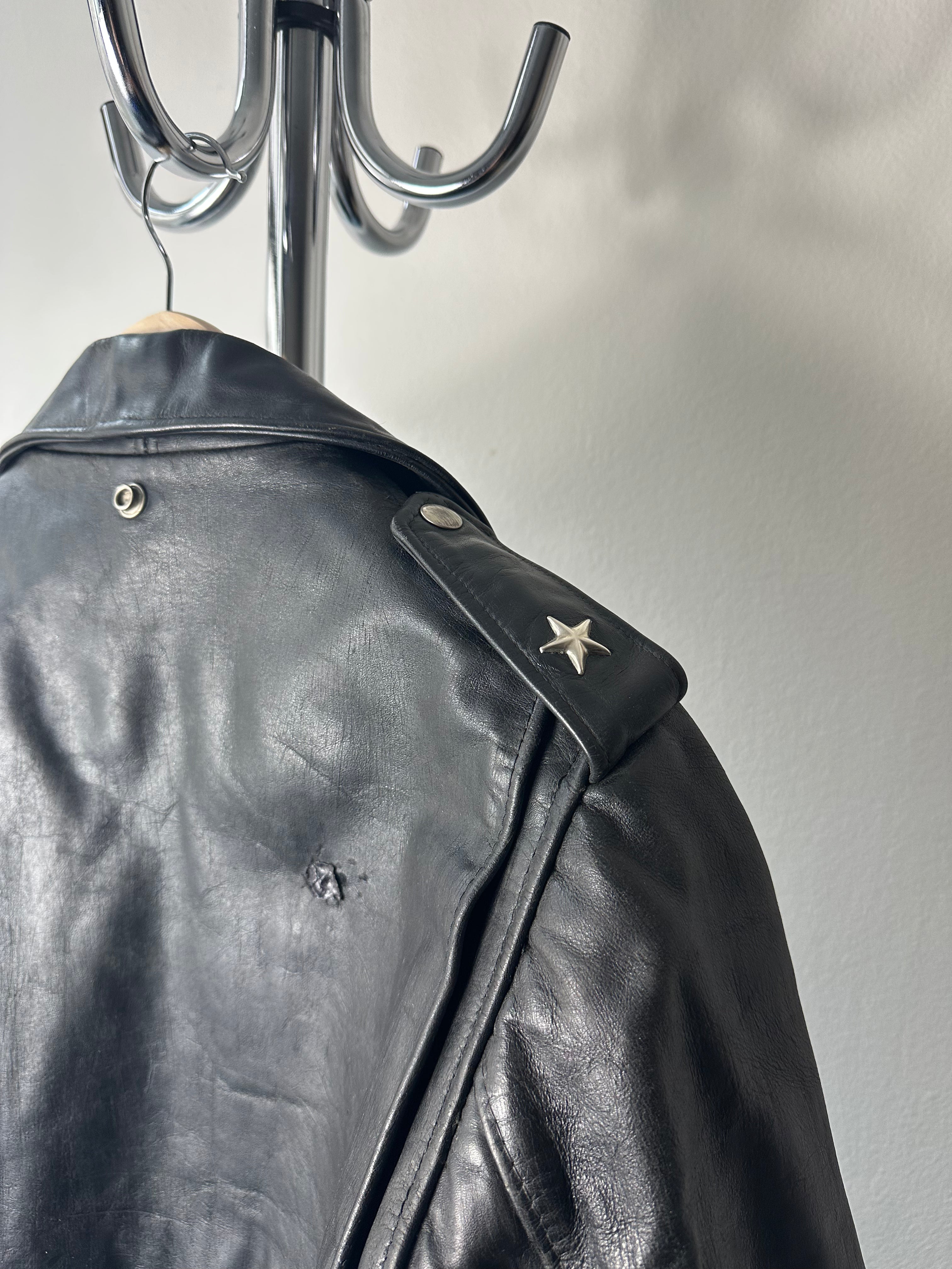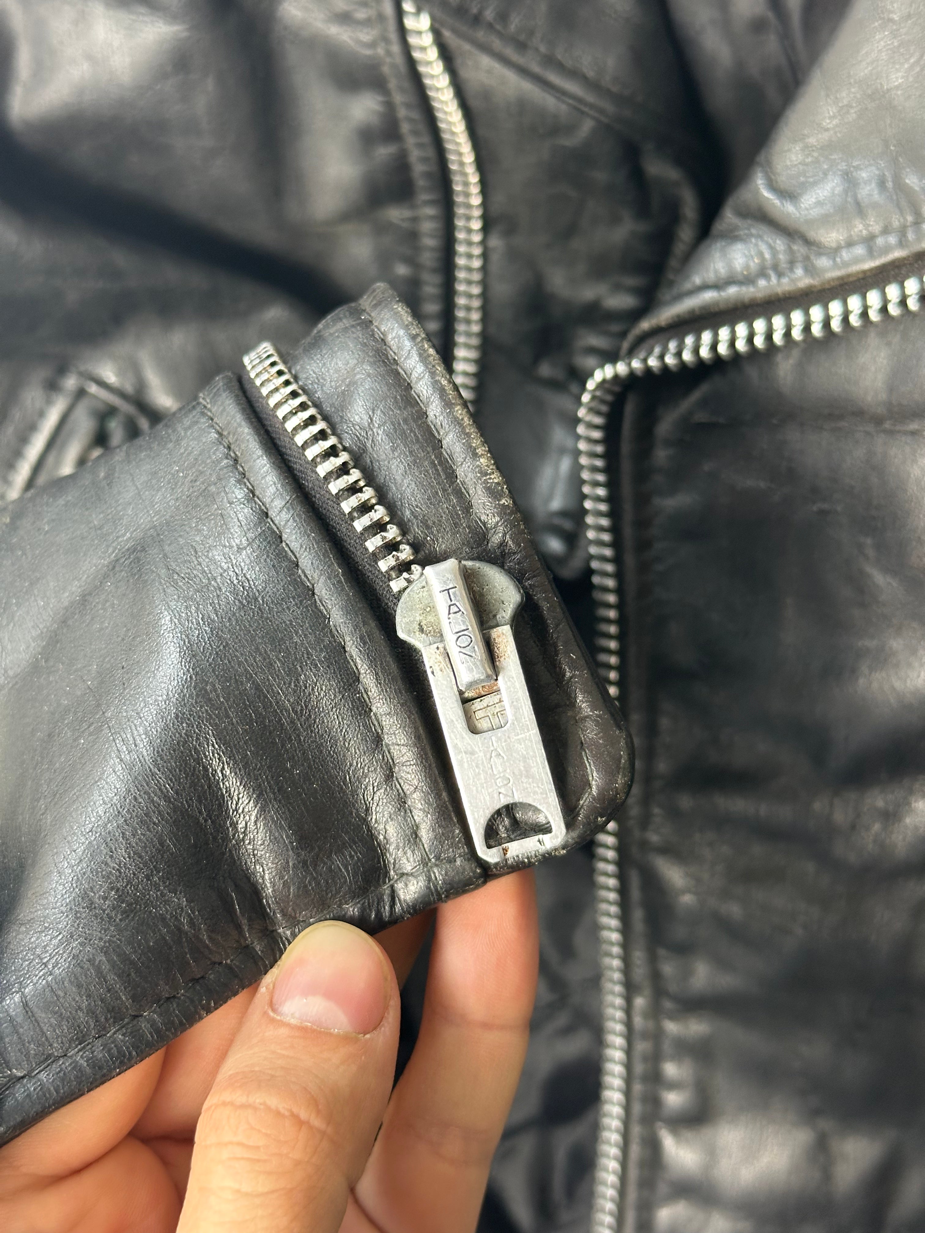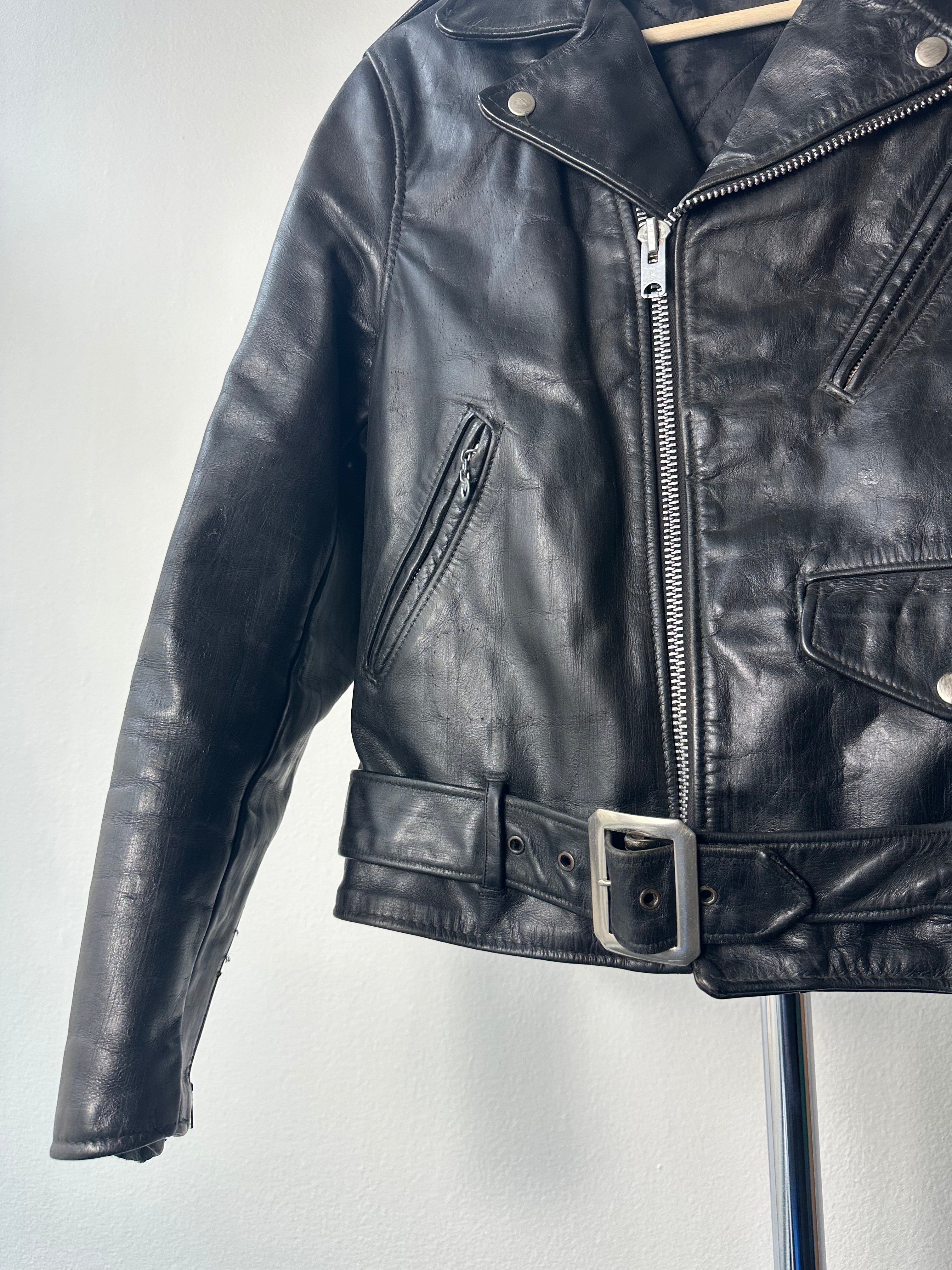 A true relic from the golden era of American motorcycle culture. This vintage Schott Perfecto jacket, dating from the late 1950s to early 1960s, is built from heavyweight black cowhide leather that has aged beautifully with deep creasing and patina. Features a thick, heavy-duty early Talon zipper at the front, classic epaulettes with original star studs, and a belted waist for that timeless rebel silhouette.
