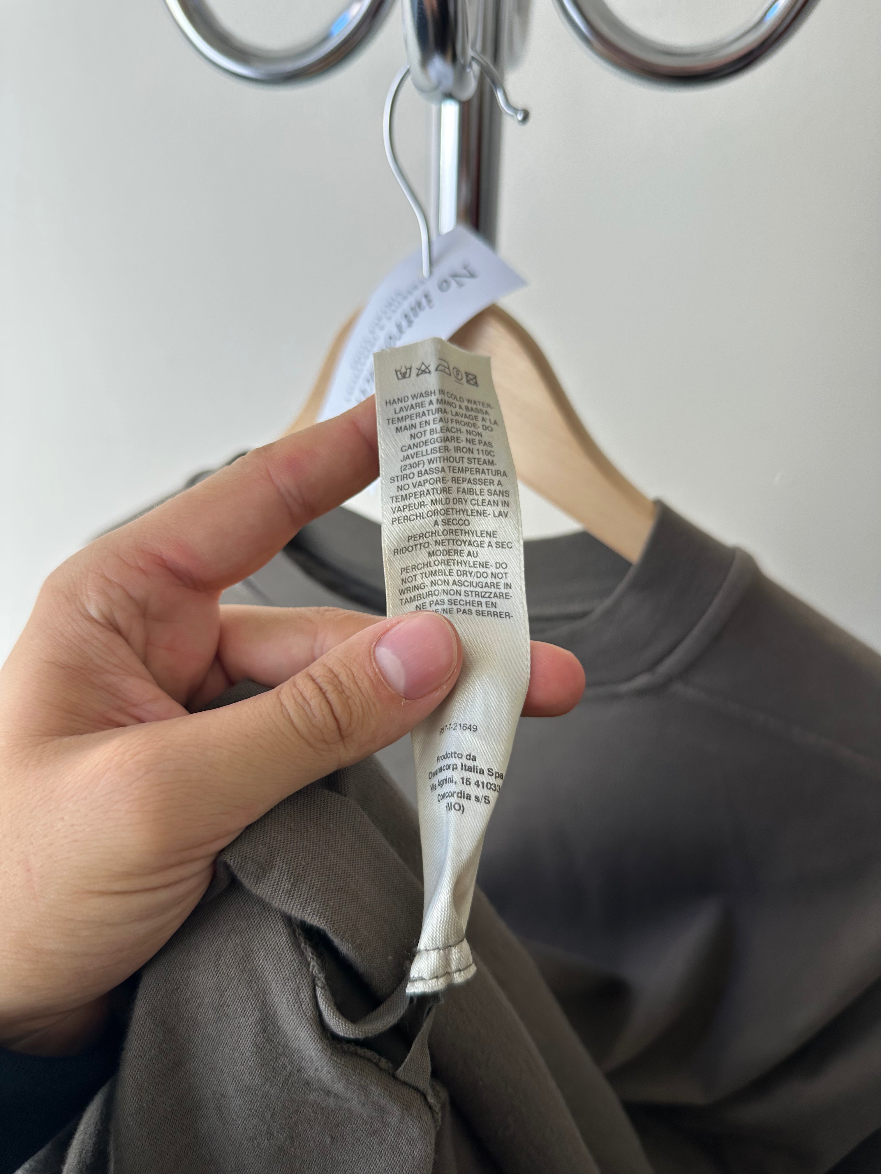 This version, in muted brown/grey tones, sits in that Owens palette of dust and shadow. A size S, but unmistakably cut to wear loose, falling long on the body with room in every seam. One of the designer’s most essential shapes, pared back yet unmistakably his.