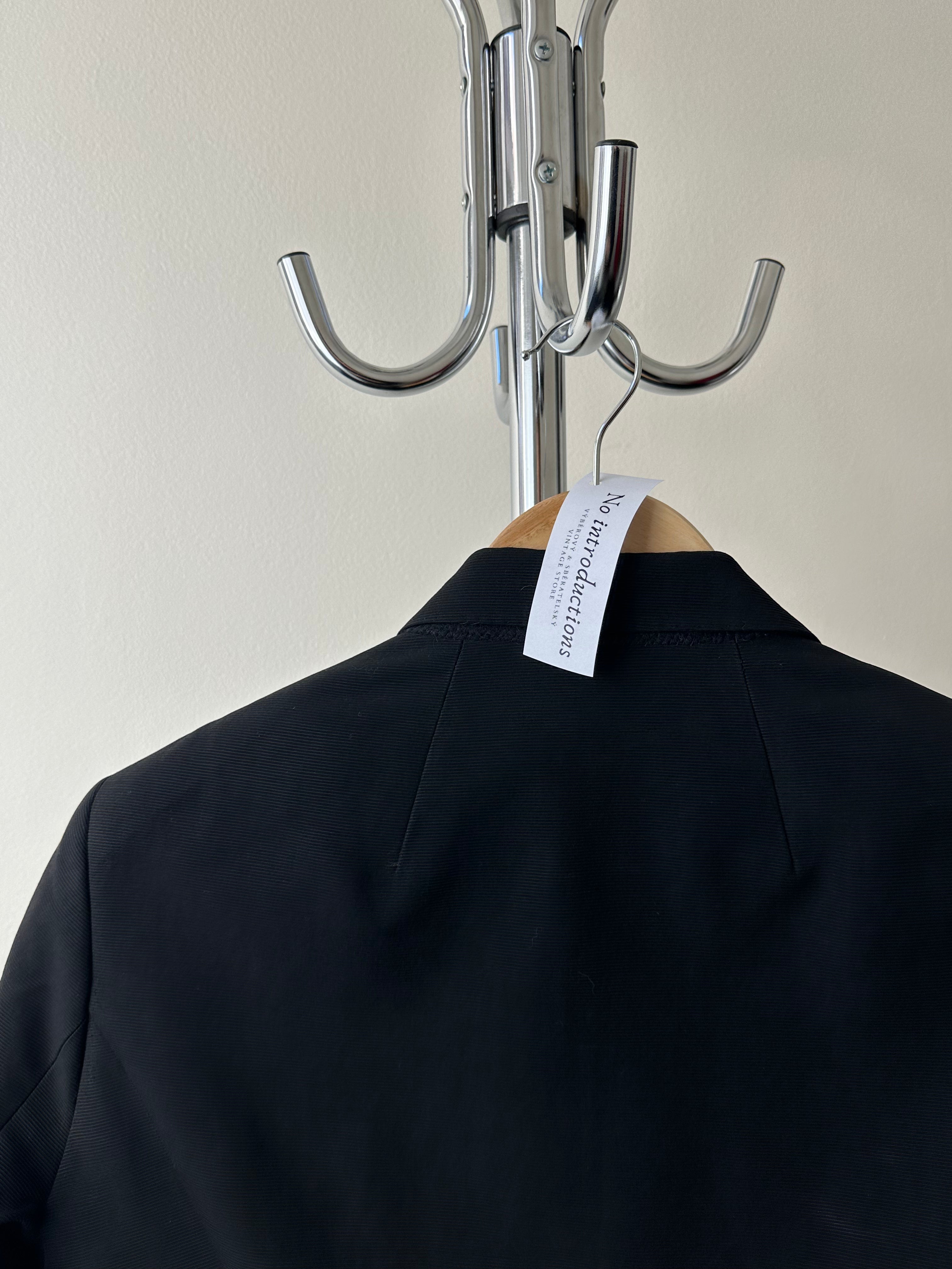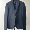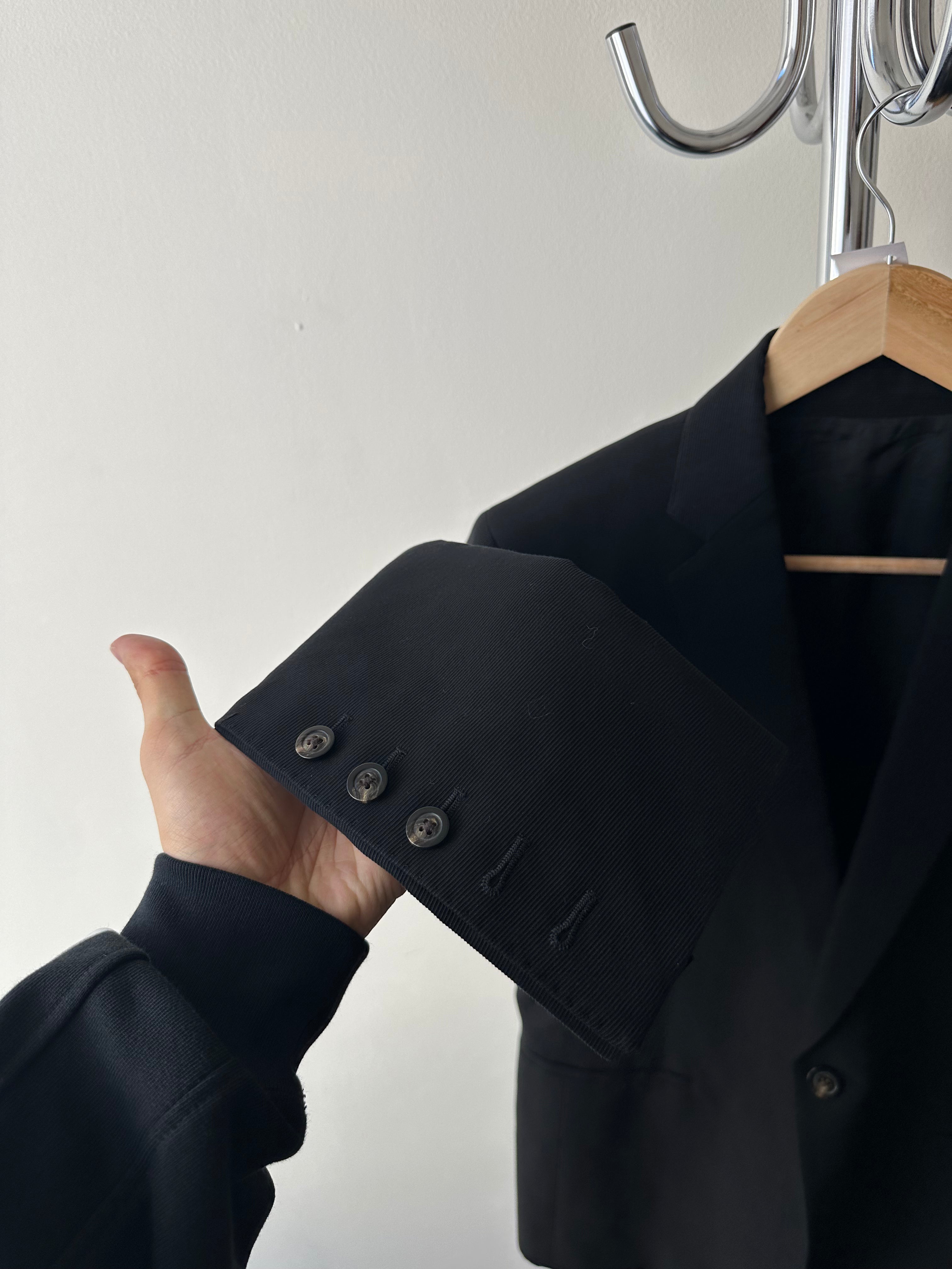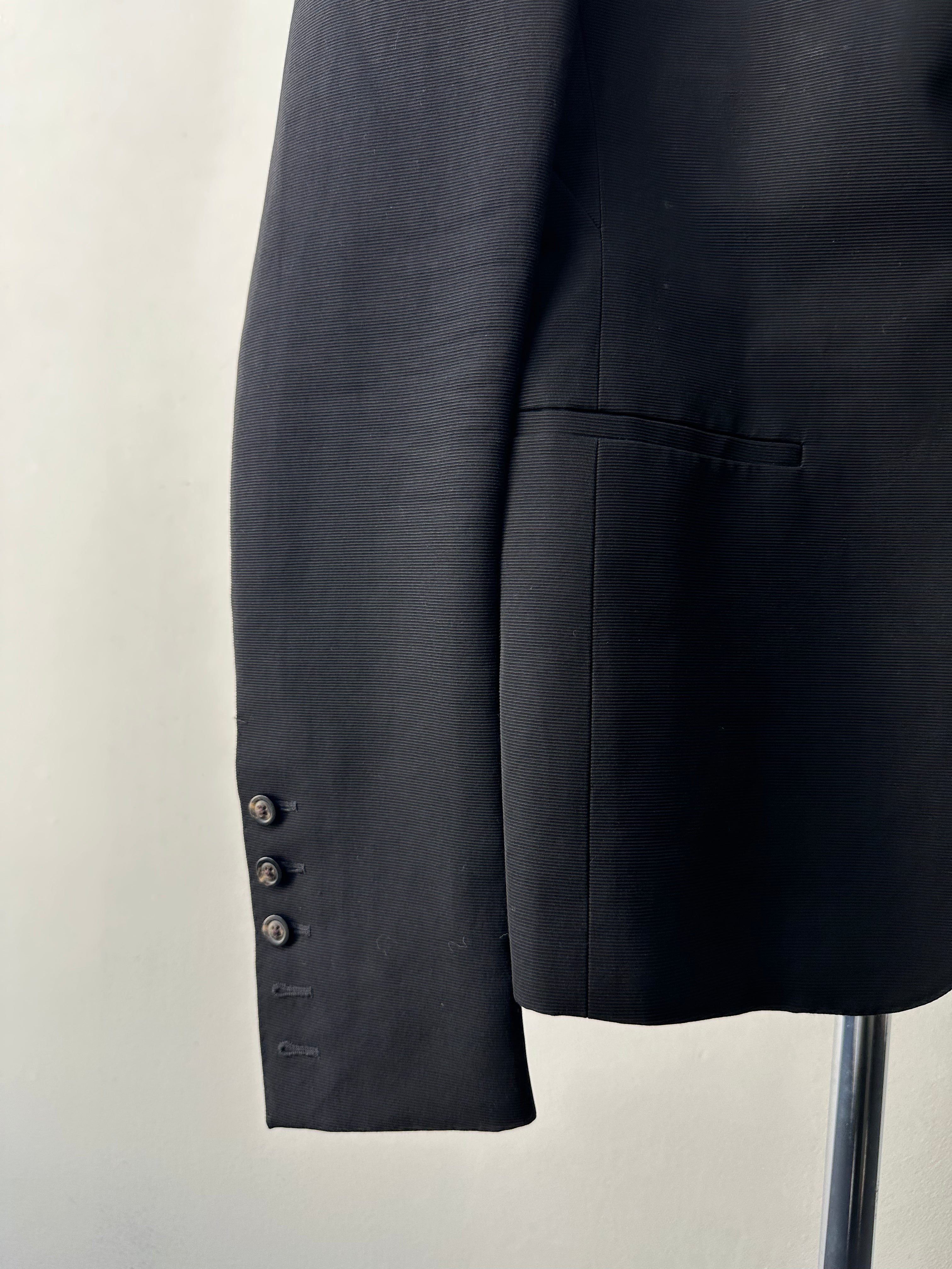 Rick Owens Dirt SS16 — tailored restraint. From the Spring/Summer 2016 Dirt collection, this blazer distills Owens’ language of sharp geometry and muted tonality. Cut in deep black with a subtle textured weave, it balances strict tailoring with the collection’s grounded, almost ascetic mood. Slim lapels, a single-breasted front, and sculpted shoulders mark it as formal, yet the fabric’s irregular texture softens the silhouette into something elemental.