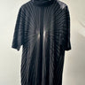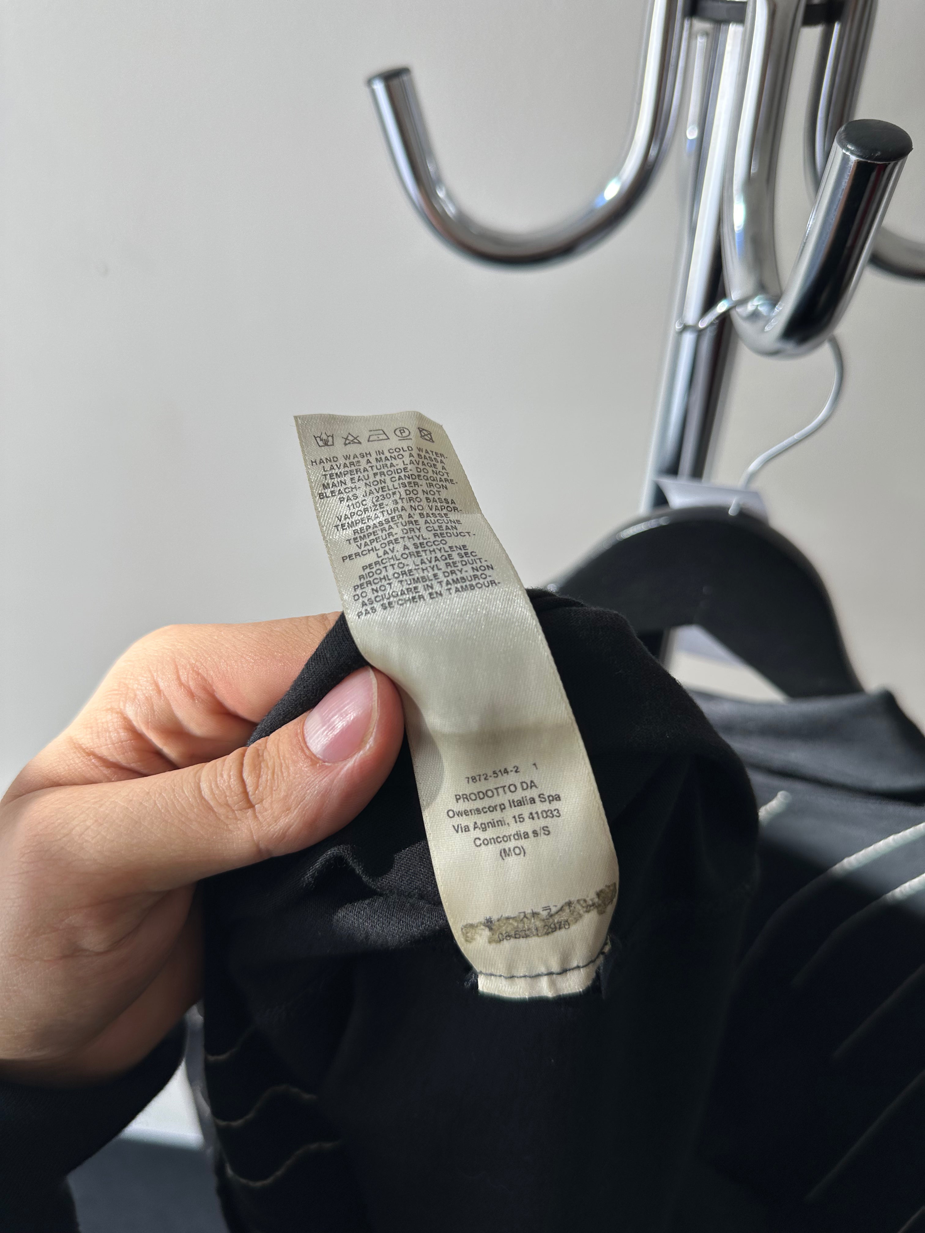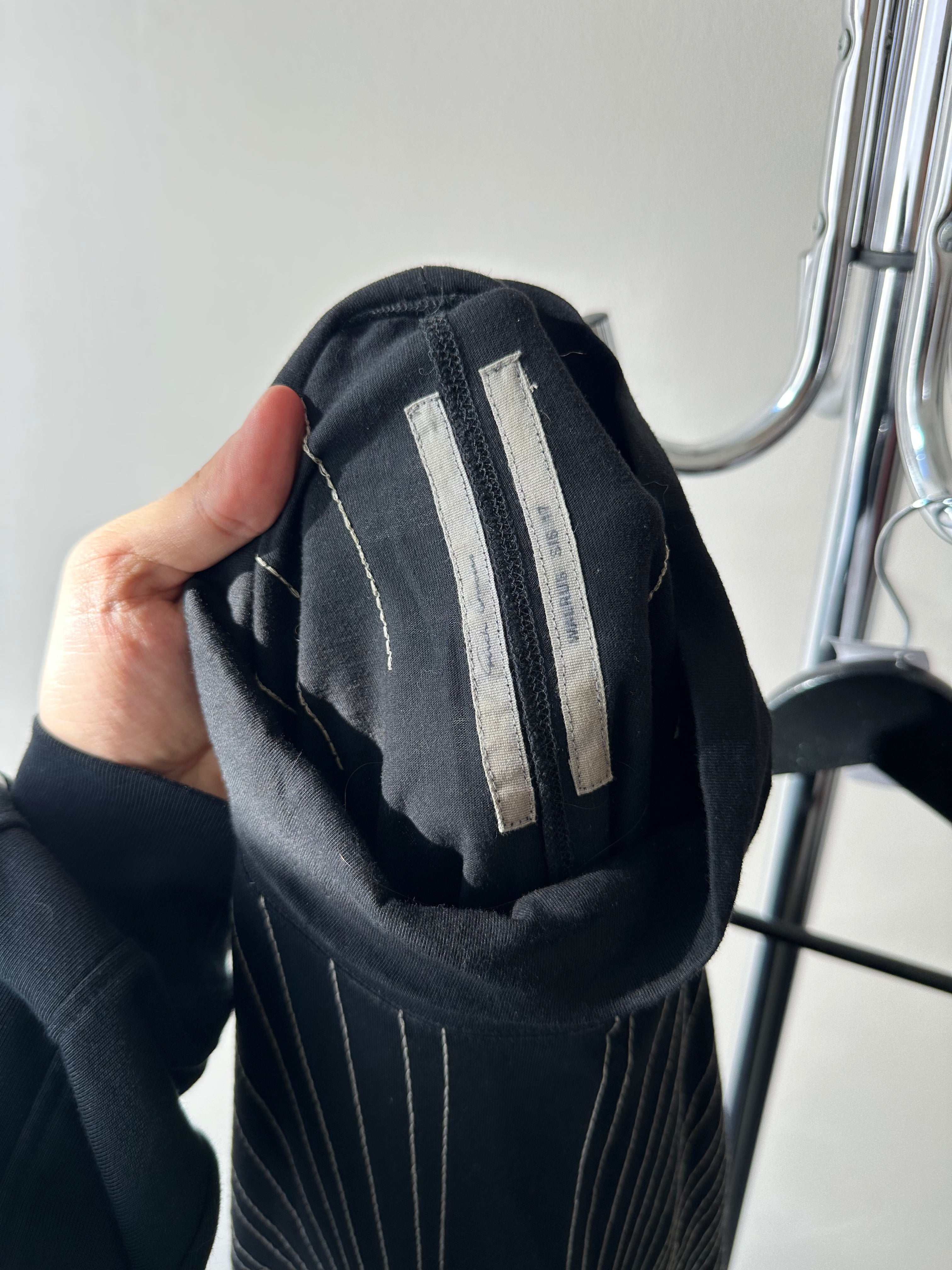 Rick Owens Walrus SS17 — starburst longline tee. From the Spring/Summer 2017 Walrus collection, this piece carries one of the season’s defining graphics: the radiating starburst, bursting outward across the chest and back. Cut in flowing black jersey with an elongated silhouette and high neckline, it reflects Walrus’s play with volume, distortion, and light.