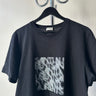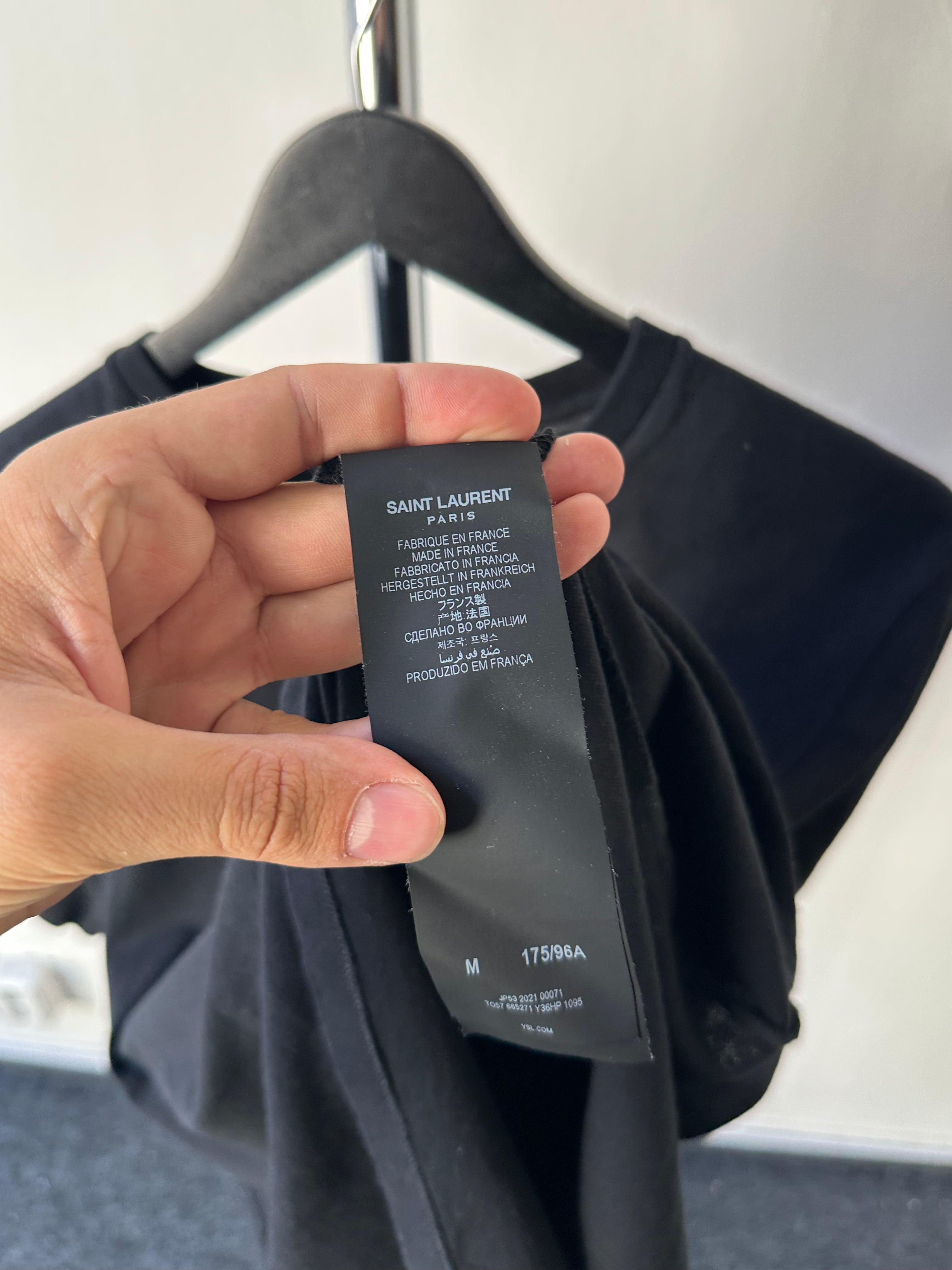 A crisp black tee elevated by distortion. This Saint Laurent piece plays with perception through a layered, optical-style graphic — a stacked Saint Laurent wordmark that shifts with every glance. The print feels equal parts vintage concert tee and contemporary design object.