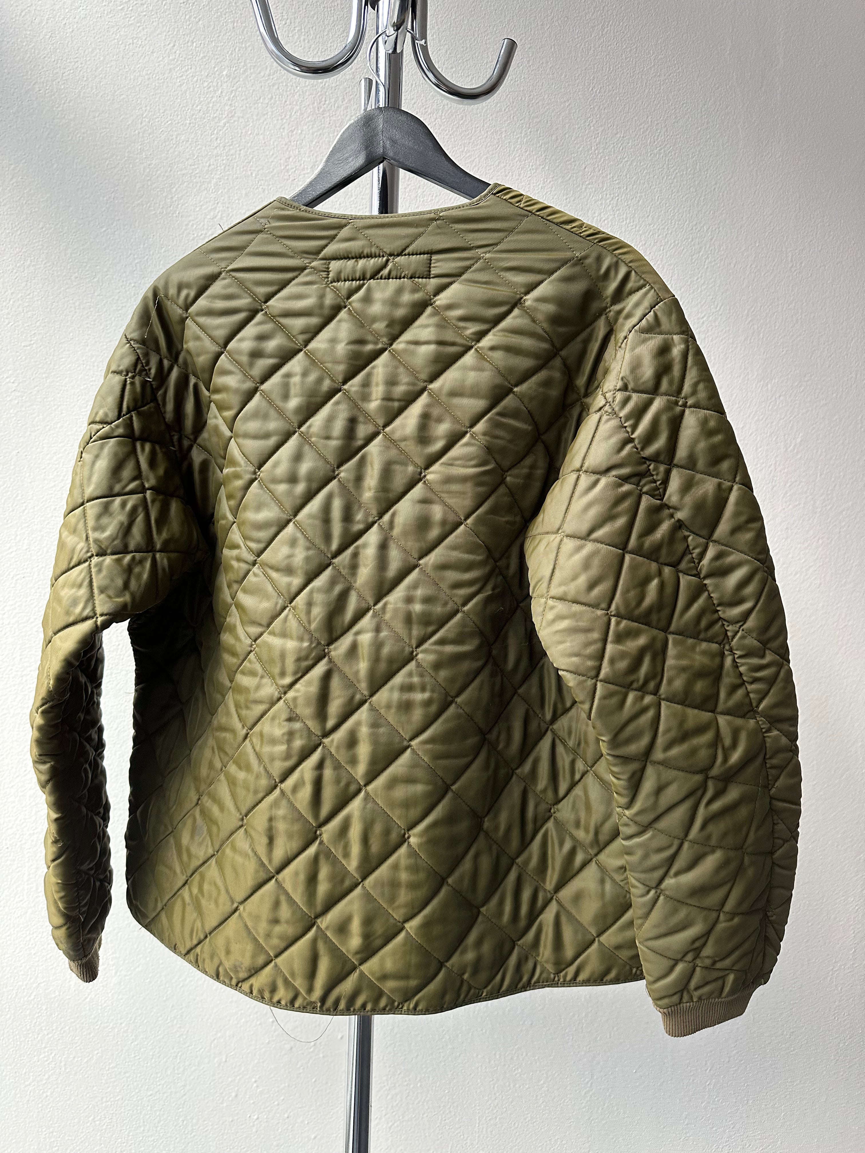 This is a vintage 1971 Dutch Military Quilted Liner Jacket, originally designed as an inner layer for military cold-weather gear but now highly sought after for its utilitarian style