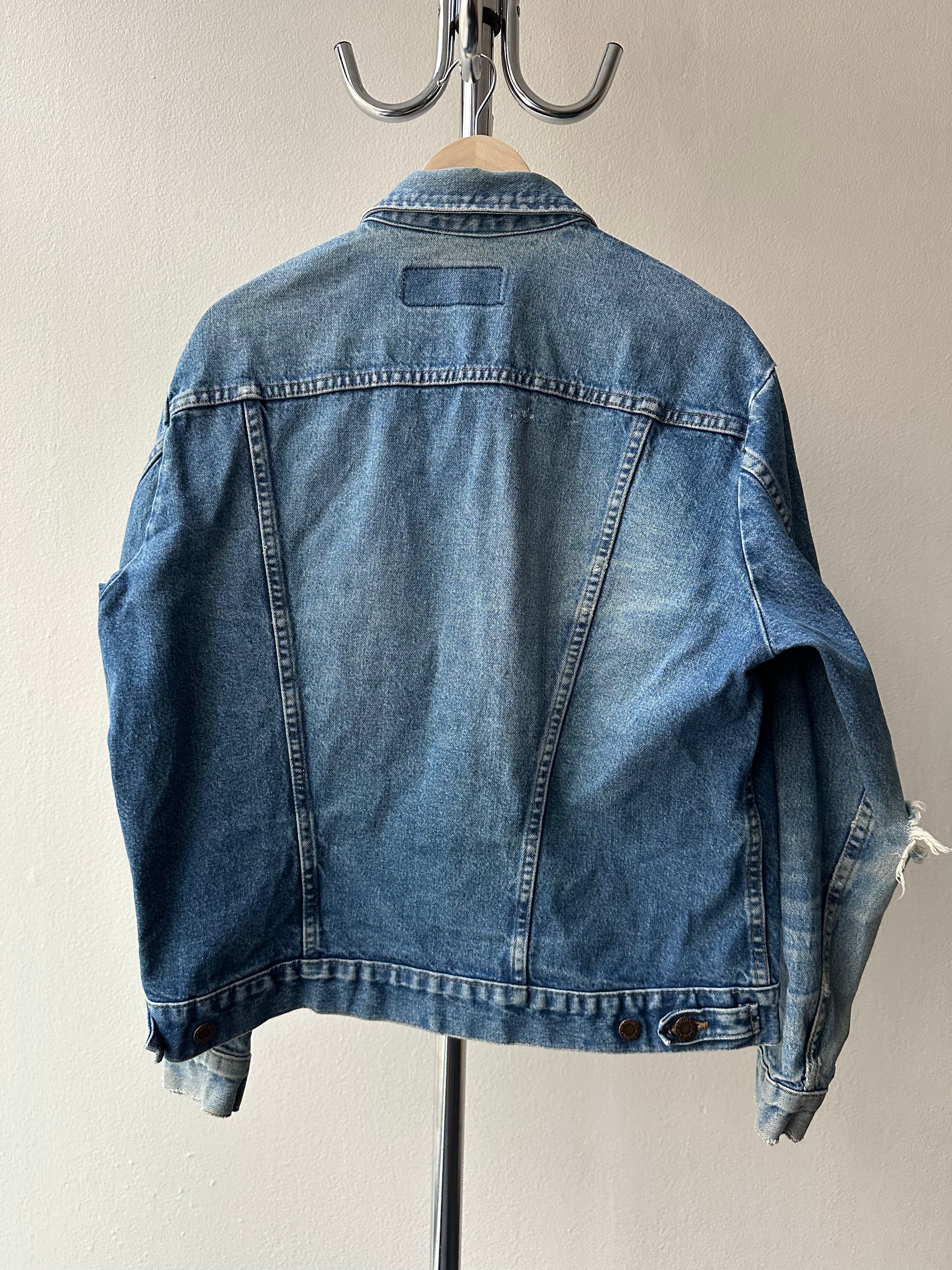 This vintage Wrangler denim jacket, from the 1970s or very early 1980s, embodies classic Western workwear style with its rugged fade, contrast stitching, and signature Wrangler chest embroidery