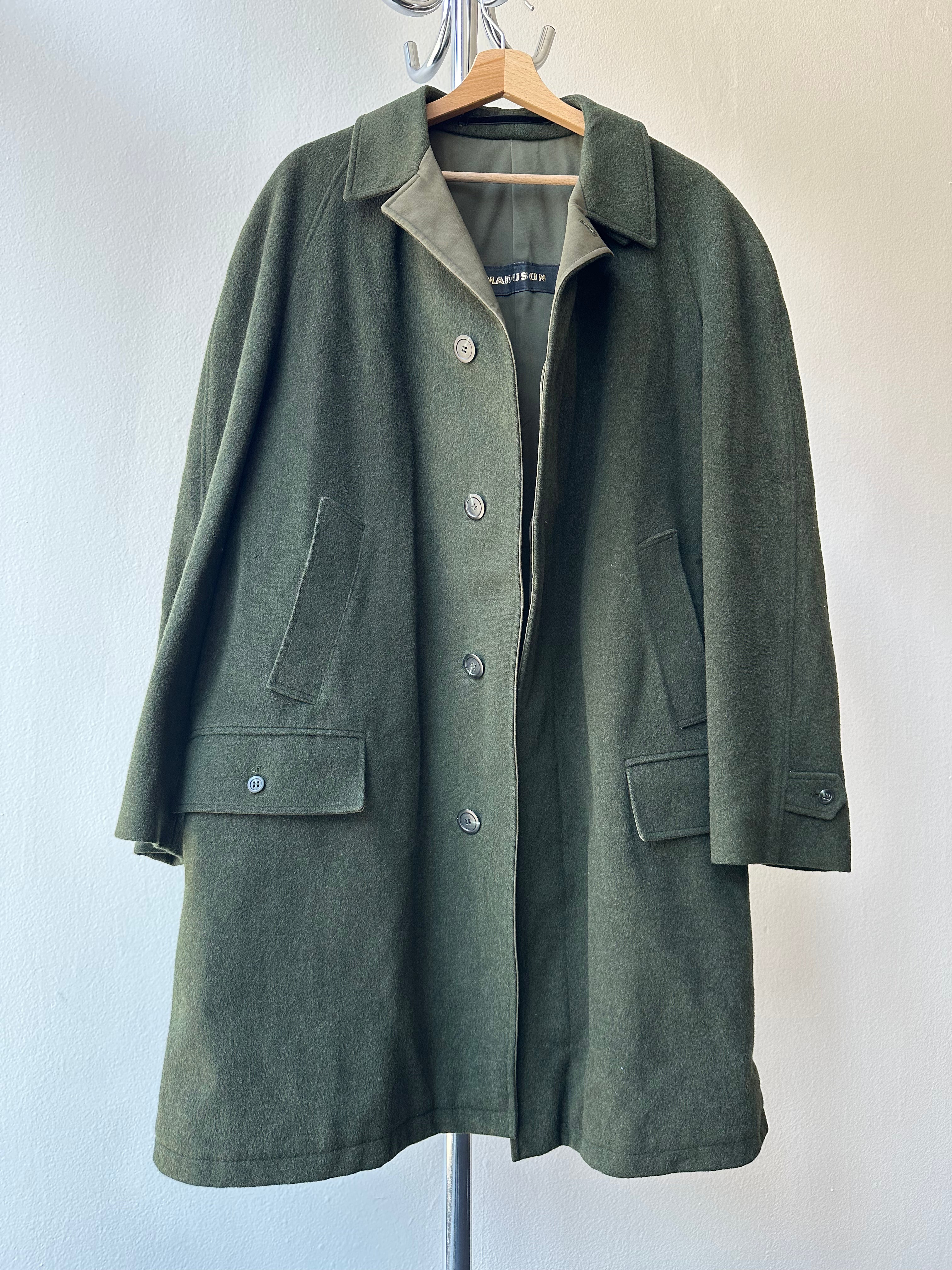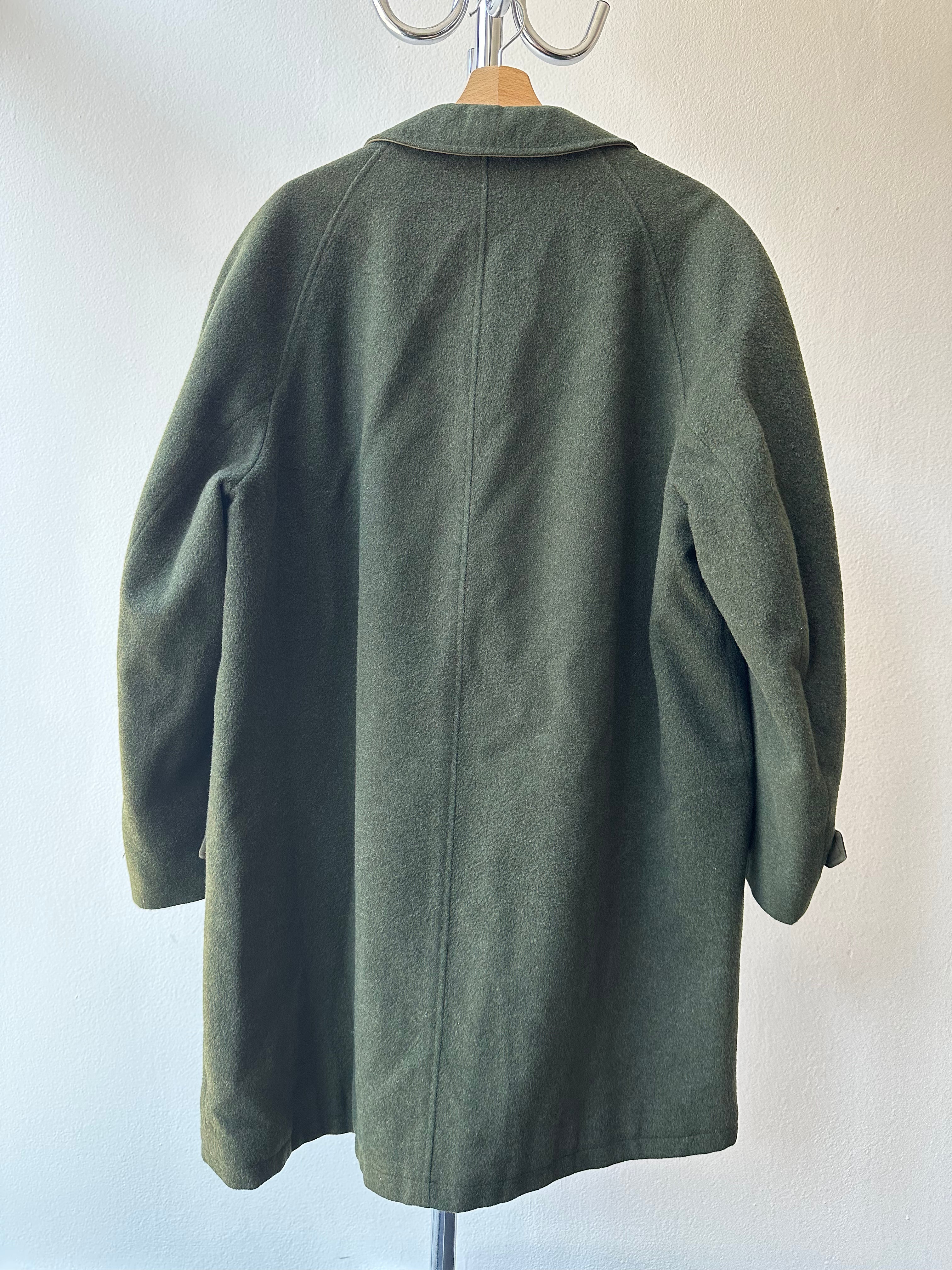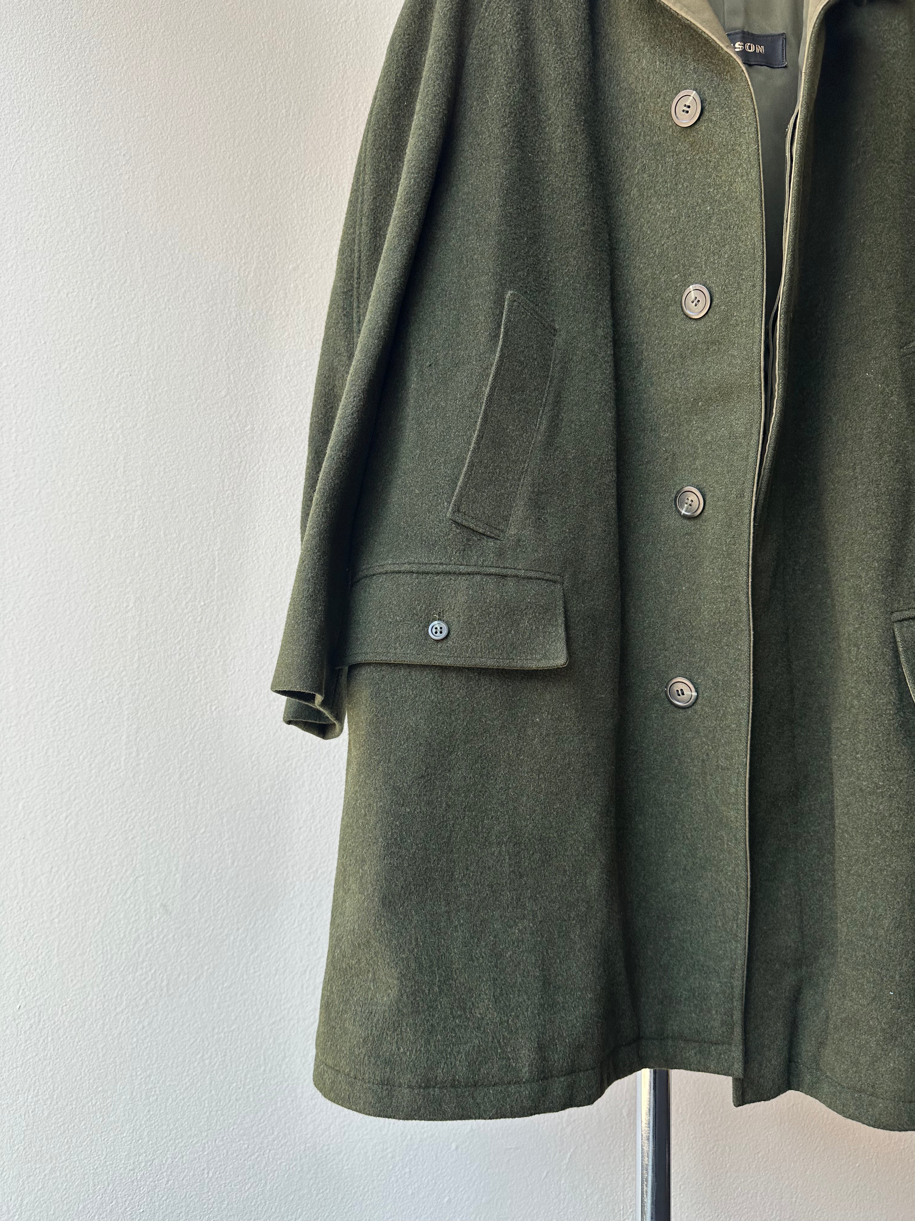 This vintage military overcoat is a testament to enduring craftsmanship and functional design. Constructed from pure new wool, it offers both warmth and structure, making it a staple for cold weather. The deep olive green color and classic oversized fit echo decades of military heritage, while the raglan sleeves allow for a comfortable yet commanding silhouette.