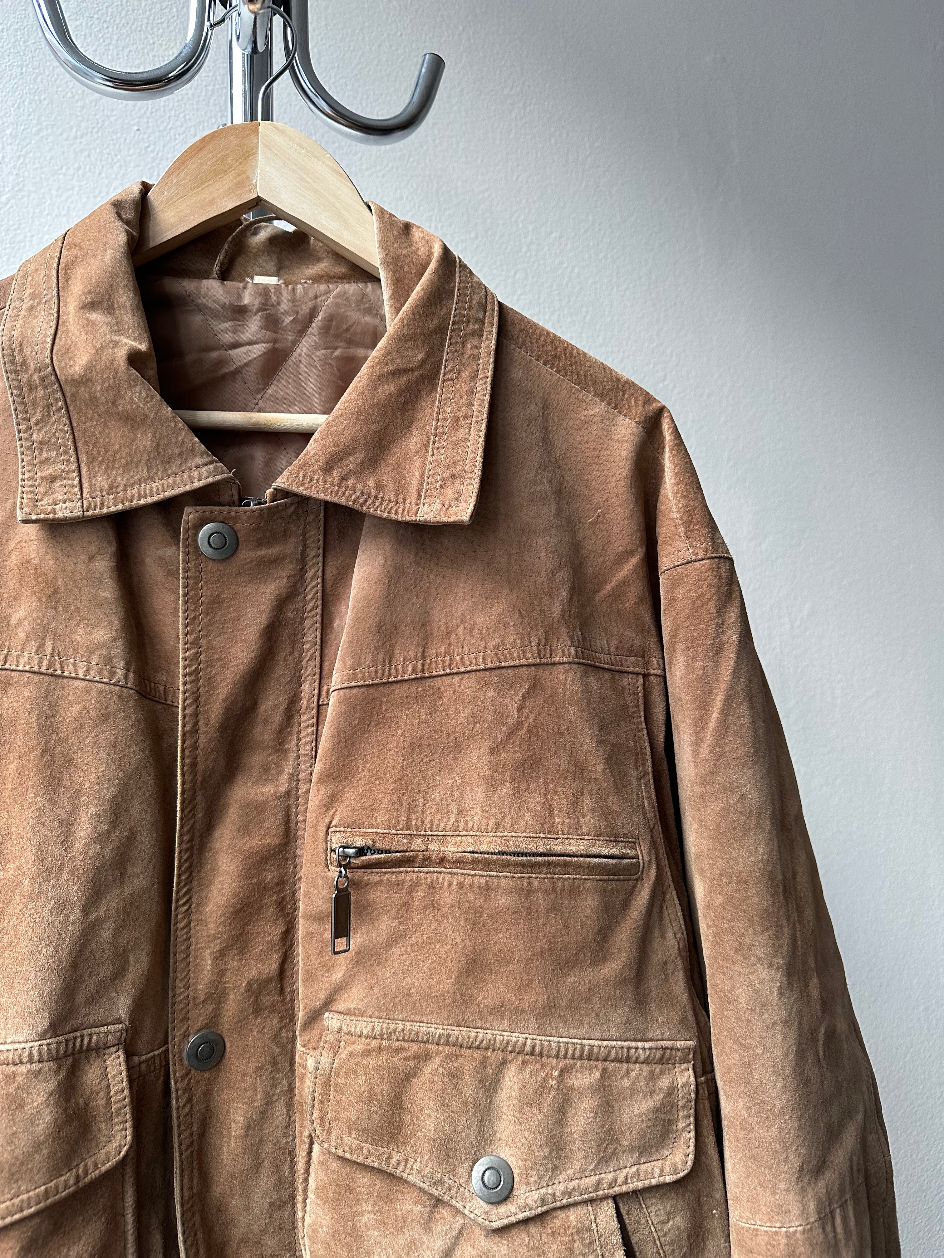 An interesting 1990s suede leather jacket with a workwear inspired design, featuring multiple pockets & a great fit