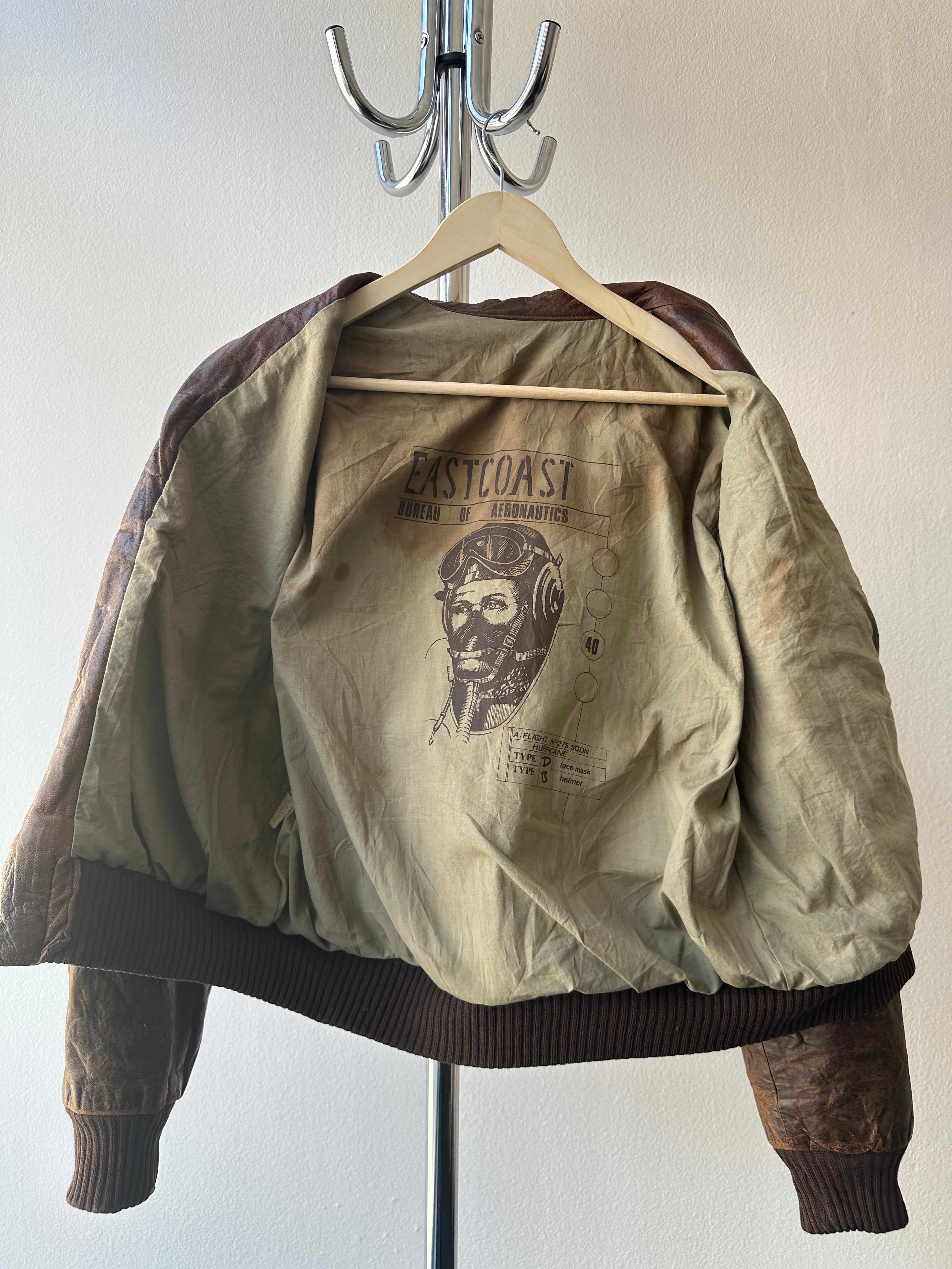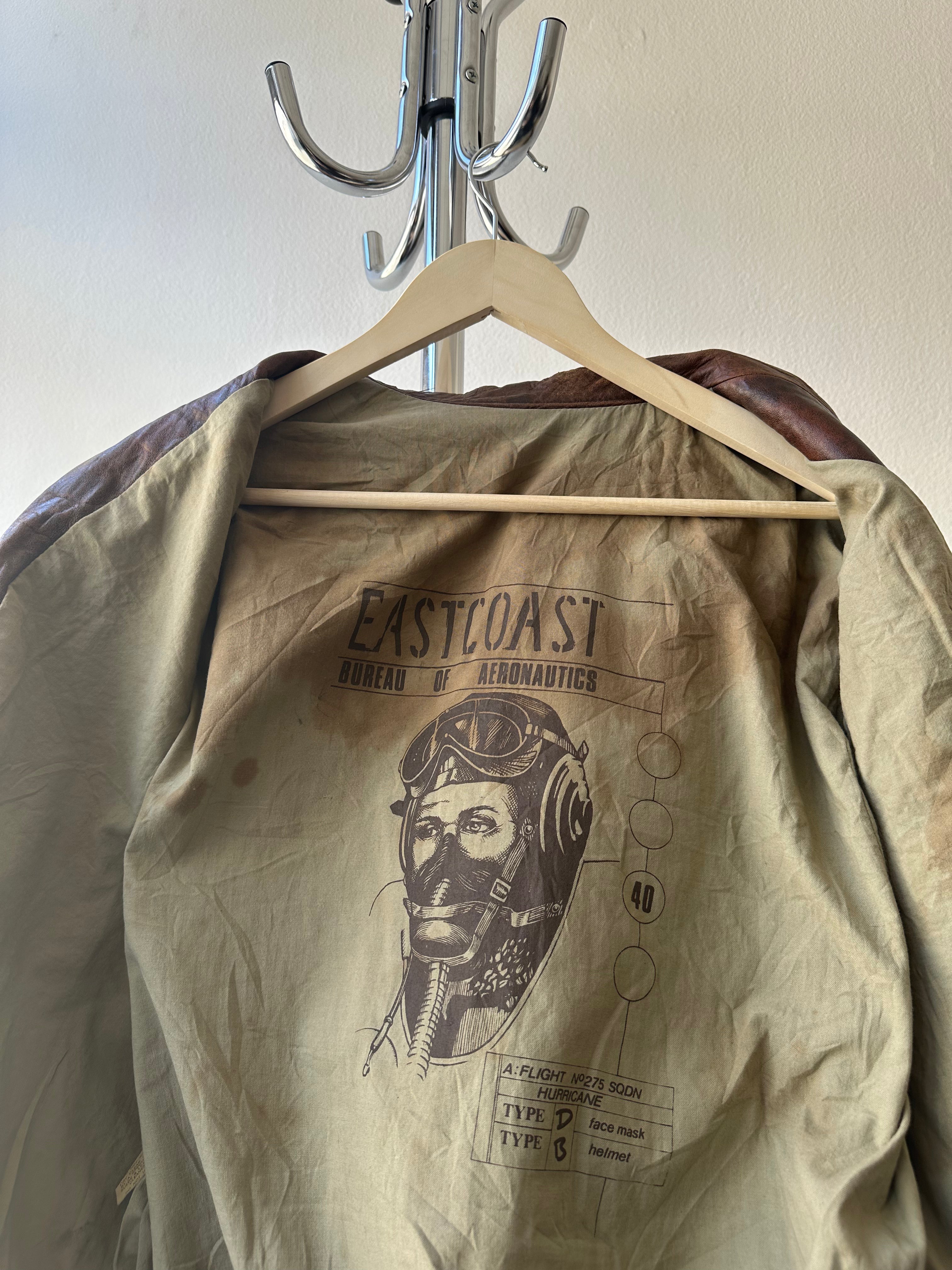 Vintage-inspired WWII-style leather bomber jacket by Eastcoast Bureau of Aeronautics. Features genuine leather with a naturally aged patina, ribbed cuffs, large flap pockets, and a unique aviation-printed lining