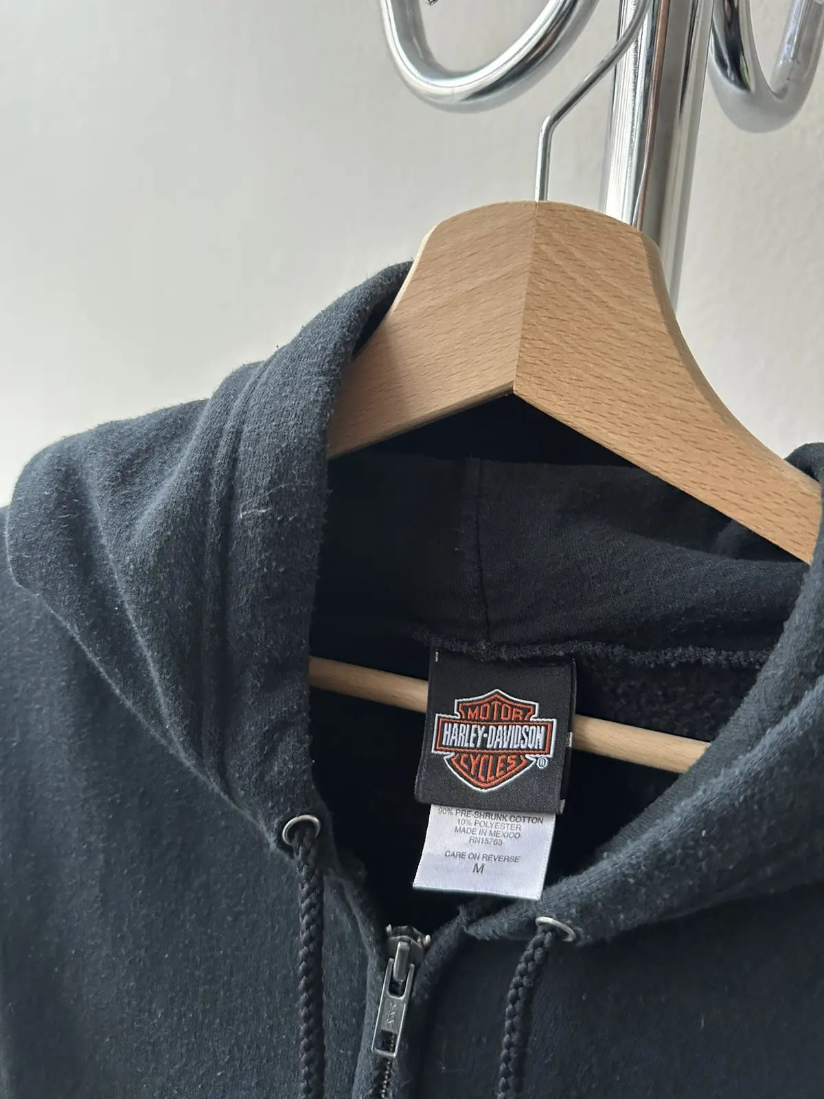 A scorched midwestern relic straight from 2002. Faded heavyweight black cotton, full zip with kangaroo pocket, bold tribal chest flame logo and insane back hit: Liberal, Kansas tornado scene with a sunflower twist. Flame sleeve prints seal the deal – gritty, graphic, and unmistakably early-2000s Harley. True size M with classic biker boxy cut. Rare as hell in this condition.